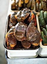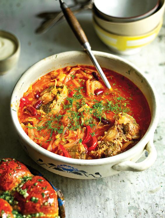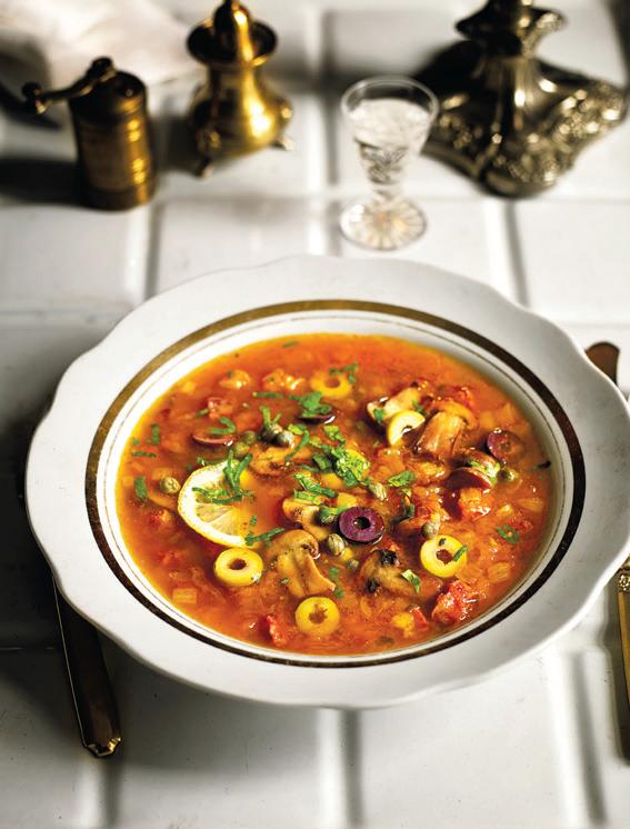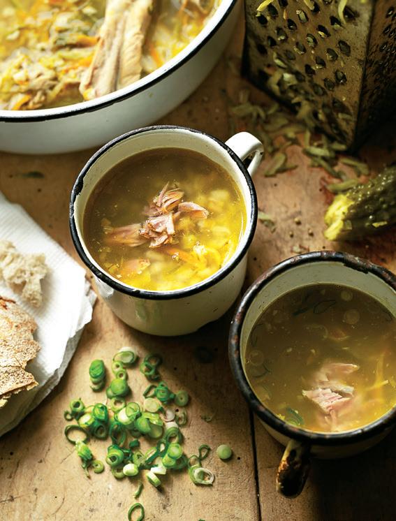 Det här är rassol’nyks (se sidan 16) nyrika bror. Konceptet är snarlikt – mustig soppa med ett syrligt stråk som skär rätt genom den kraftfulla smaken. Men att lägga till dekadenta detaljer som salami, oliver och citron tar det hela till en ny nivå. Det ska smaka rikt, kryddigt och lite galet. Min mormor brukade göra det med oxhjärta – kokat med ben från nöt och sedan tärnat i småbitar. Istället för den mer traditionella salamin tar jag ibland tärnad och stekt kryddig chorizo. Och givetvis är det så att om du inte har tid att göra buljongen, så kolla med din lokala slaktare om de säljer buljong och soppan kommer att vara klar på några minuter.