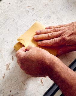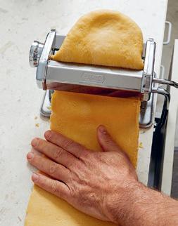 När pastadegen arbetas i maskin blir den smidig och får rätt konsistens. Elasticiteten i degen får vi genom att vrida på den mellan varje genomkörning.