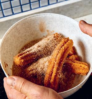 7. Spritsa ner degen direkt i kastrullen, doppa fingrarna i det kalla vattnet och nyp av degen cirka var 10:e centimeter. Fritera churrosen gyllenbruna, lyft upp med en hålslev och doppa dem sedan genast i kanelsockret. Ät som de är eller servera med lite vaniljglass.