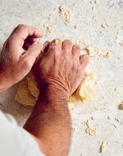 3. Knåda degen rejält tills den håller ihop. Plasta in och låt vila i kylen i minst 30 minuter.