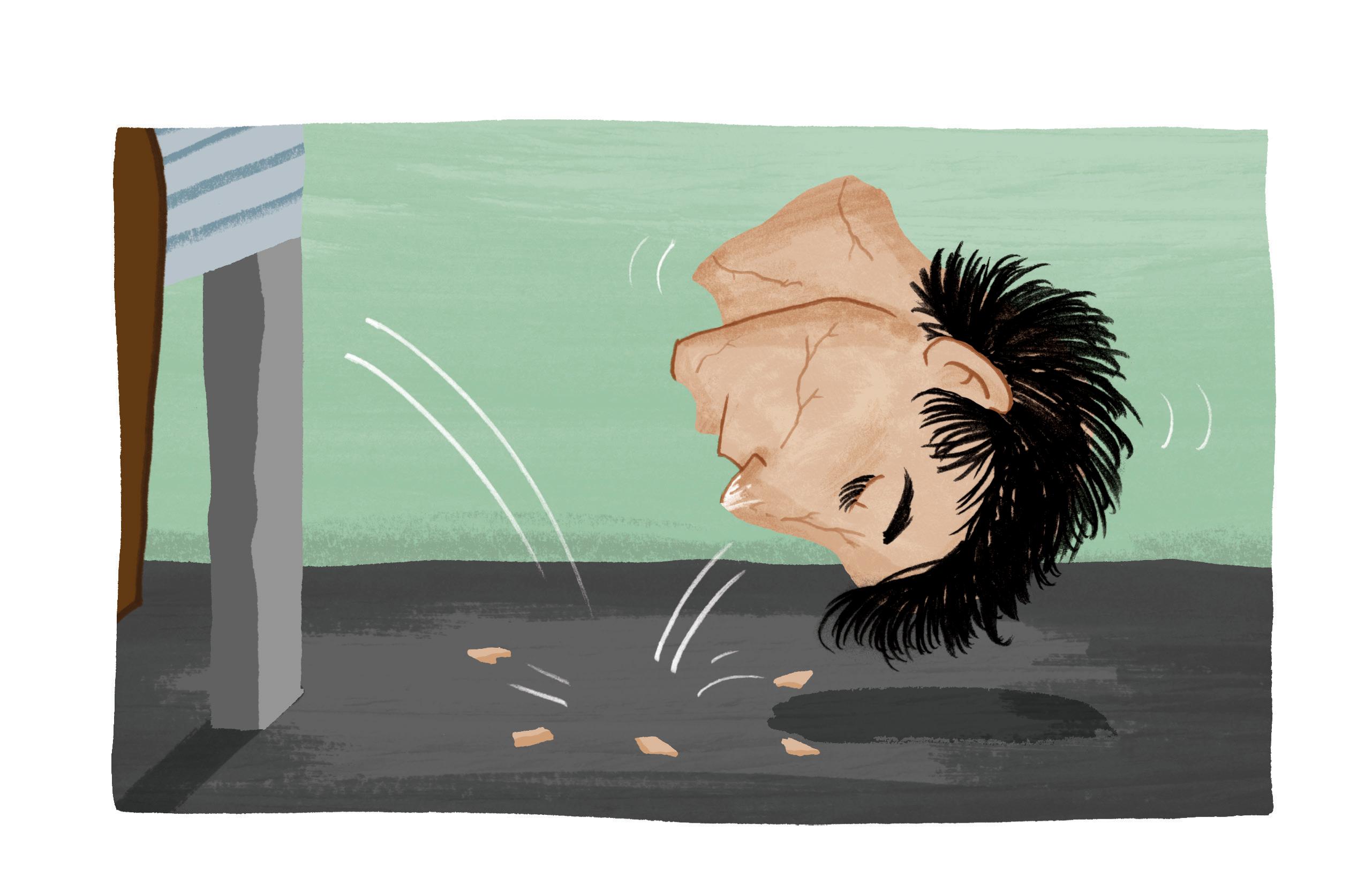 Han fick en chock när huvudet rullade av kudden och ramlade ner på betonggolvet!