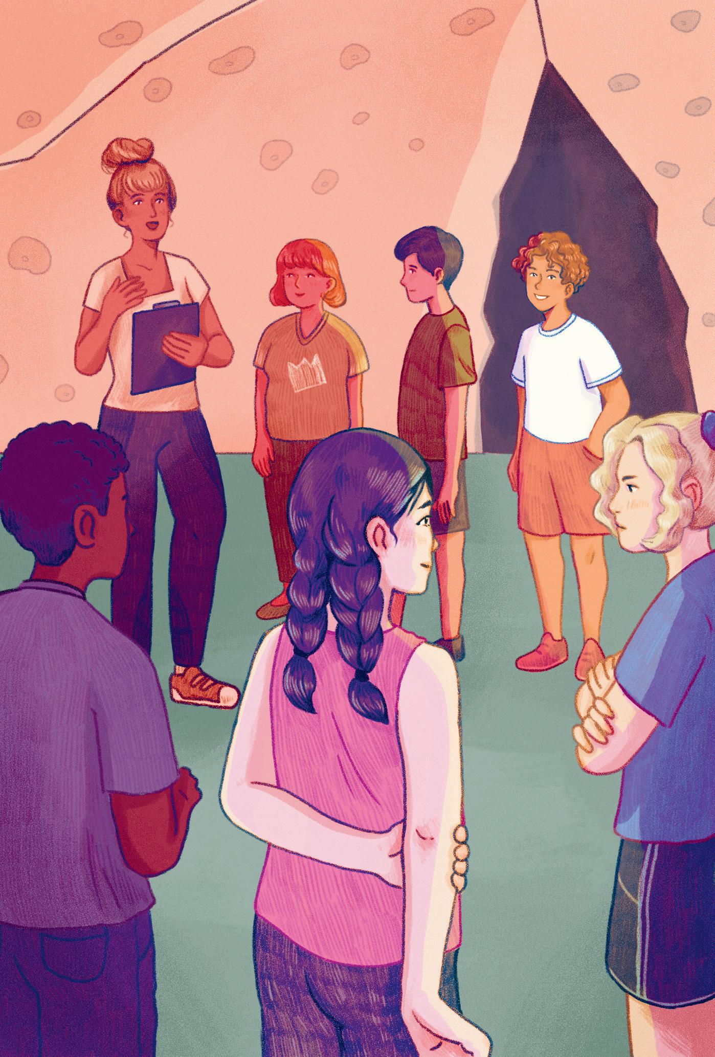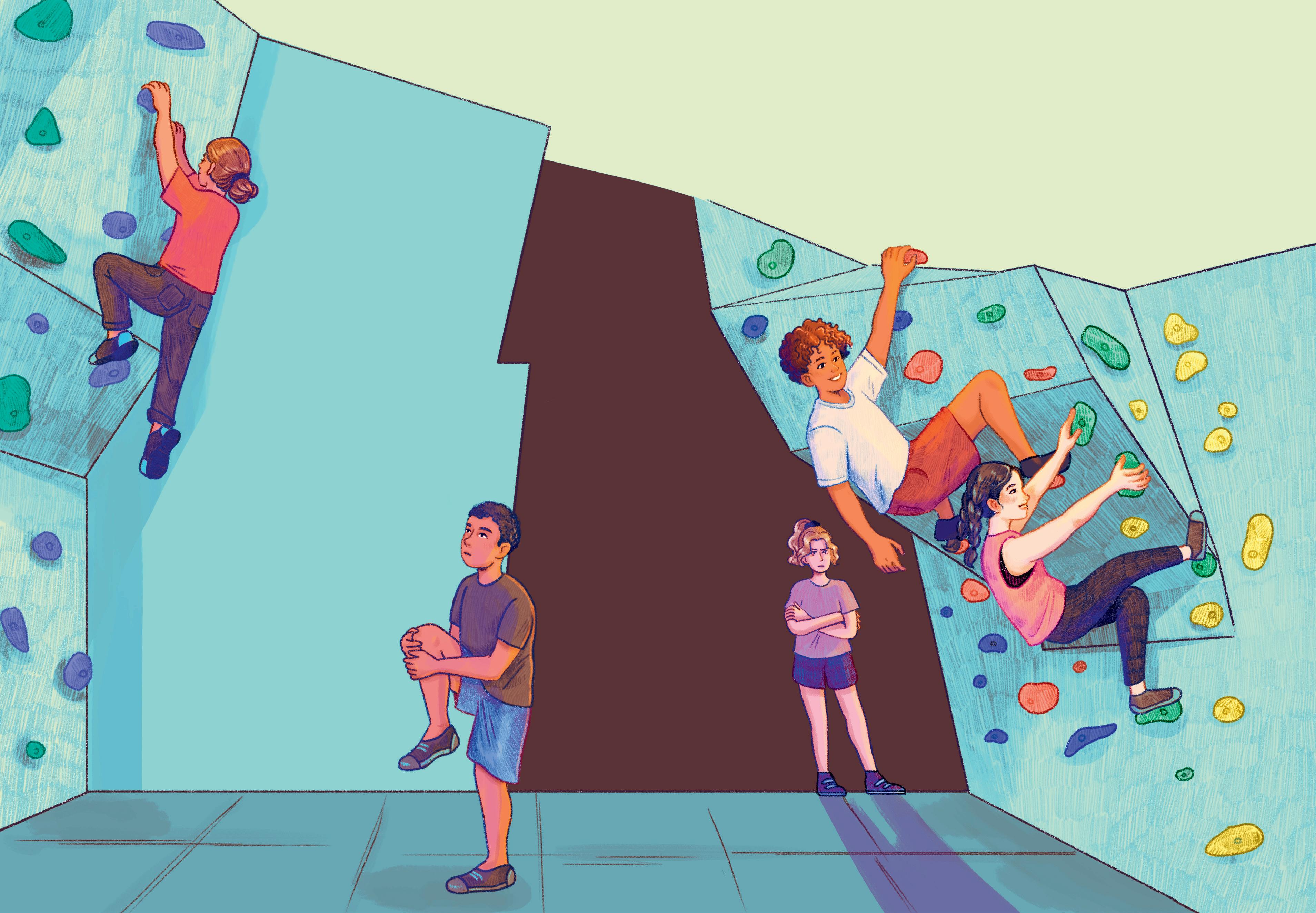 – Samling alla! Nu kör vi i gång. Snart står alla i klättergruppen runt Clara. Hon går igenom dagens klätterövningar. De verkar roliga och lite svåra. Sedan säger hon: