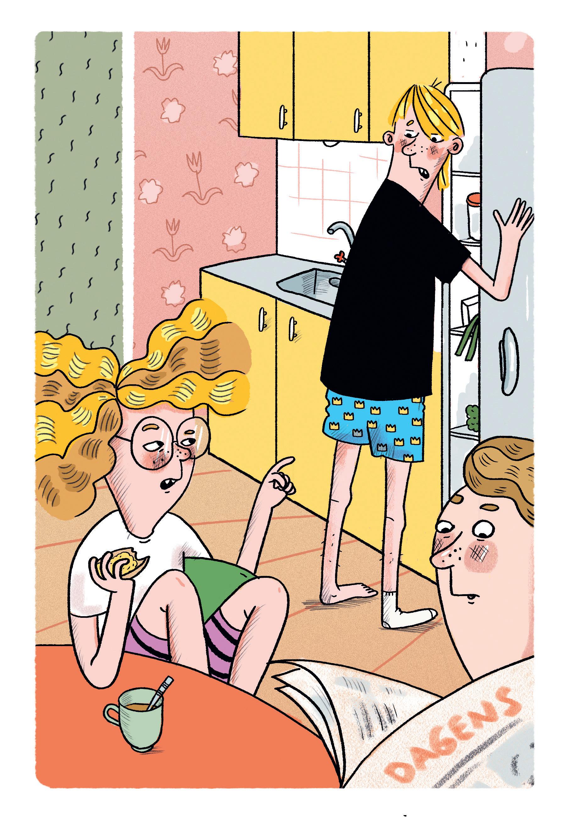 Han tar en skål med yoghurt och försvinner in till sitt rum. Det tycker Sanna är bra. Då får hon pyssla ifred.
