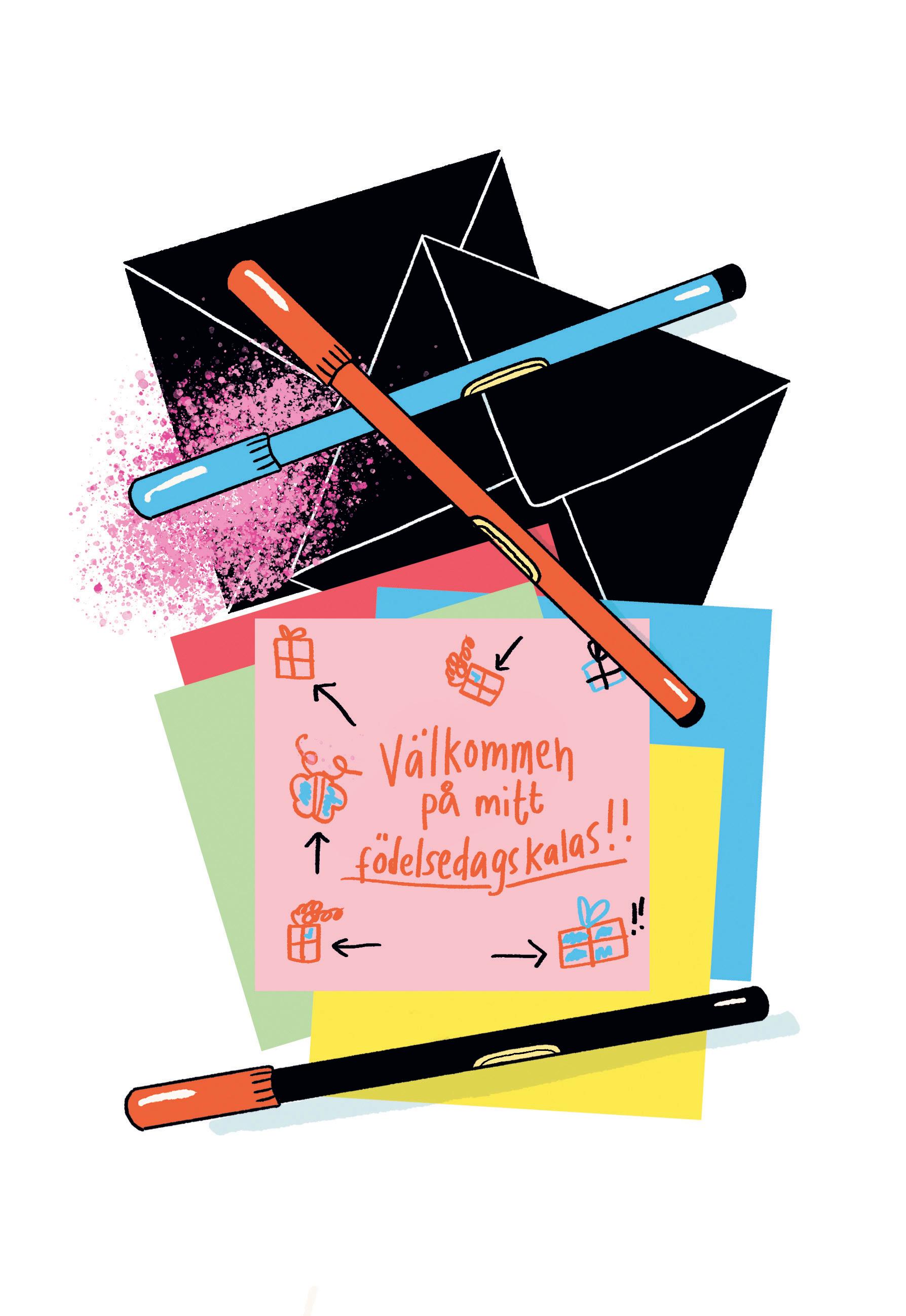 Välkommen på mitt födelsedagskalas skriver hon längst upp på varje kort. Hon stryker under ordet födelsedagskalas. Alla ska förstå att de ska ta med en present även om det var ett tag sen hon fyllde år.