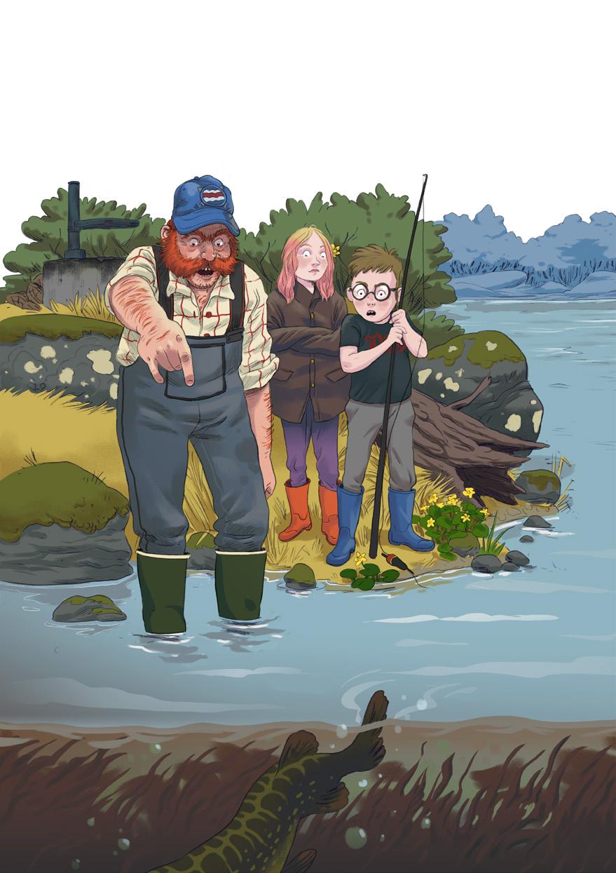”Men den drog ner på djupet och klippte till slut av linan!” sa Inge och bet ihop. Frans försökte få syn på någon gädda som kanske följde efter i vattnet. Kanadensaren gled upp på stenarna vid stranden. Josefin knäppte snabbt av sig flytvästen och hoppade ur. Frans vinglade sig fram till fören han också och klev iland. Båda sprang upp i skogen och började leta klätterträd.