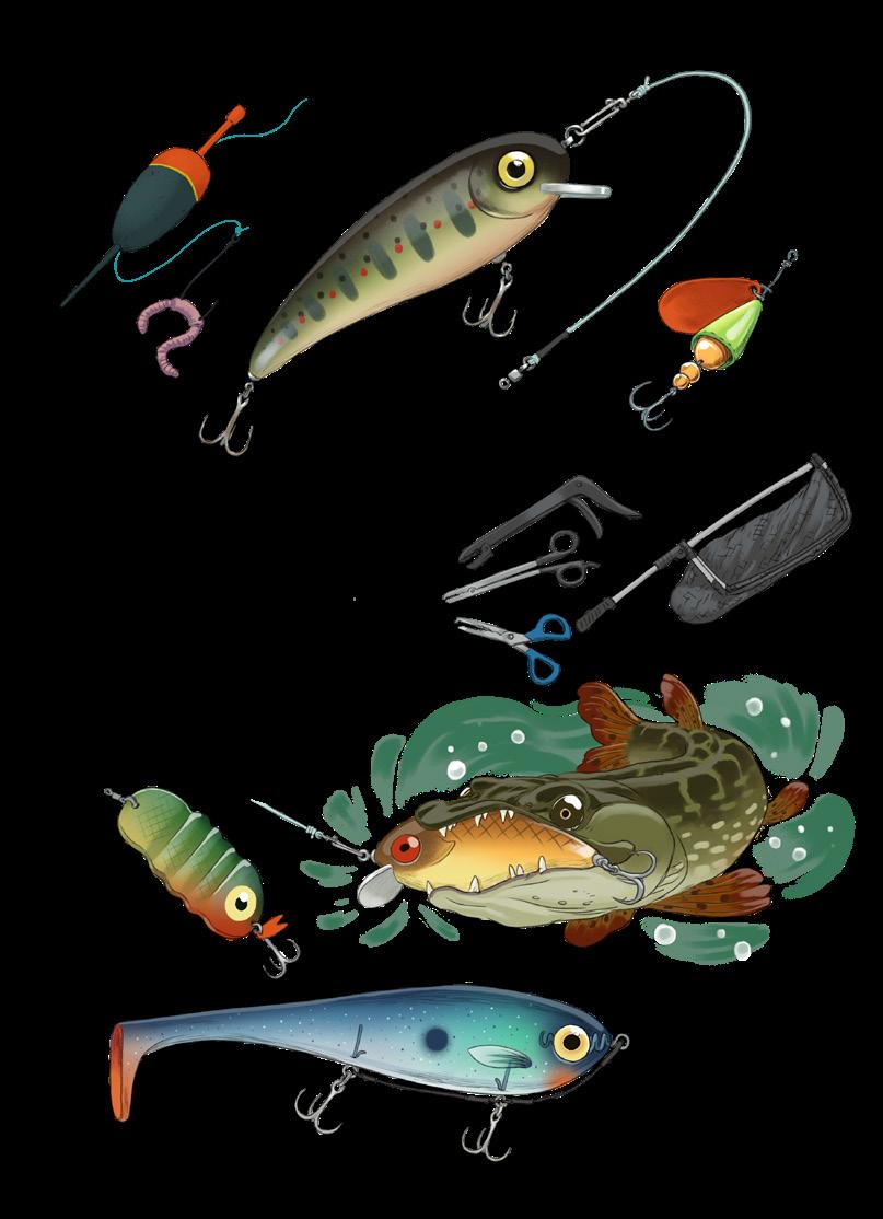 Inge tog också fram en stor draglåda och ur den ett drag som såg ut som en tjock korv. Det hade en sladdrig svans och två stora trekrokar. Draget var snorgrönt, lysande gult och eldigt orange med svarta tigerränder. ”Här Frans! Det här ska du fiska med idag”, sa Inge.