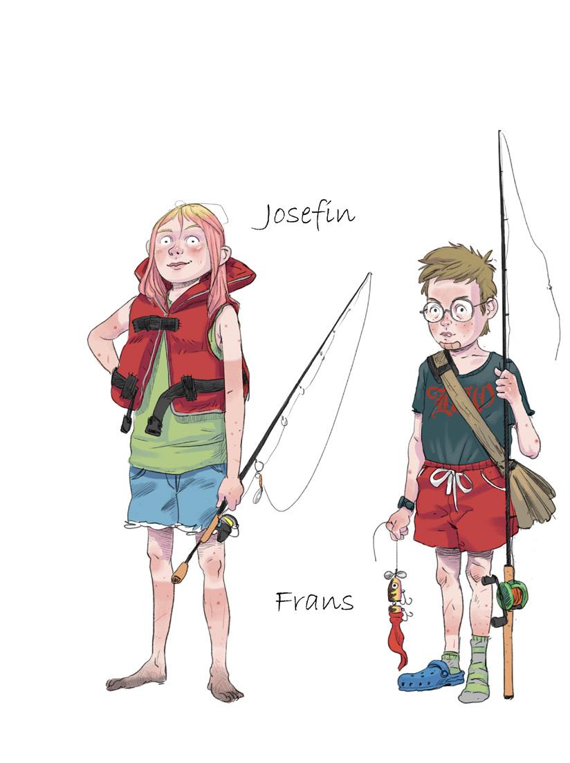 Josefin tittade upp från sitt stenletande och kastade sig också efter spöt. Frans hann före men orkade inte lyfta spöt som det ryckte och darrade i. ”Det går inte!” pep han.