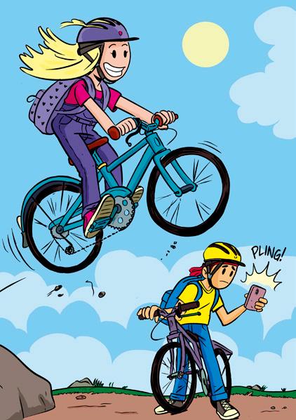Tomu bromsar in cykeln vid vägkanten. Han tar fram sin telefon och läser högt från skärmen:
