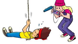 ”Okej. När jag har räknat till tre så rycker du i repet. Ett, två … Nej, stopp! Dra inte, Tomu. Mitt batteri dog, jag måste ladda telefonen innan vi kan fortsätta. Har du sett min laddsladd?”