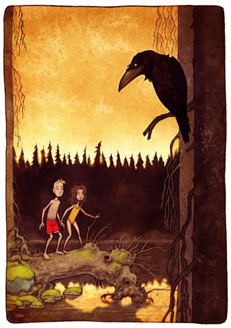 Vi stod alldeles orörliga på trädstammen. Fågeln satt stilla och tittade ner på oss med svarta pärlögon. Den kraxade en gång till. Sedan bredde den ut vingarna och flög runt sjön en gång innan den försvann över skogen.