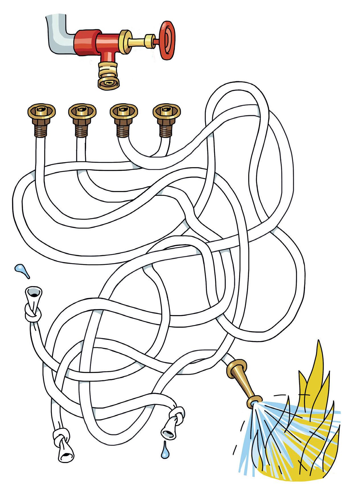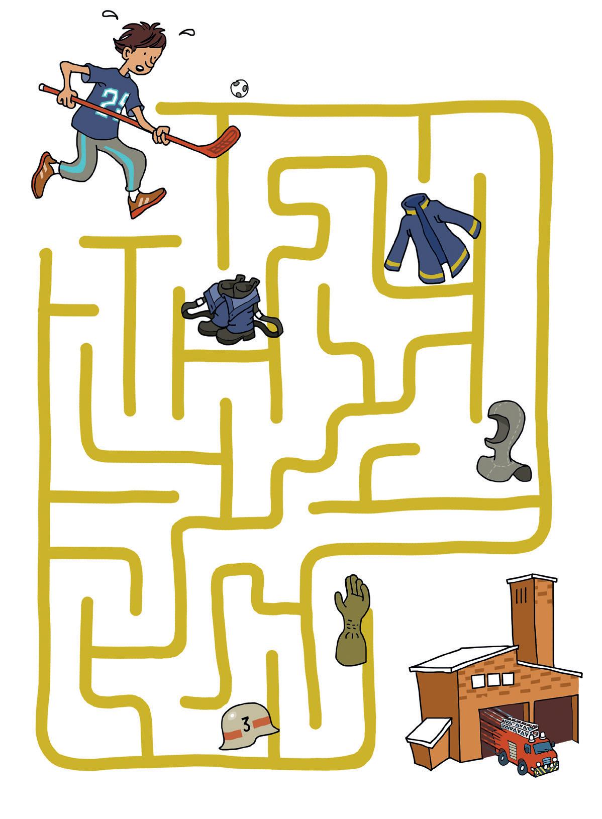 Brandmännen spelar innebandy på brandstationen. Plötsligt går larmet. Nu är det bråttom. Hjälp dem att hitta rätt väg och sin utrustning på väg till brandbilen.