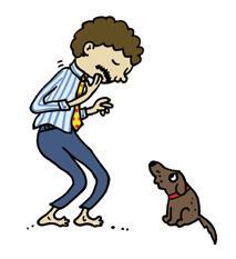 En lång stund sticker han fingrarna längre och längre ner i halsen för att spy. Men hur han än hulkar så kommer det inget kräks. Till slut ger han upp. Hunden Truls tittar nyfiket på pappa Jansson.