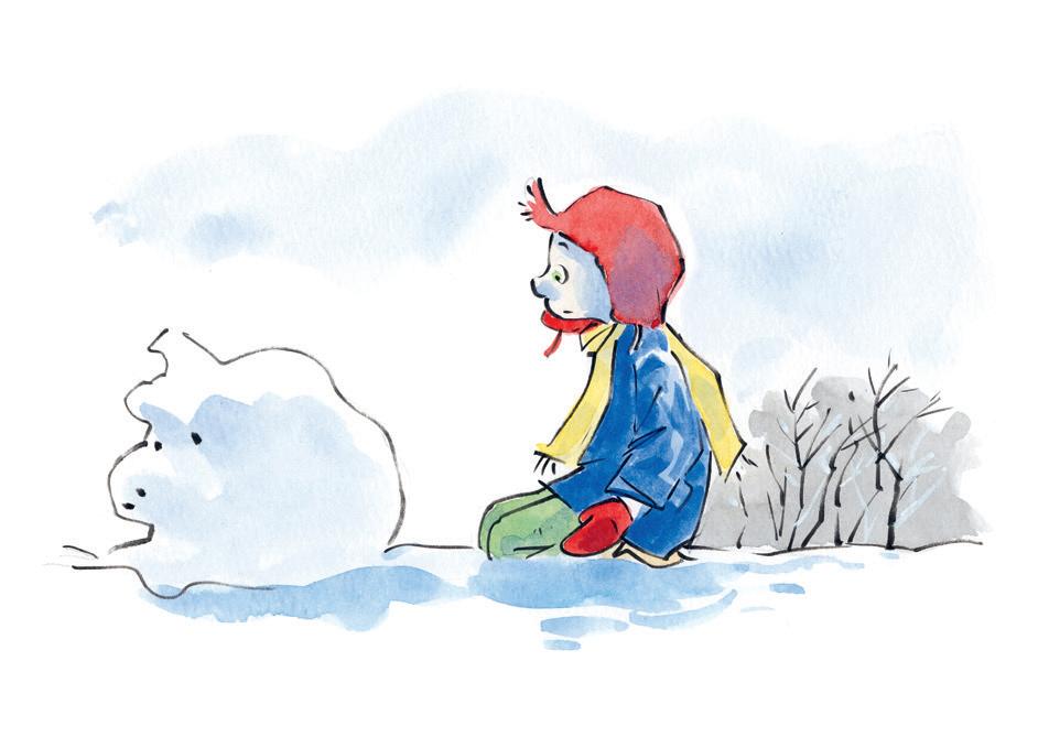 Och plötsligt var snön alldeles för vattnig. Om inte solen såg till att försvinna med detsamma skulle det bli en stor pöl av hans grisskulptur. Och det verkade solen inte bry sig om det minsta.
