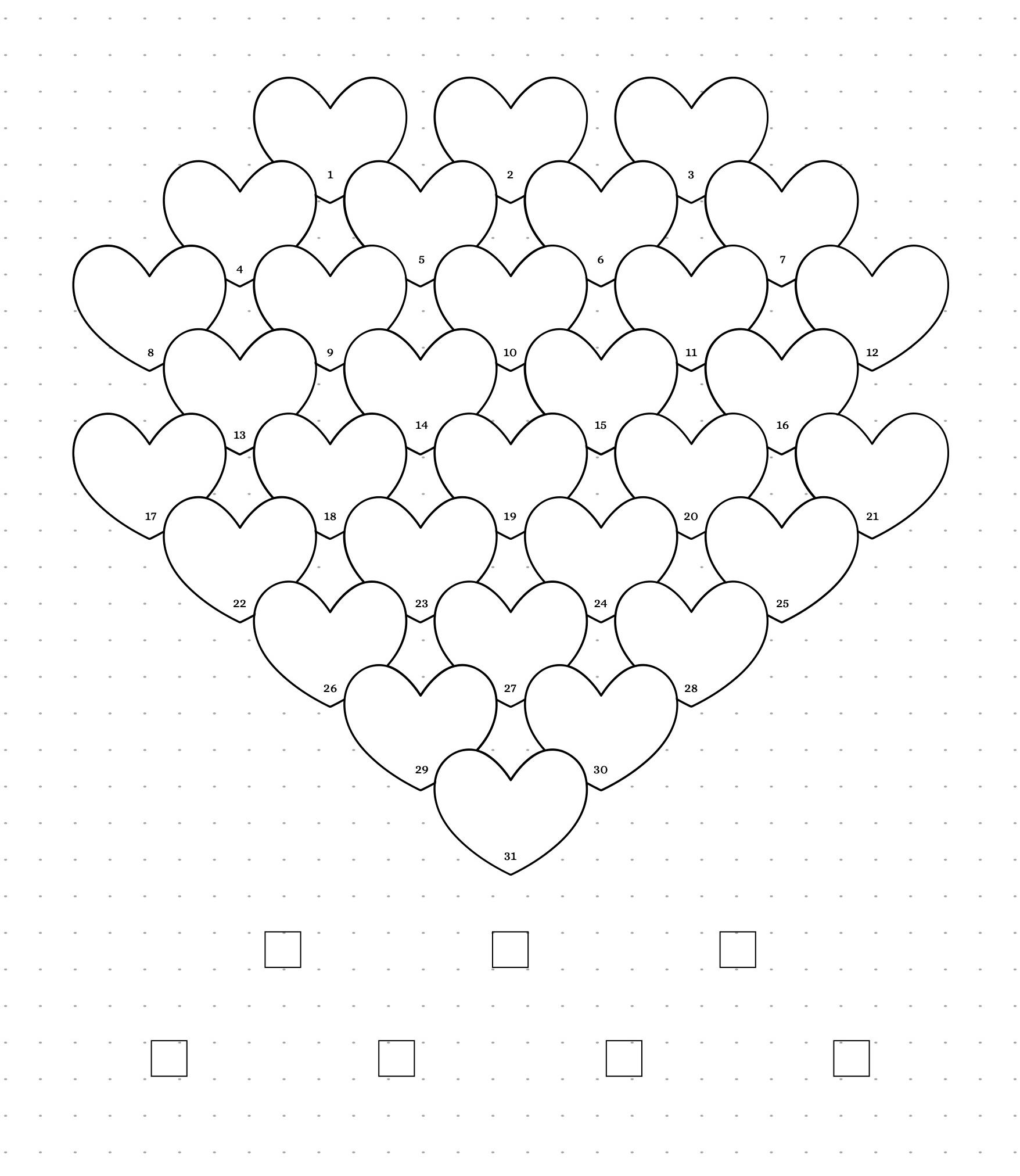SKRIV EN KÄNSLA FÖR VARJE RUTA OCH VÄLJ EN FÄRG SOM SYMBOLISERAR KÄNSLAN. FYLL SEDAN I ETT HJÄRTA OM DAGEN I EN MÅNAD MED DEN DOMINERANDE KÄNSLAN FÖR DAGEN.