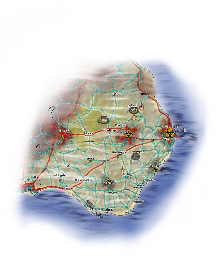 NÀr jag kommer ut pÄ vÀgen har det ljusnat lite, dÄ mÄste det nÀrma sig gryning. Skönt! Men nu dÄ? Ska jag gÄ Ät vÀnster eller höger, fortsÀtta rakt fram ⊠eller gÄ tillbaka till taket? Jag ser nÄgot lysa i ögonvrÄn och drar mig instinktivt Ät vÀnster. PÄ ena sidan vÀgen stÄr fallfÀrdiga hus, pÄ andra sidan breder tom mark ut sig, mÄste ha varit Äkrar med grödor tidigare. Jag stannar upp nÀr jag ser en skylt dÀr det stÄr MalmövÀgen. Till höger lyser ett starkt sken i horisonten, till vÀnster fortsÀtter husen i ruiner. Hur vet man vilken vÀg som Àr bÀst om man inte ens kommer ihÄg vem man Àr eller var man Àr? Det rimligaste Àr att gÄ mot ljuset, men tÀnk om dÀr Àr farligt! Den kusliga tystnaden har ersatts av mÀrkliga ljud bakom mig och frÄn ruinerna ⊠hasande, vÀsande. BÄde ljuden och ruinerna runt mig ger mig kalla kÄrar. Det Àr nÄgot som inte stÄr rÀtt till.
