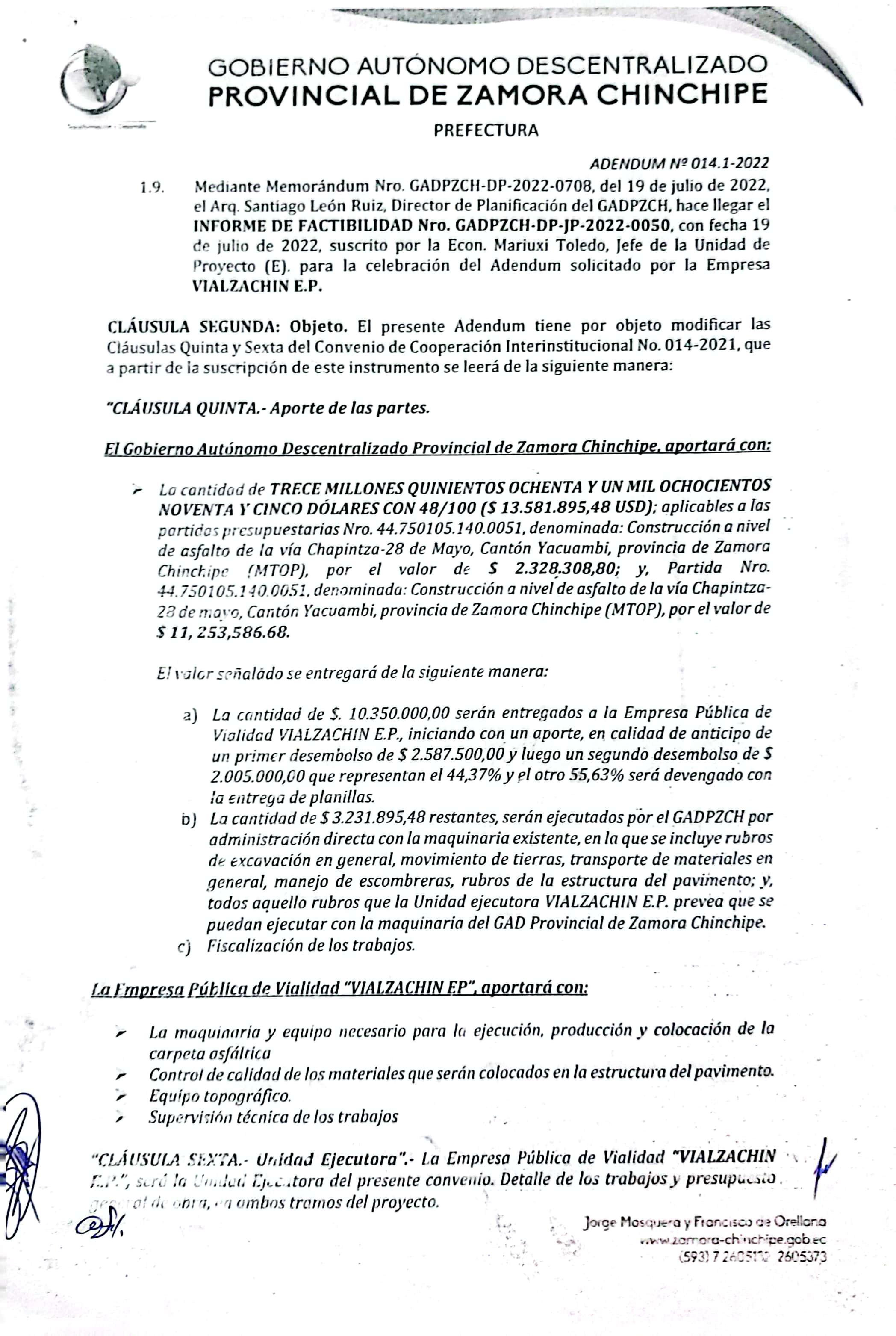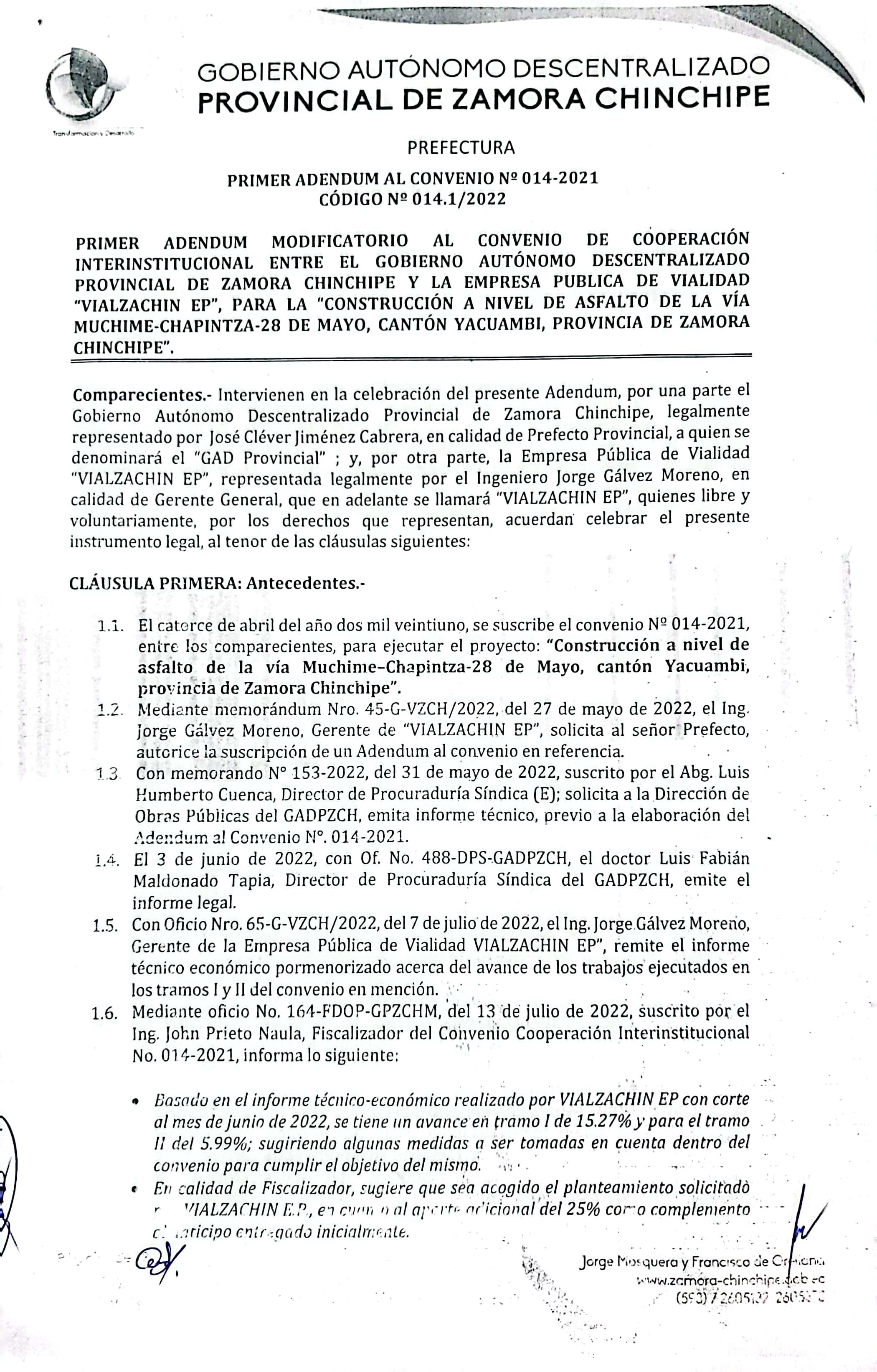 1er adendum al convenio 014.1-2021 asfalto Muchime Chapintza 28 de Mayo VIALZACHIN