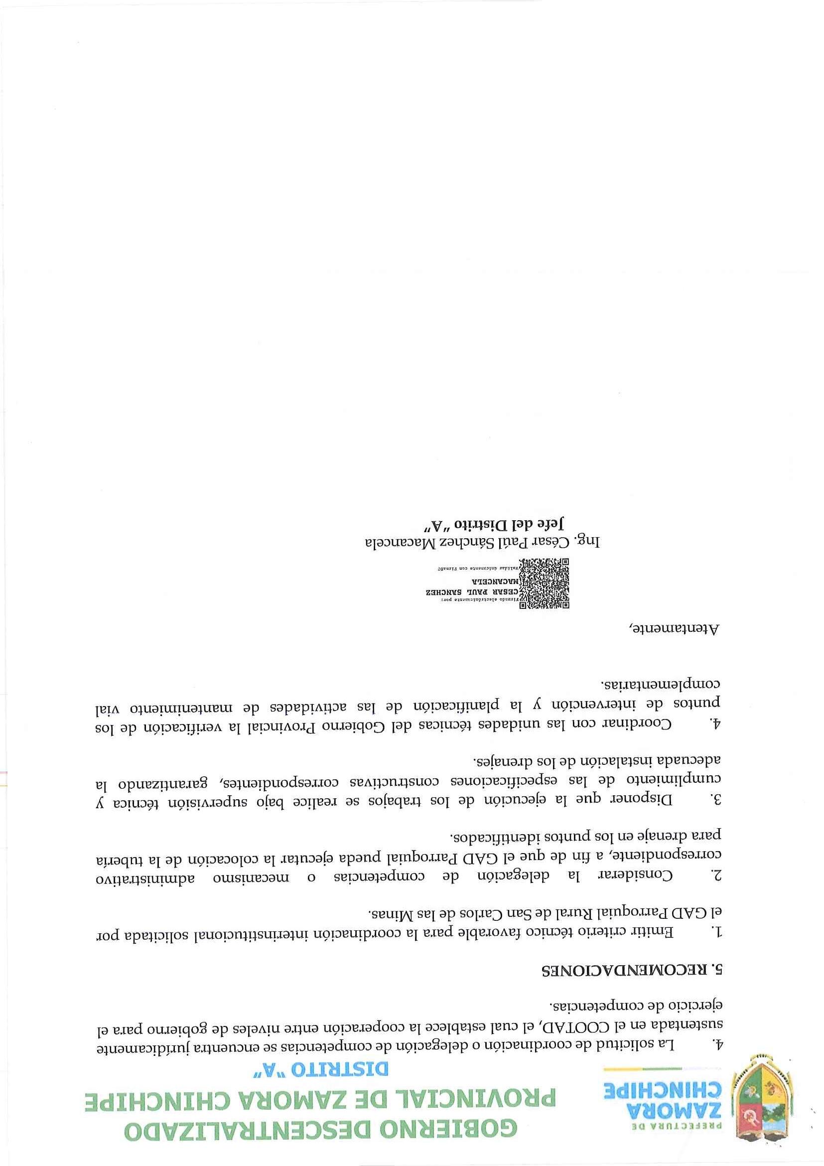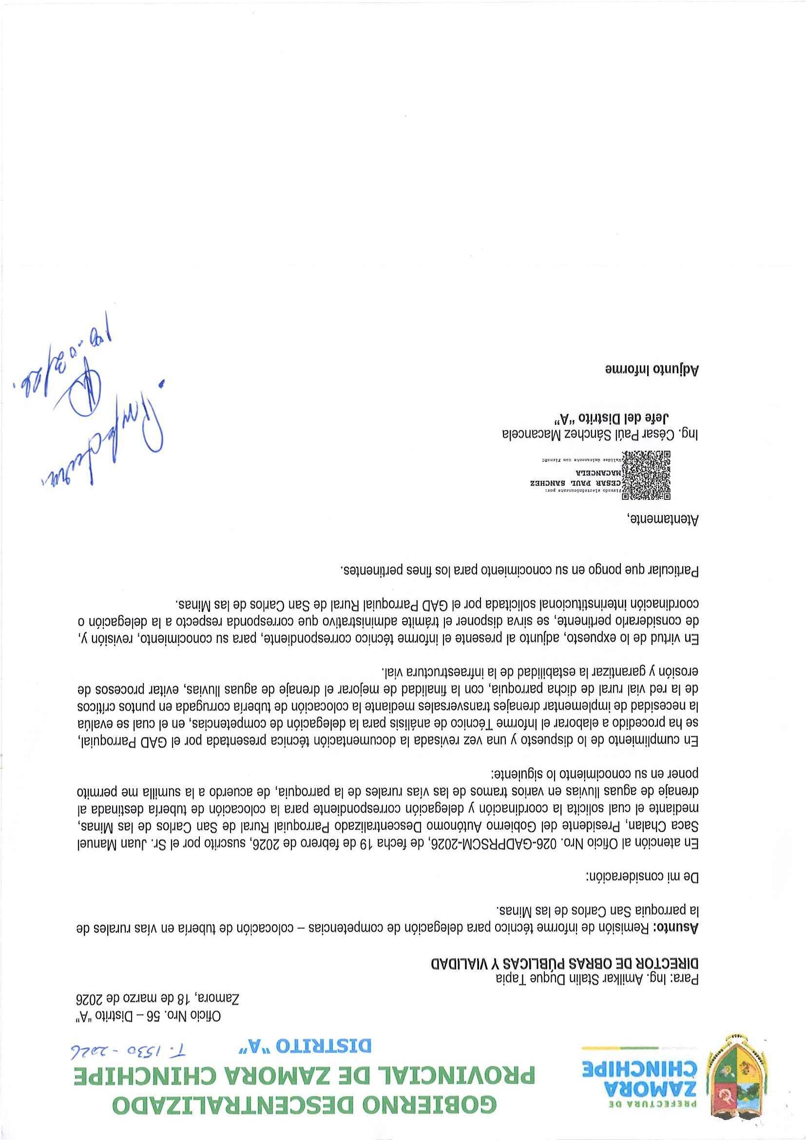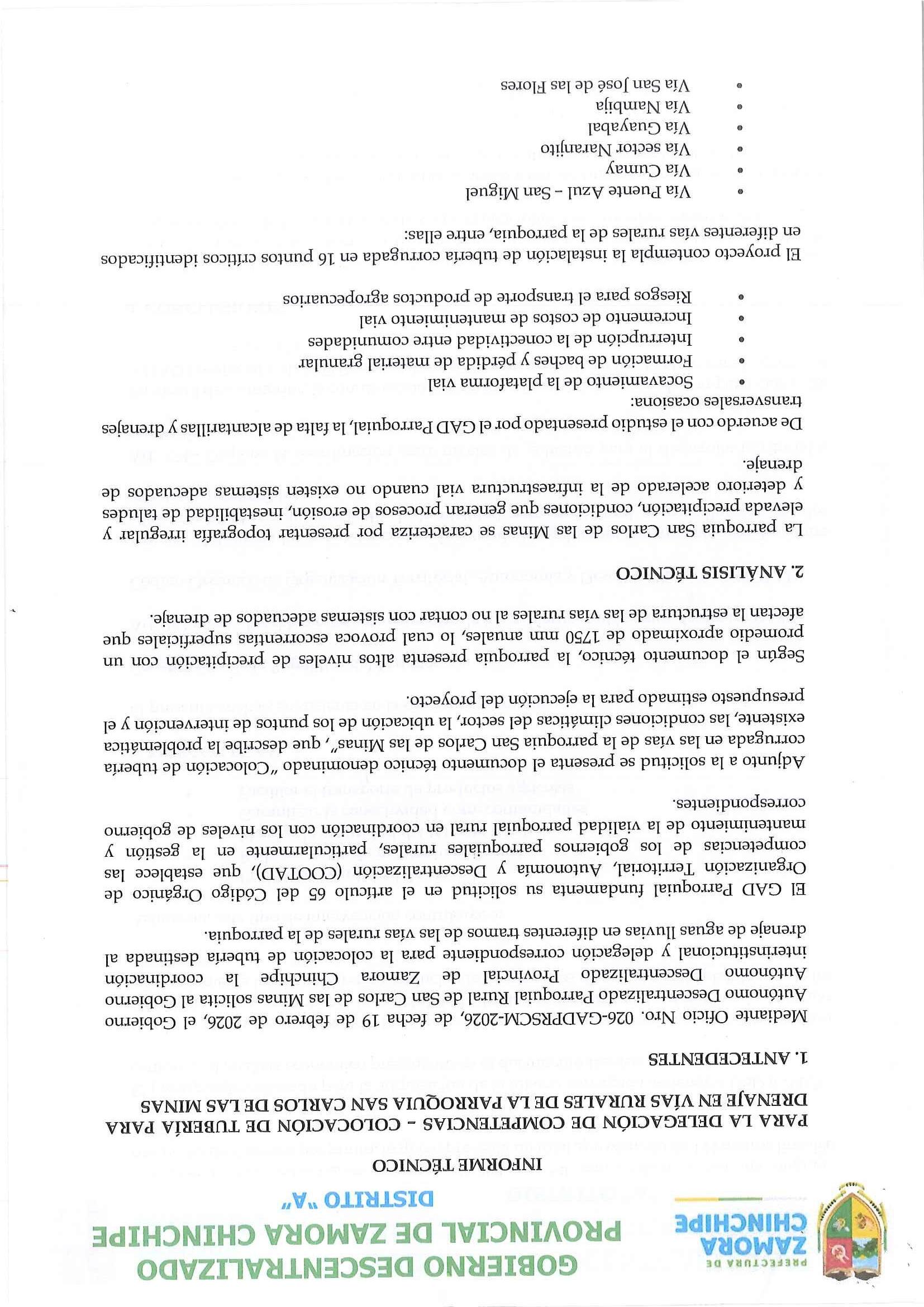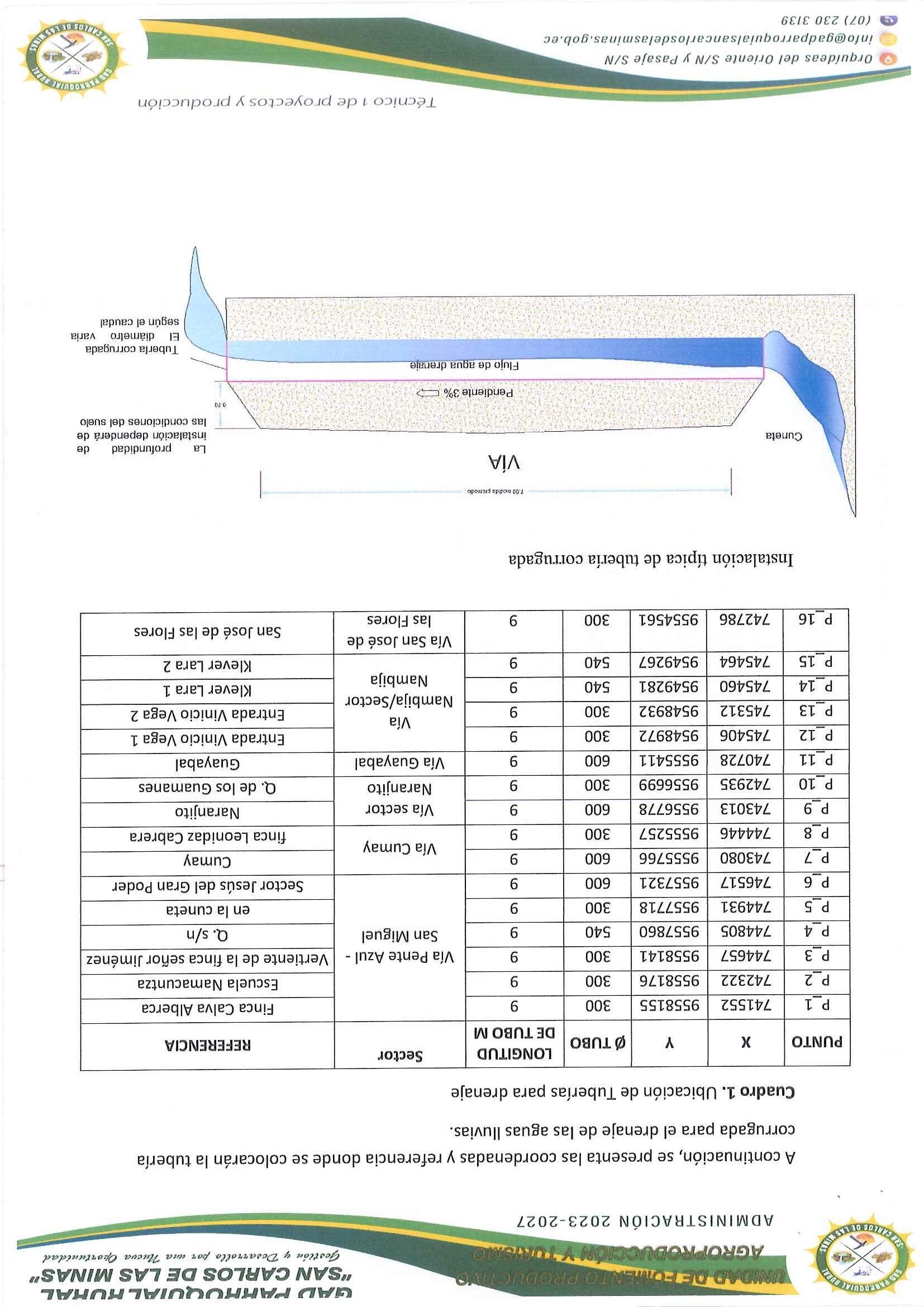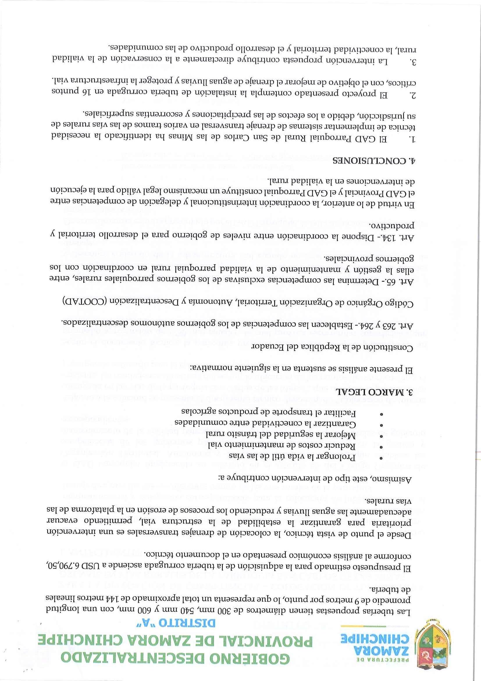 Dentro de las actividades contempladas en el referido proyecto, se incluye la implementación de obras de drenaje mediante la instalación de tubería transversal en las vías de acceso a los barrios de la parroquia, con el fin de asegurar el adecuado desalojo de aguas superficiales y pluviales, evitando el deterioro de la infraestructura vial.