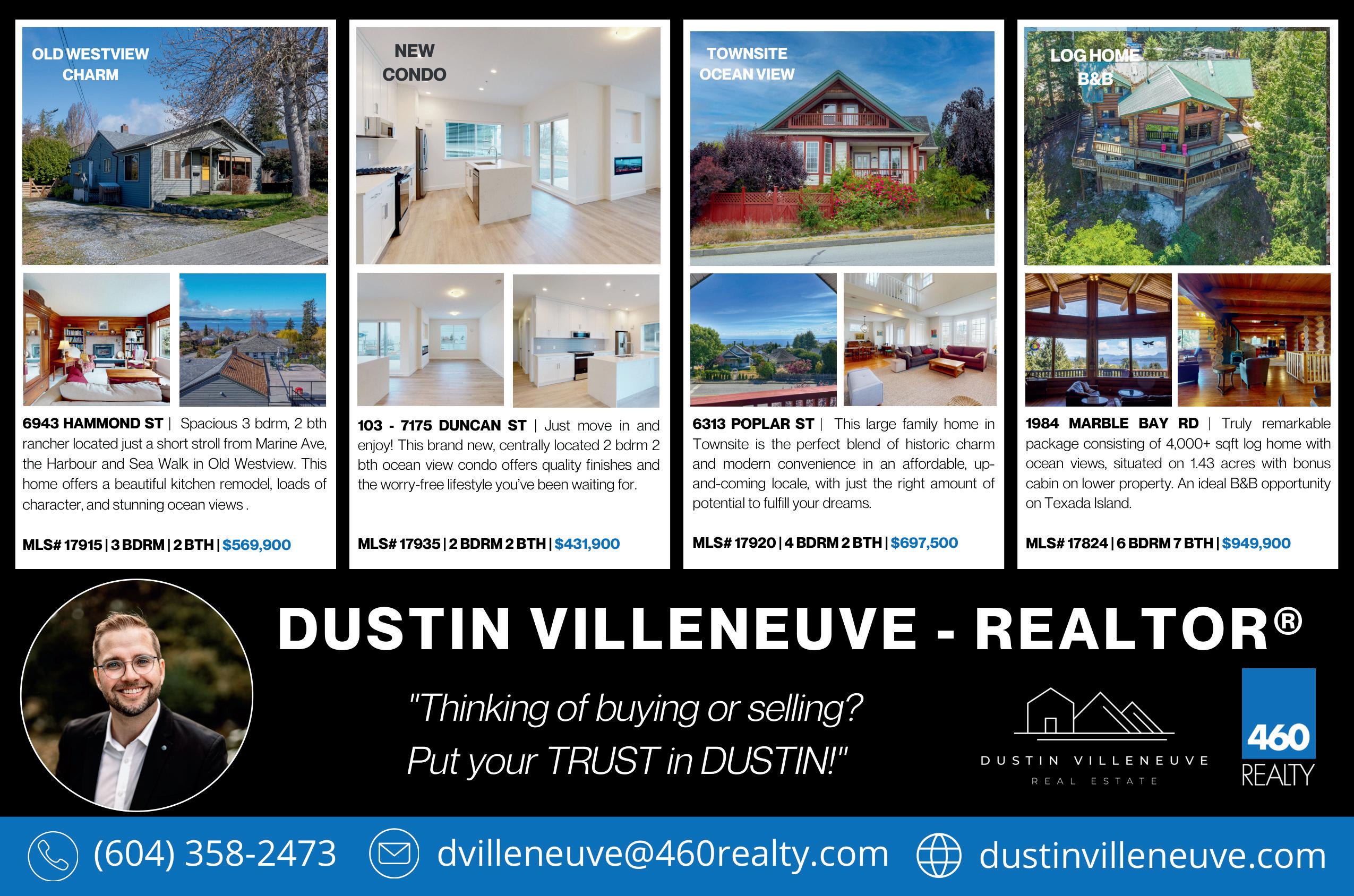 CALL TODAY FOR A SHOWING not look your best?” billbailey.ca PROFESSIONAL PHOTOGRAPHY VIRTUAL TOURS FLOOR PLANS AND MORE ... 6618 DRAKE STREET $579,900 3 BEDS • 2 BATH Bright, cute and affordable home in a great neighbourhood. 3465 OAK STREET $1,500,000 2 BEDS • 2 BATH • TEXADA ISLAND Two fully-refurbished mobile homes and two equally cute , newly built homes. 6929 RETASKIT CRT $1,388.800 5 BEDS • 4 BATH Custom, executive-style home with ocean views. 4893 FERNWOOD AVENUE $399,900 LARGE CENTRAL LOT Level lot located within walking distance to all amenities. Great development potential. LOT 1, 2, 3 MARINE AVENUE $1,249,000 TOWNSITE LOTS Prime development property in the heart of Powell River’s ‘Townsite Business Area’. LOT 3 EAGLE RIDGE PLAVE $329,900 OCEANVIEW BUILDING LOT Recent subdivision that is largely built out with gorgeous new homes. 7015 HAZELTON STREET $639,900 3 BEDS • 2 BATH Expansive ocean view with a nicely finished in-law suite in the basement. 3-4500 CLARIDGE ROAD $194,900 3 BEDS • 1 BATH Super cute, bright and fully-updated mobile home in a quiet park. 6912 GERRARD STREET $749,900 3 BEDS • 2 BATH Absolutely charming ocean-view home on a large lot with several private patios. 4426 WESTVIEW AVENUE $399,900 LOT IN HEART OF WESTVIEW Stunning ocean views from the heart of Powell River’s ‘Downtown Marine Avenue’. For all your electrical needs RESIDENTIAL AND COMMERCIAL Proudly serving the people of Powell River and the qathet Regional District 250 997 1694 murphy.electrical.pr@gmail.com Complete virtual marketing package, FREE for every listing, includes; 3D model, virtual tour, floor plans and photos Has it been a while since you bought or sold Real Estate? Are you looking for your first home? I am personally available day or night, before, during and after the sale with answers and solutions to whatever comes up. MIKE KABAN CALL OR TEXT ANYTIME 604.483.5111 ... I have time for you Do you want a market evaluation of your home or access to new listings every day? No obligation, all for free! I can help, call or text anytime. REAL ESTATE MAGAZINE MAY 2024 | 7