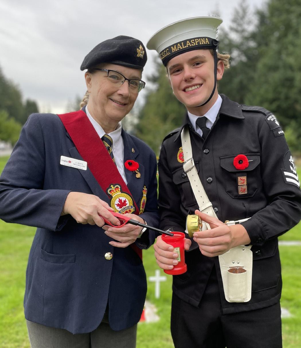 Former Powell River mayor and retired Royal Canadian Navy captain Stewart Alsgard did the honours of pinning poppies onto lapels, with local poppy campaign committee member Chris Carnell by his side.