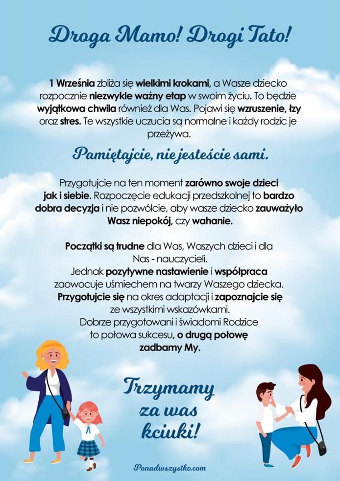 Drodzy Rodzice, od września Wasze dzieci będą naszymi najmłodszymi przedszkolakami – początek roku szkolnego to bardzo trudny okres dla wielu osób: dla dzieci, rodziców, a także dla nas nauczycieli: