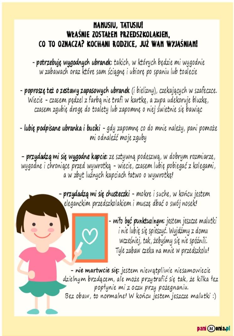 ● Zostaw w szatni coś na przebranie – wiesz, łyżka czasem tańczy w zupie, czasem żal mi zostawić w sali zabawki i … toaleta tak daleko wydaje się wtedy. Mamuś, wiem, że moje pójście do przedszkola przeżywasz bardziej niż ja. Jestem twoim skarbem, kruszynką, maluszkiem, żabką, księżniczką, misiaczkiem… Wiem Mamciu… Wiesz co, muszę Ci powiedzieć, że nam obojgu będzie trudno się rozstać. Ale tylko na początku, kilka dni. No może kilka, kilka. I wiesz co Mamciu? Może mi przyjść do głowy (najczęściej w przedszkolnej szatni) kurczowe trzymanie się Twojej nogi, trzymanie Twoich rąk, błaganie żebyś mnie nie zostawiała, nie porzucała, nie odchodziła beze mnie! Mamciu bądź silną kobietą – Twoja siła ducha pomoże mi oswoić się z nową sytuacją. Dokonałaś dobrego wyboru! Nie ma nic piękniejszego niż szansa mojego rozwoju wśród rówieśników. Zobaczysz, jeszcze zaskoczę Cię Mamciu wierszykiem wypowiedzianym z pamięci, piosenką zaśpiewaną dla Ciebie, rysunkiem o naszej miłości, samodzielnie ubranymi spodenkami, a może nawet uświadomię sobie, że sprzątanie po zabawie, to nie taki diabeł jak go malują. Dzięki Tobie mogę nauczyć się tego wszystkiego w przedszkolu. Tylko musisz wierzyć we mnie – będzie dobrze. Tylko bądź dzielna.