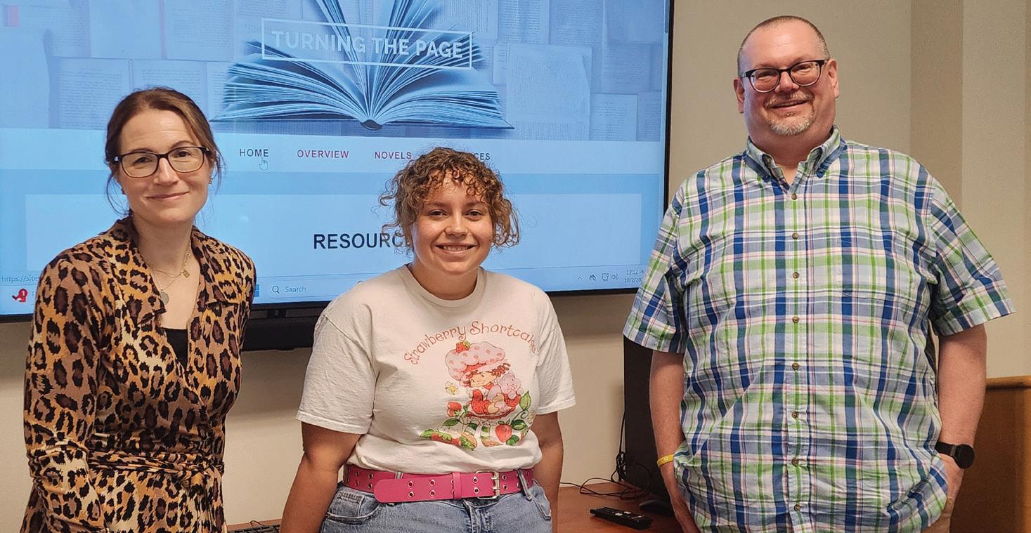 ▲ From left, Dr. Sarah Whitney, associate teaching professor of English and women’s studies; Amy Love, student in the Clinical Psychology master’s program; and Matt Ciszek, director of Lilley Library.