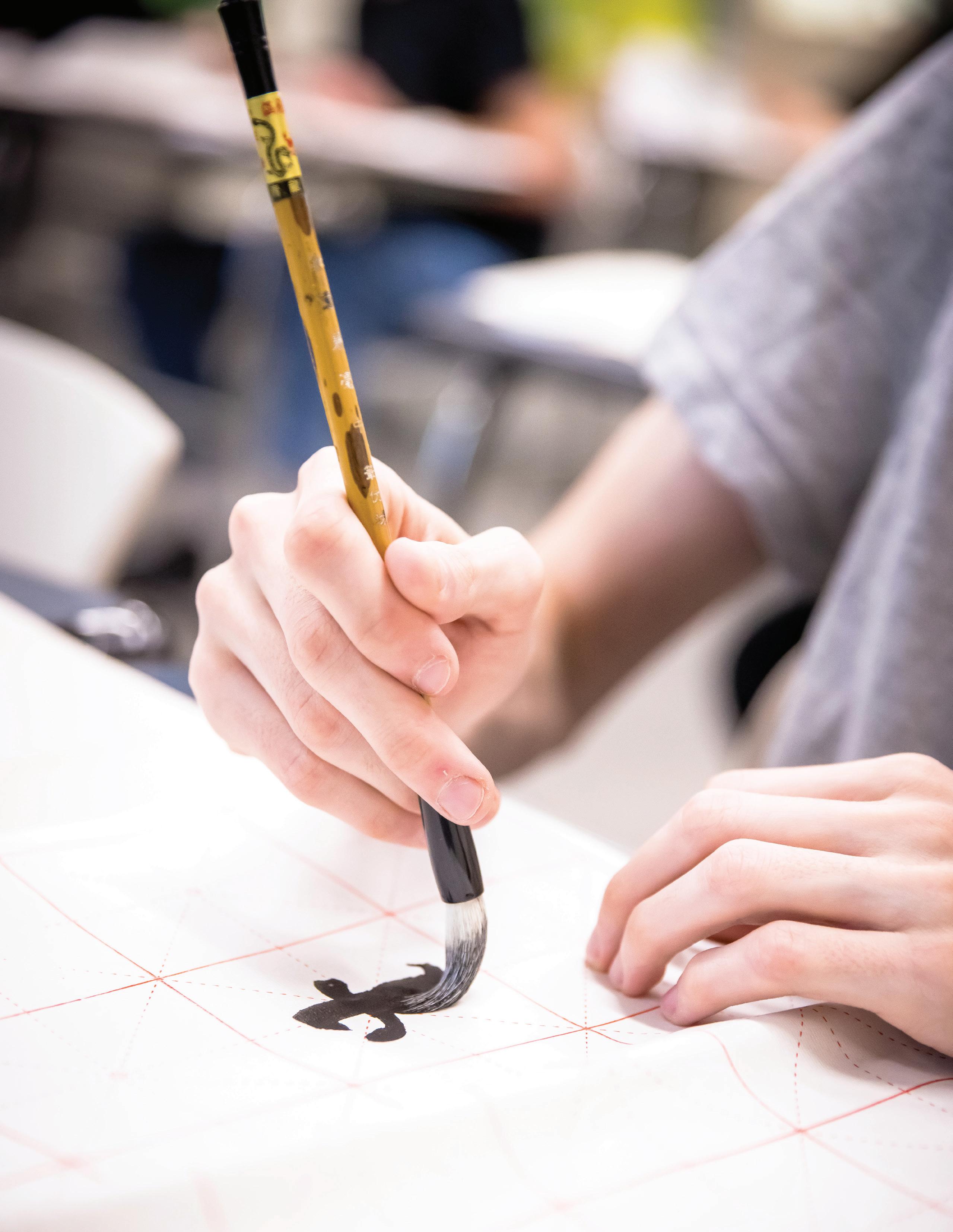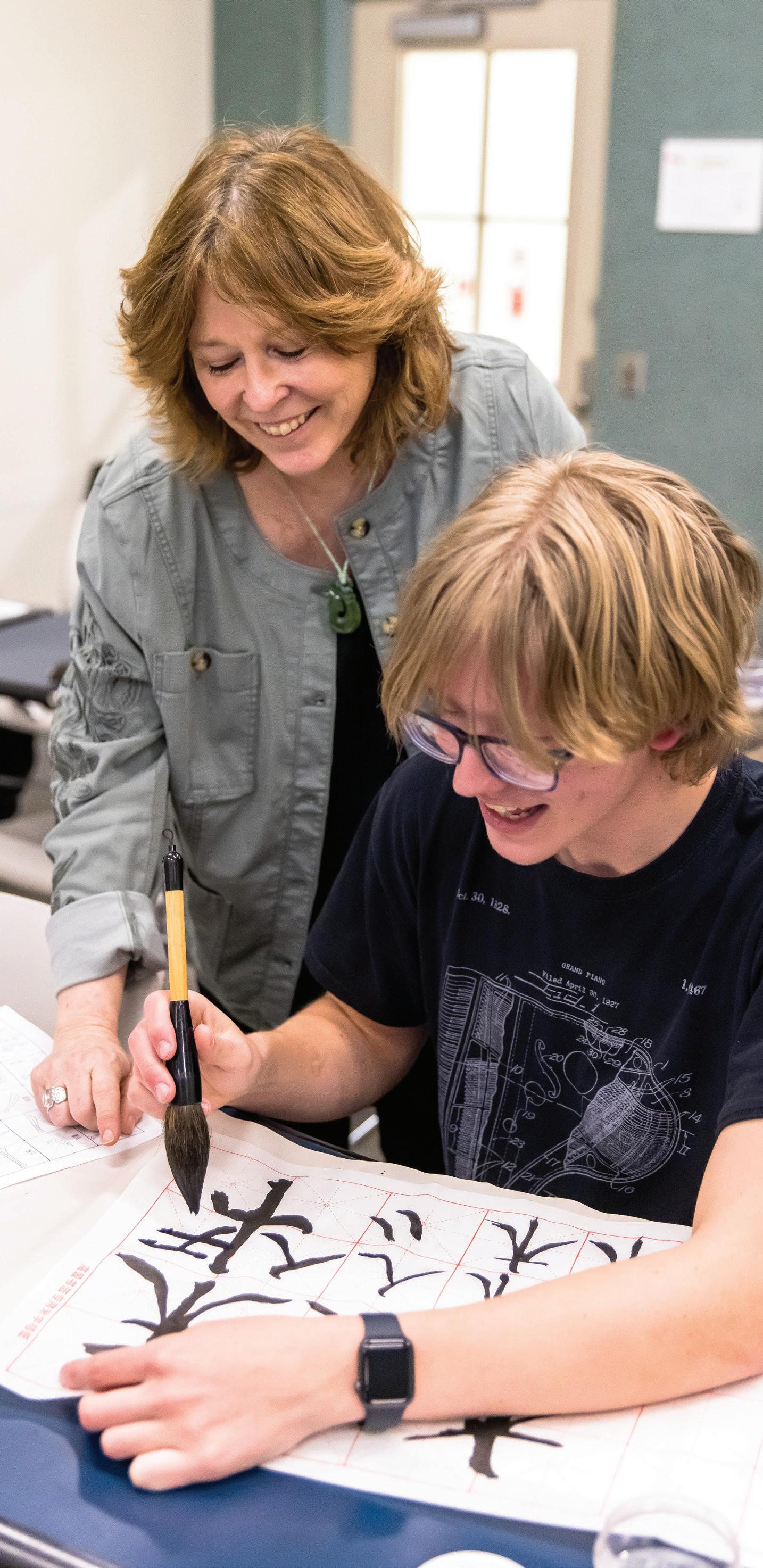 ▲ Dr. Leigh-Ann Bedal works with student Jack Norton, who is drawing Chinese characters on rice paper.