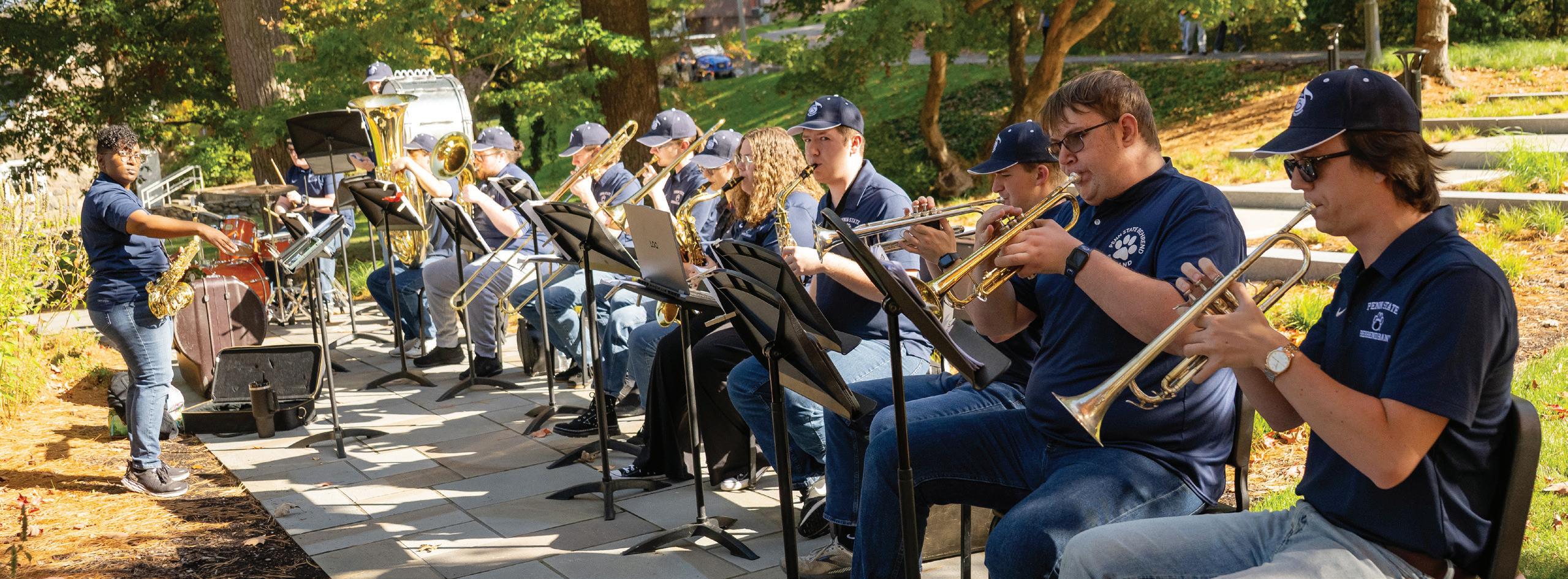 ⊳ MAKING MUSIC OUTDOORS: The Behrend Pep Band, led by Tess Jones, lecturer in music, performed during Parents, Families, and Alumni Weekend. The outdoor performance brought energy and school spirit to the popular campus event, which invites the college community to campus every fall. This year’s event is scheduled for October 16–18, 2026.