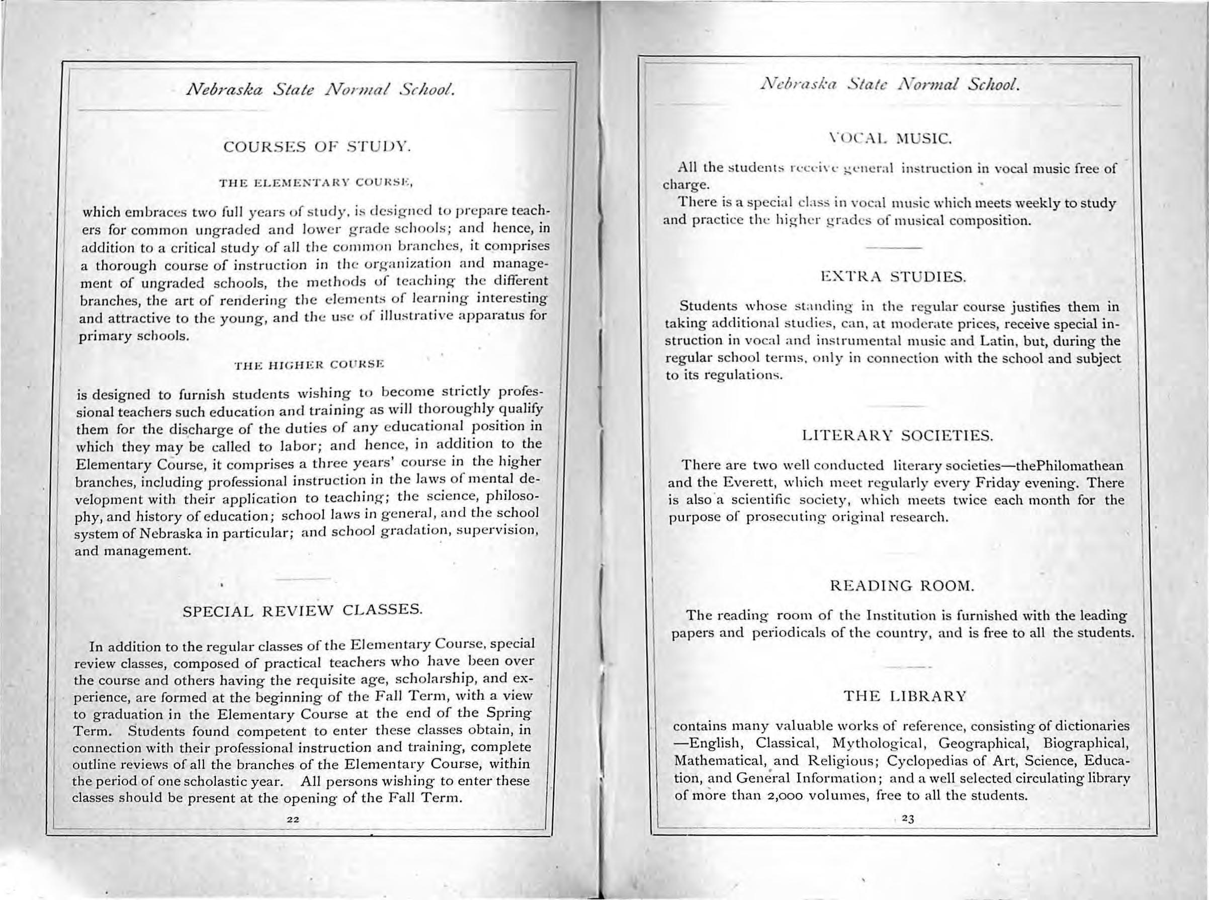 THE JI IC;I-1En CO l"I<SE is design ed to furni sh s tud ents wi s hin g to beco me s tri c tl y pmfessional t eac hers such ed u cation and trainin g as wi ll th oroug hly qua lify th em for th e di sc h arge of th e duties of a ny <: clu cat io nal posit ion in which th ey may be cal led to l abo r; a nd h en ce, in add iti on to th e Elem e nta ry Course, it co mpri ses a three yea rs' co urse in th e higher bra nch es, includin g profe ss iona l in s tru c ti on in th e laws of me ntal deve lop me nt with th e ir a ppli ca ti on to t eac hin .c:·; th e sc ien ce, philo sophy, a nd hi sto ry of e du catio n; sc h oo l Ja ws in gene ral , and th e sc h oo l s ystem of Ne bras ka in particul a r; and sc h oo l gr acl:lti on, superv isio n. an d man age men t.