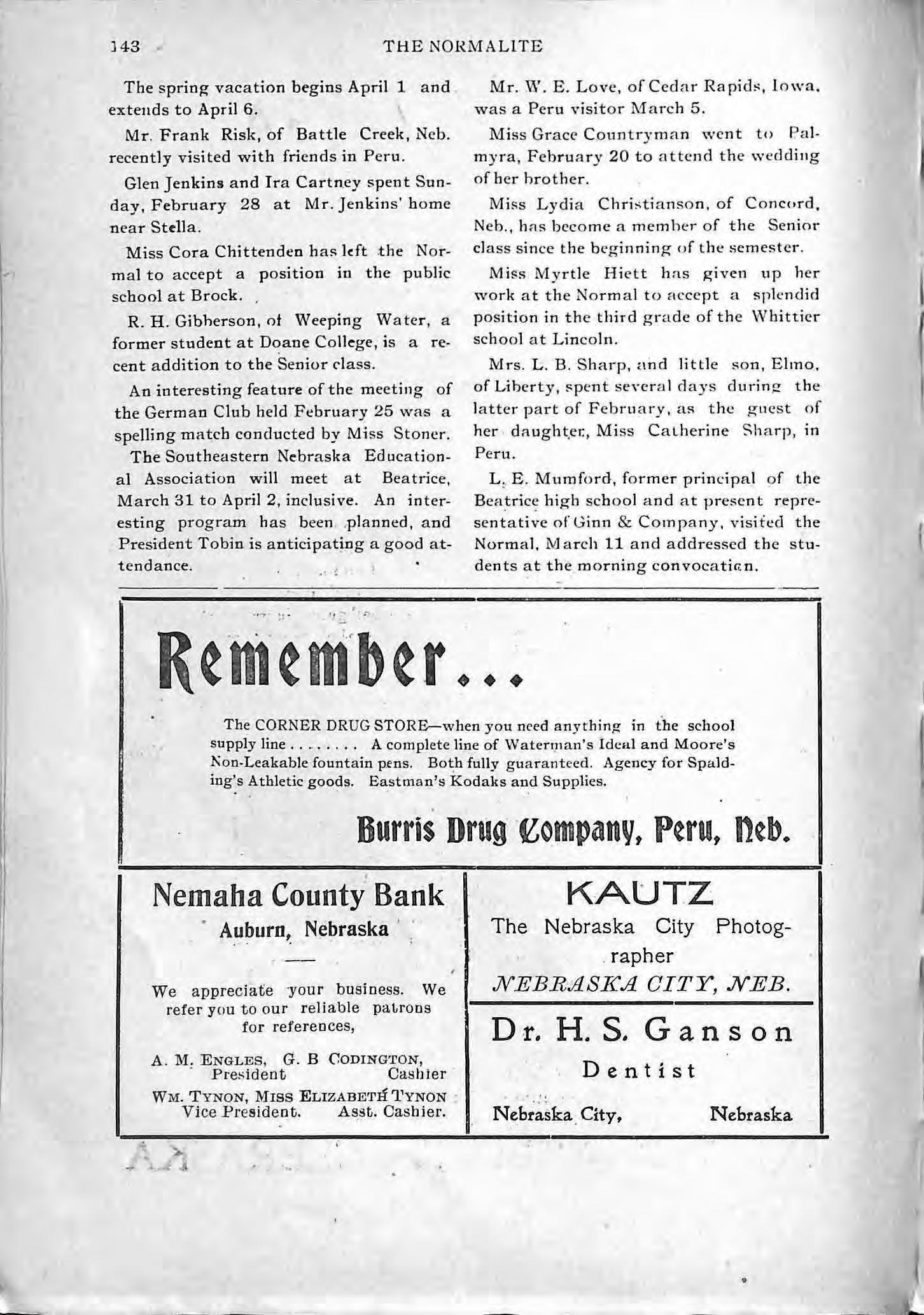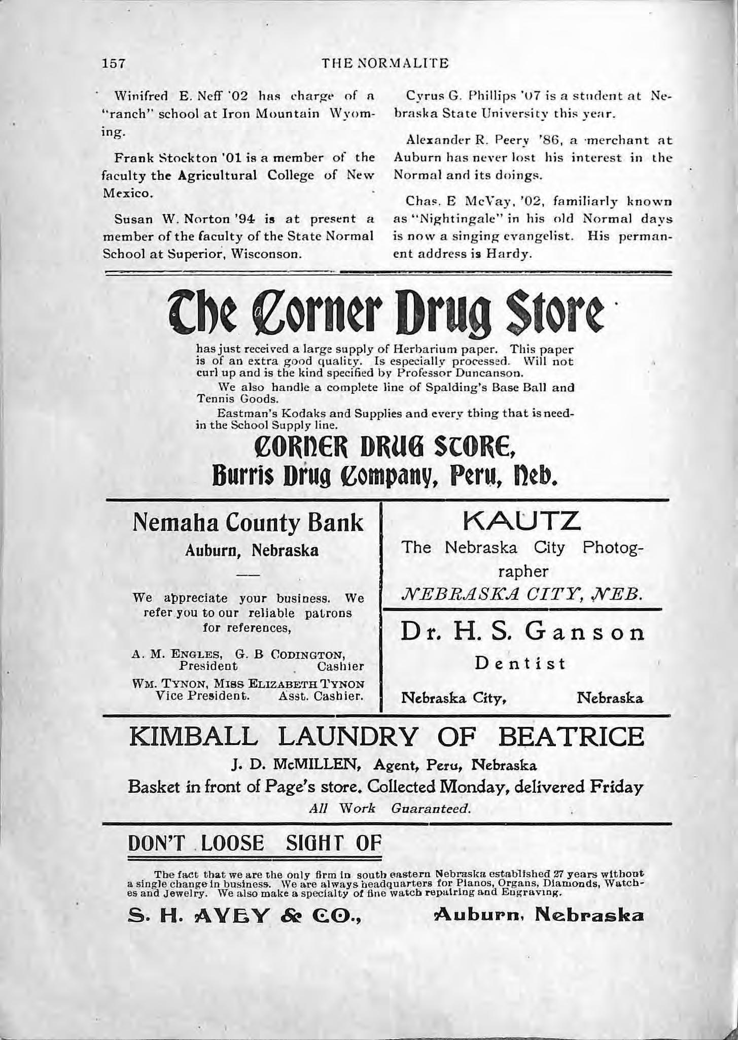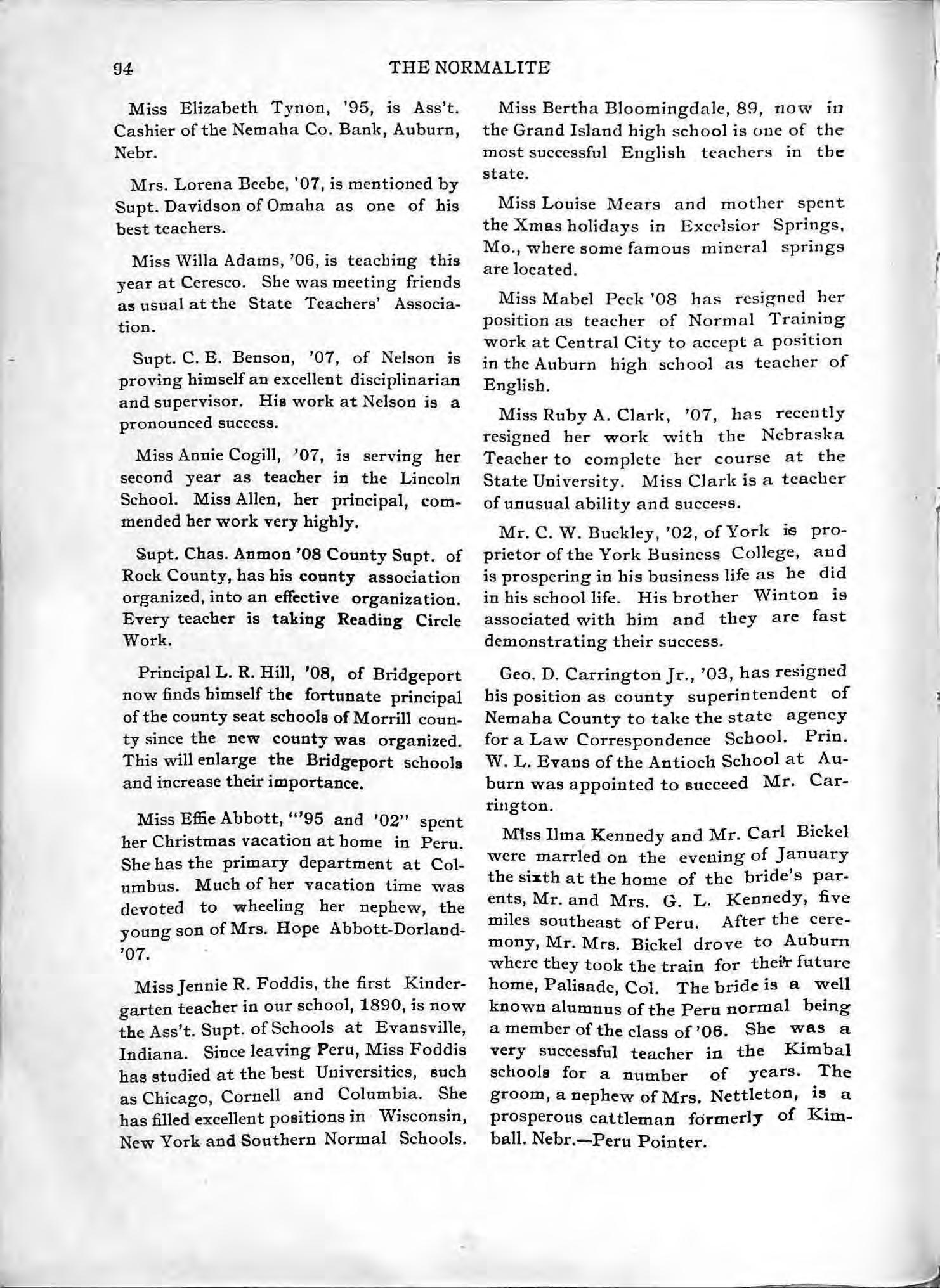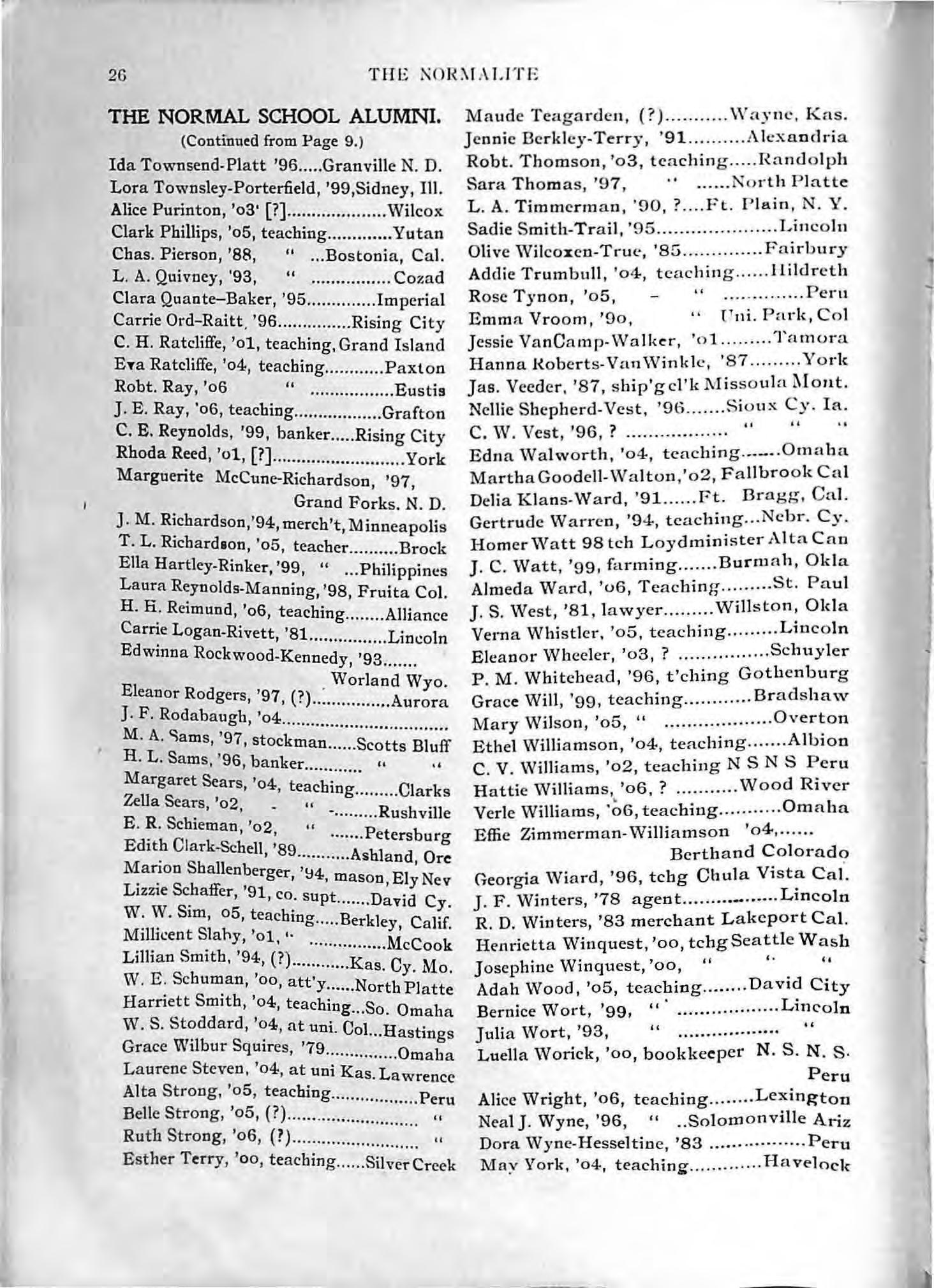 C. E. Reynolds '99 act i ve, a banker at Rising City, w ri tes tba t whi le hi s work bas taken him out of th e te ac hin g pr ofer>sion he ·st ill has a wa rm s pot in his . J1c1a rt for th e dear-o ld No rmal. . ··f !·