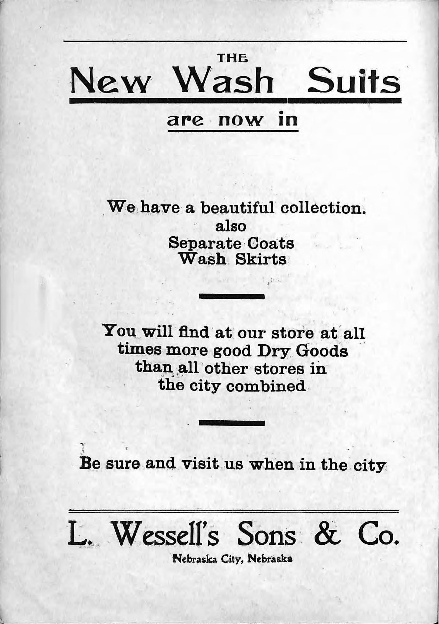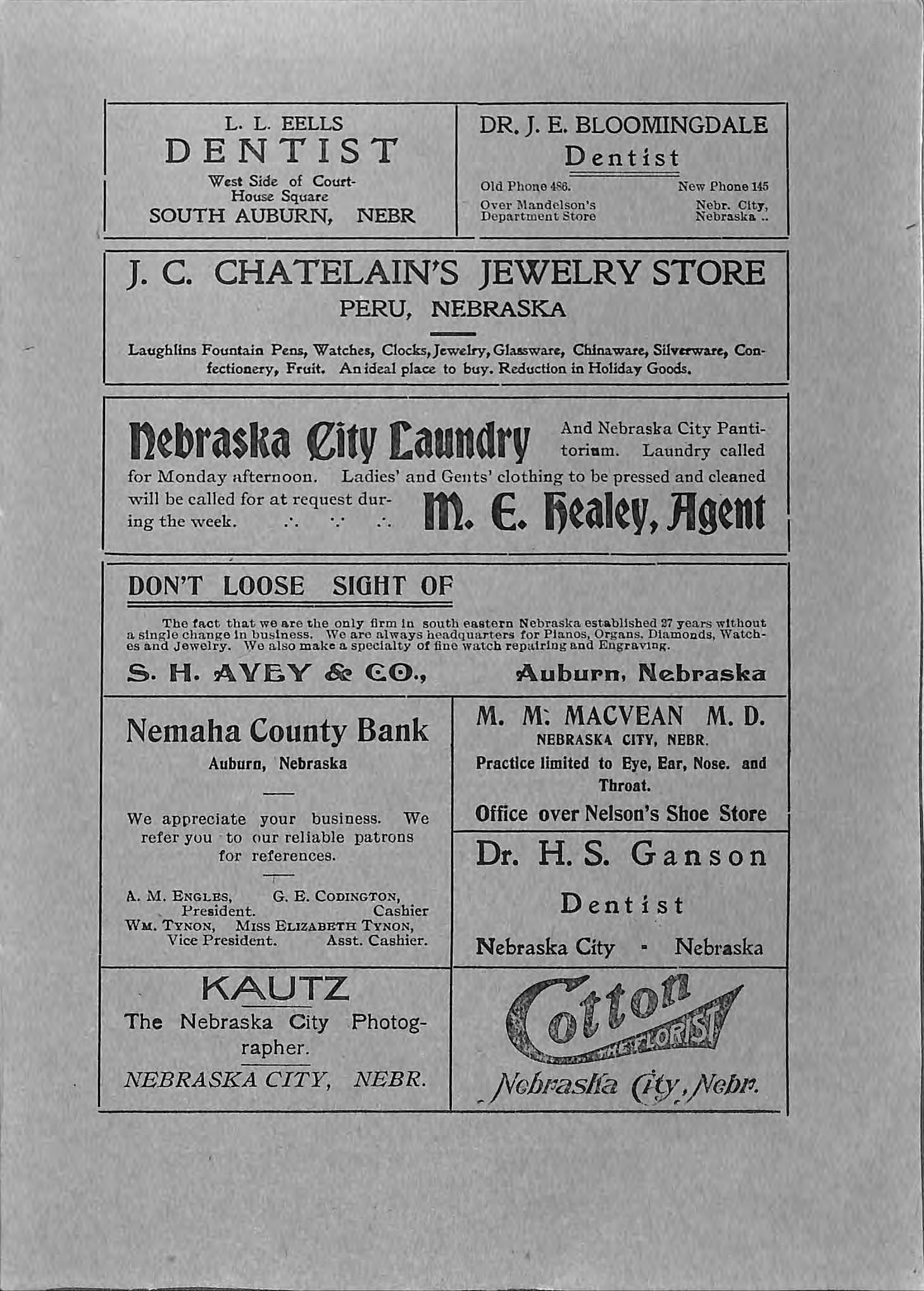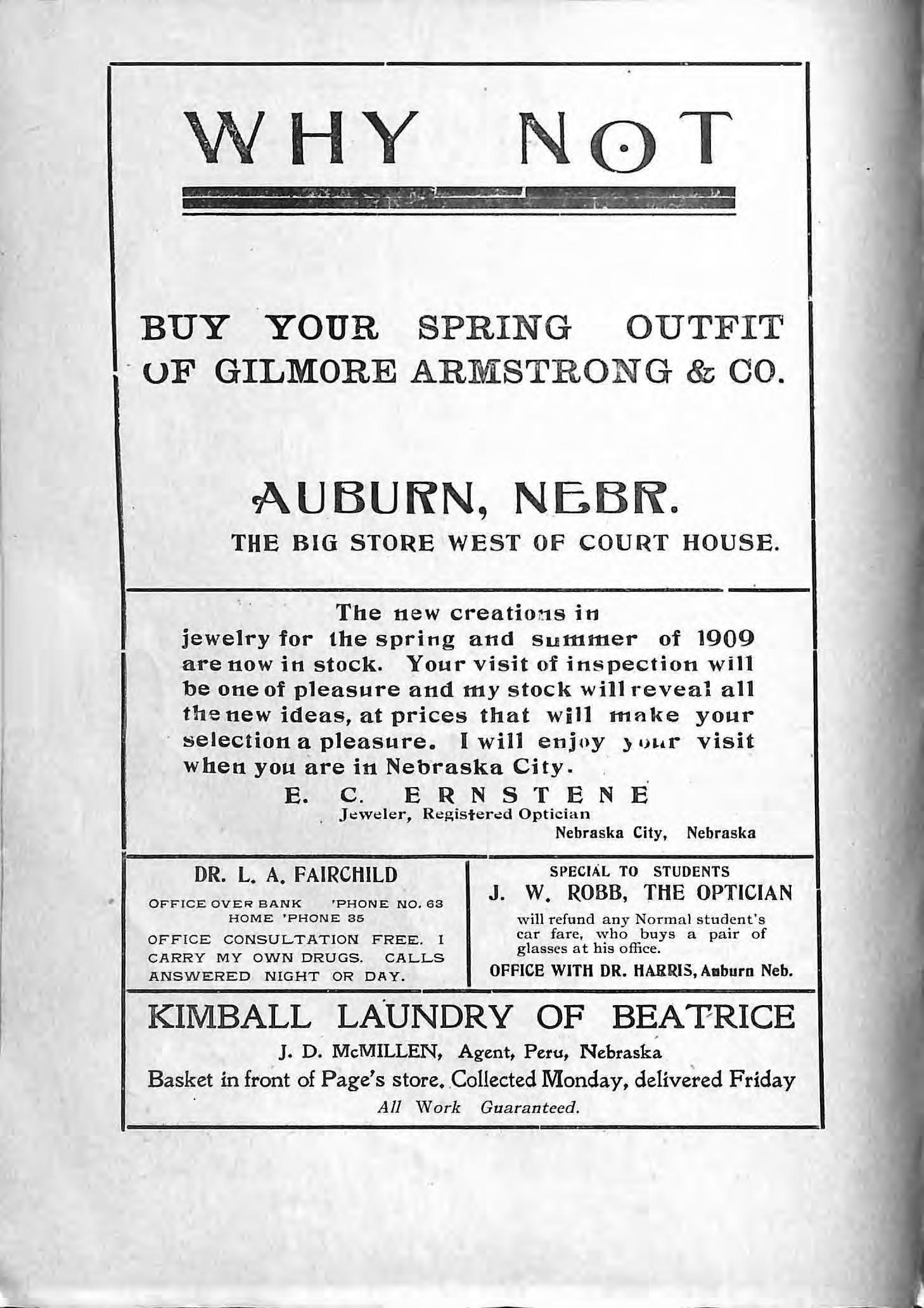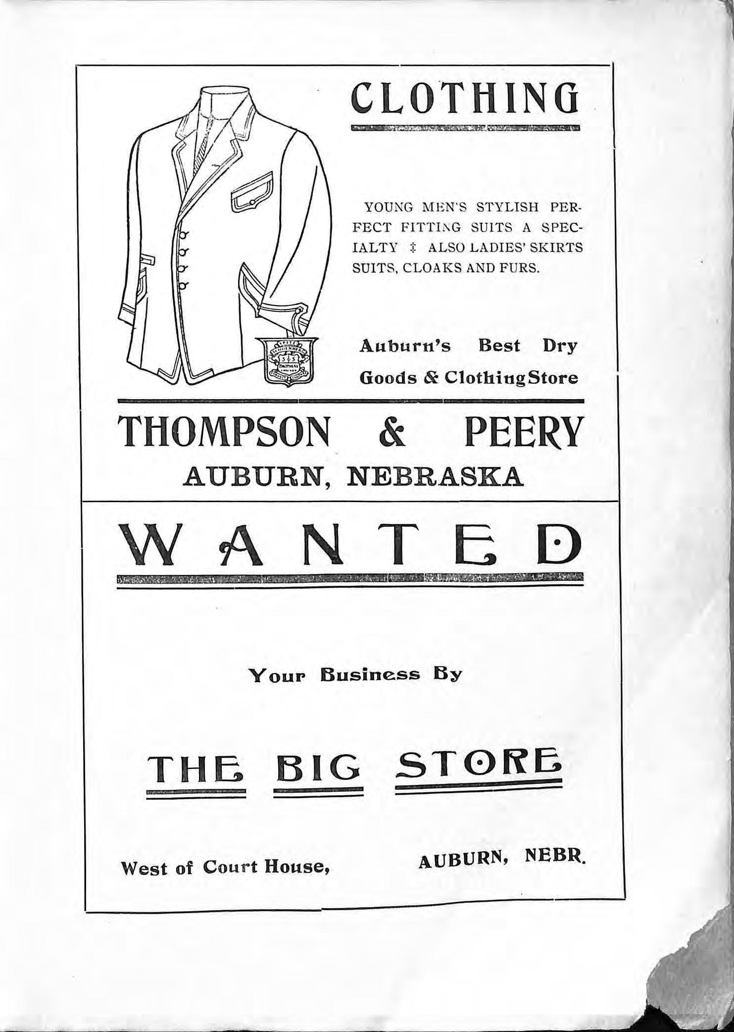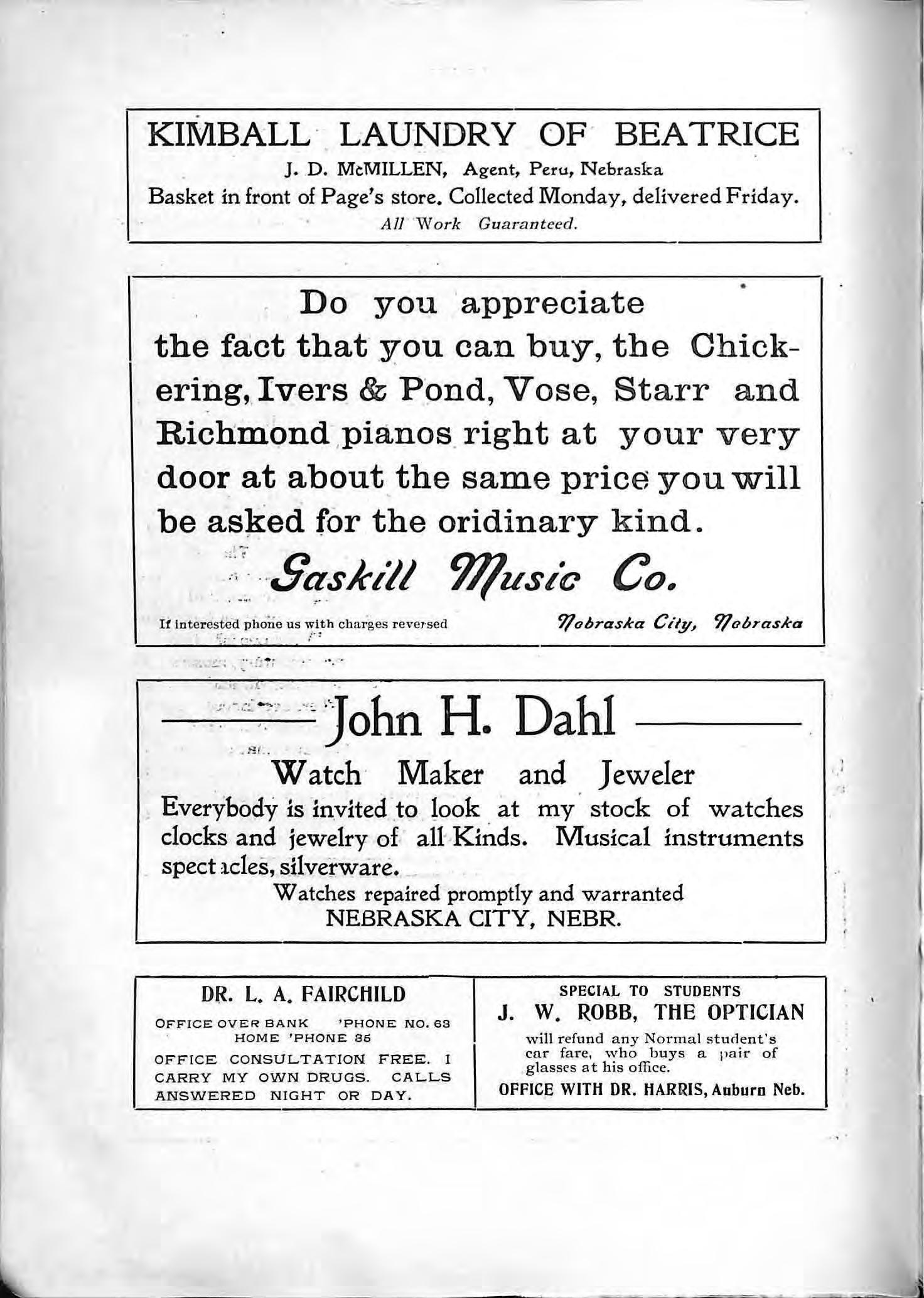 Th o ftLCt th at we arc the only firm In so uth Nebras lm es t.a bll sb ed2i yeo.rs wit hout a sl nj!le e han ge l'ir hu s lnt• s s. We are n.l ways h cn.dqtmrters for Pianos. Org>tns. PIIL!J>Ond s. Wu.r.ches and J cwe lr·y. : Wo :LI :;o make a s pt:clrLI ty of fin e w atch re.p:tlrlng tLnd· Engr a,·thg. . .. .S . H. 1\..VJGV & €.·0. , Au bur»n.