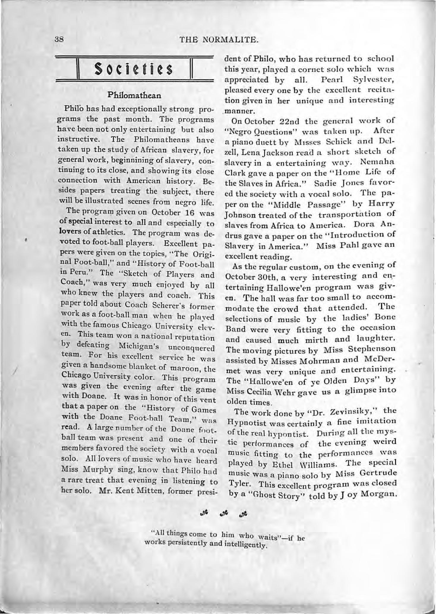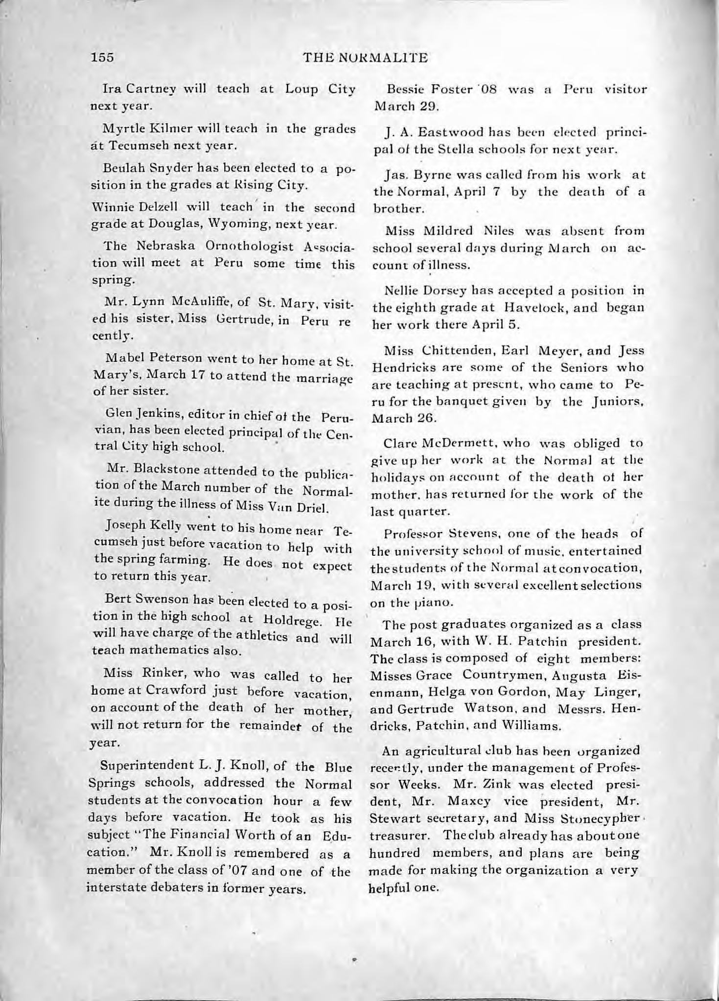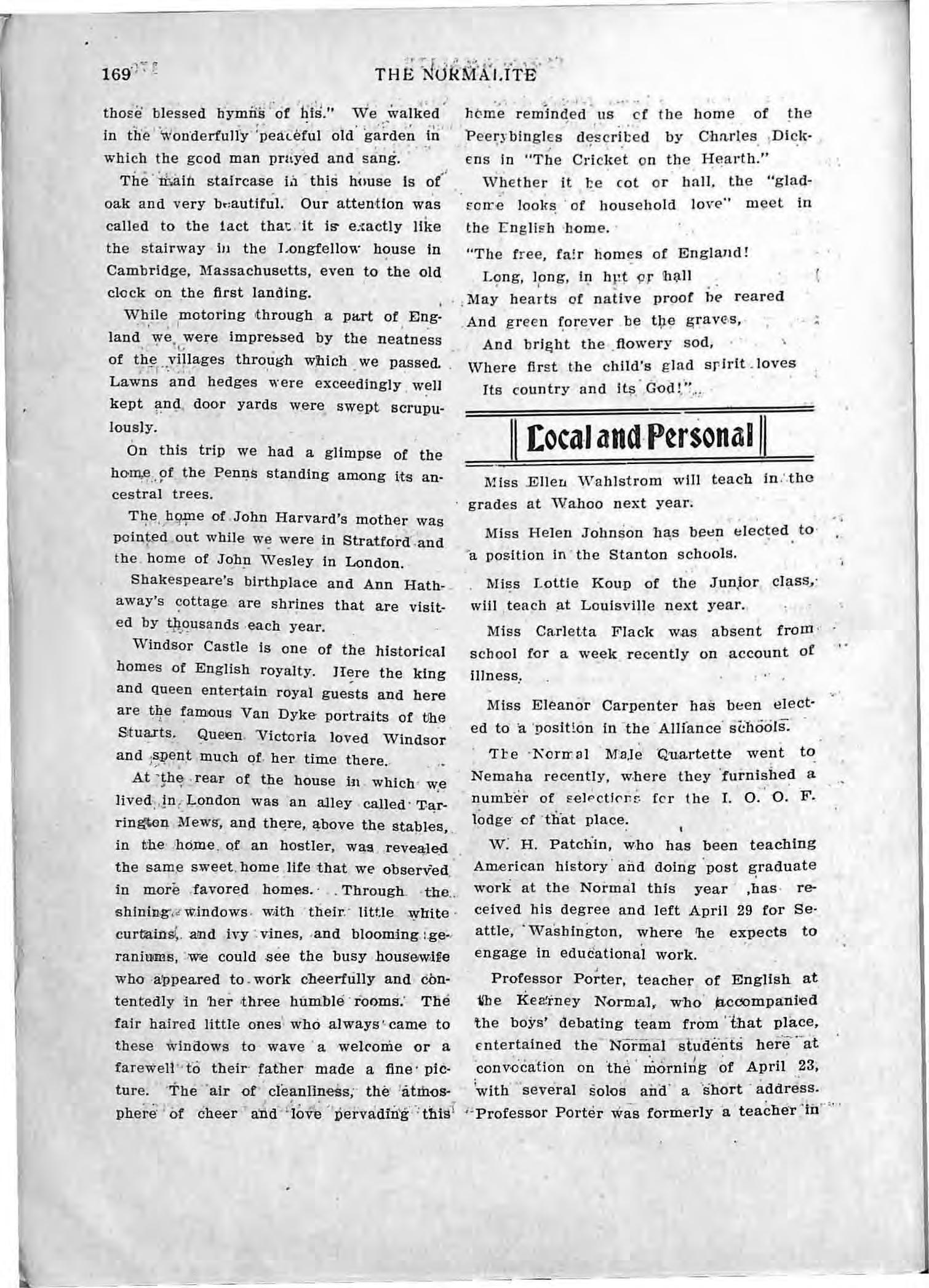 \V : H. Patch.in , w ho b as been t eachi ng Ame ri can hi st ory. a nd do in g .p os t work at th e No r ma l thi s year ,b as r ecei ve d hi s d eg ree and left Ap ril 29 for Seatt l e, " Wa'sb inirto n, where IJle exp ec ts to en gage In e du ca ti onai work .