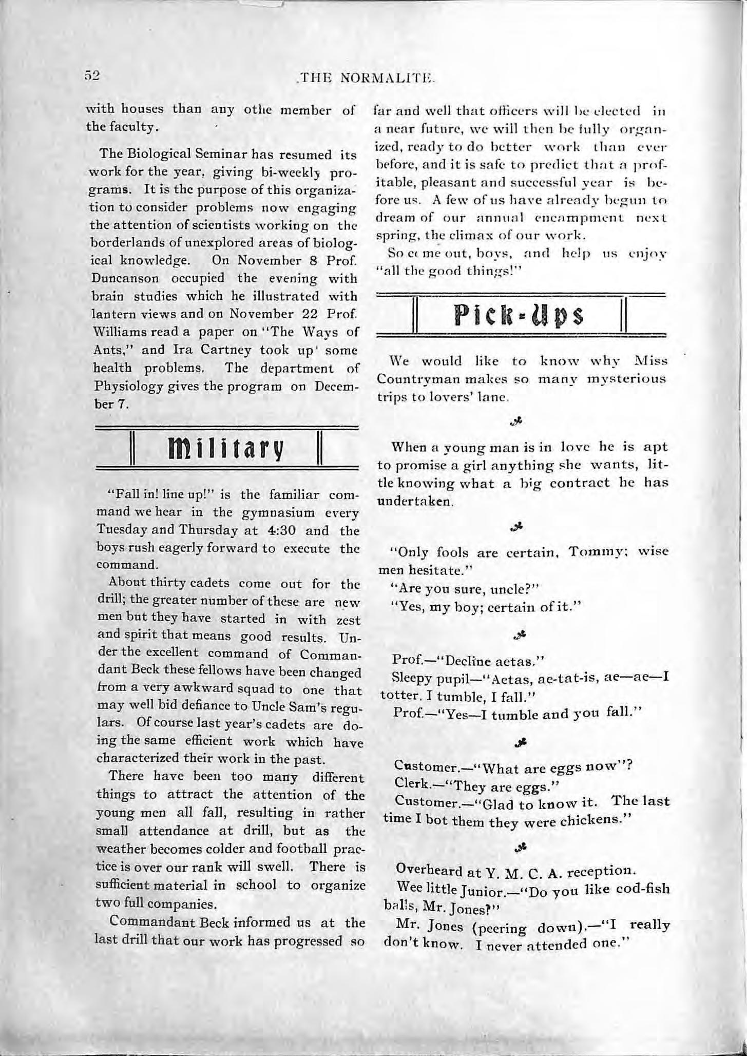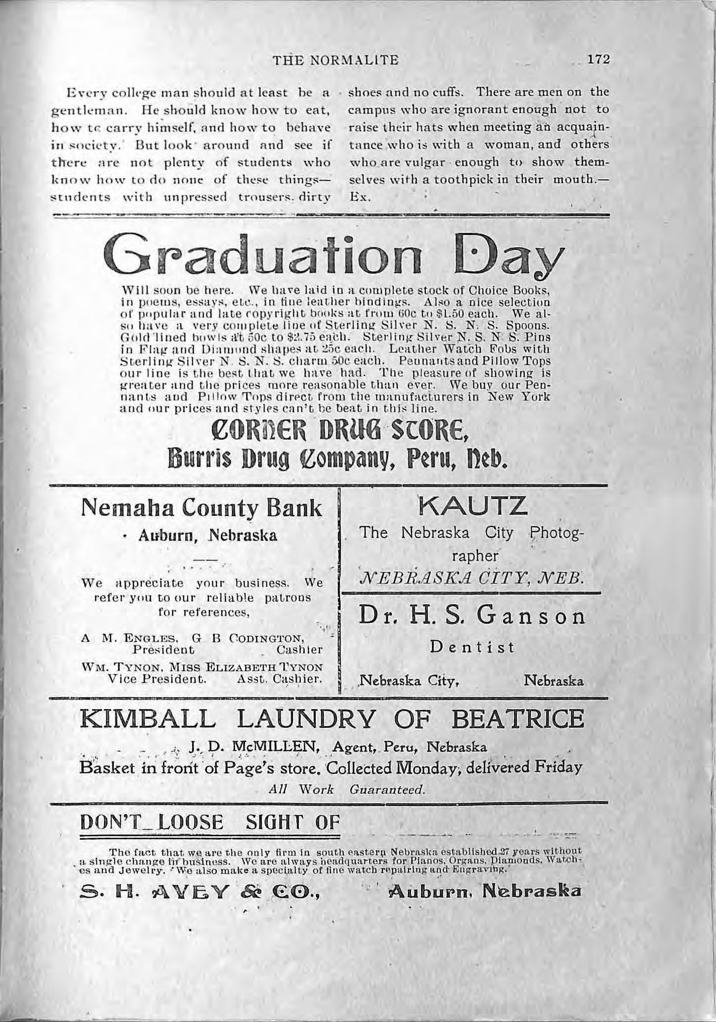En.Ty colll'gc sho uld at least he a s hoes and no cuffs . Th ere are men on t he gcn tkm n. n. He should kn ow h ow to ea t, how tr ca tTy him se lf. nnd how to bcha\'e i11 !'o..: i tt\' But l oo k· aro und nnd see if the re :trc not plenty of st udents wh o !'n ow h nw to do nom: of th c!"c thingswi th tr n us ct·s. rlirty