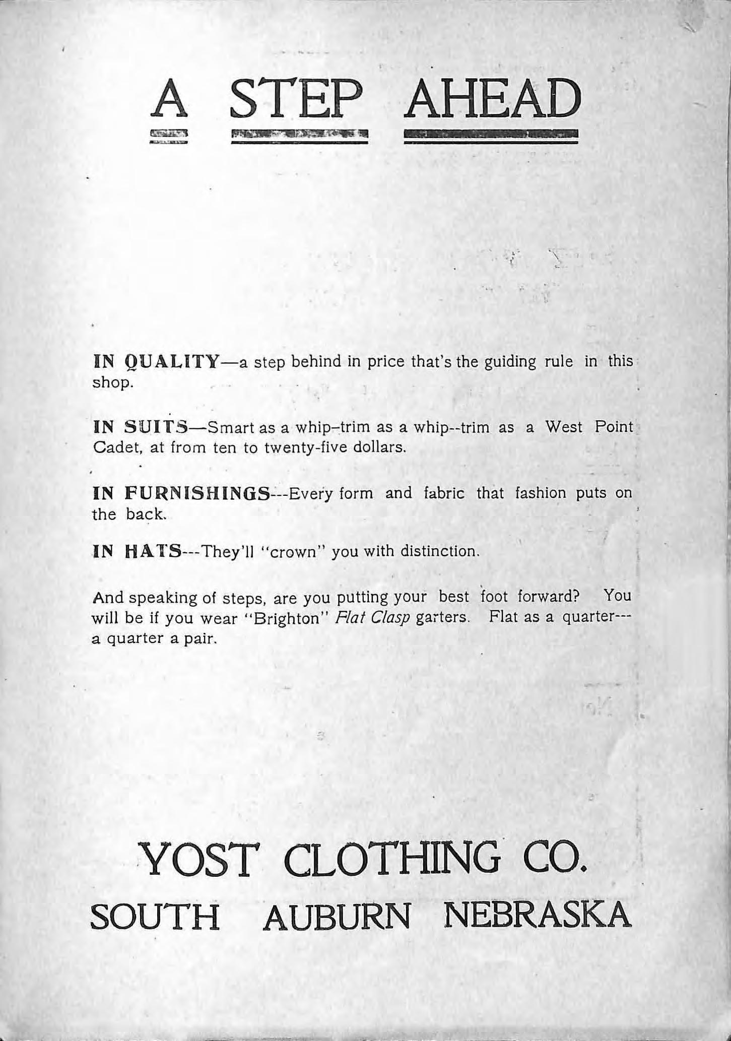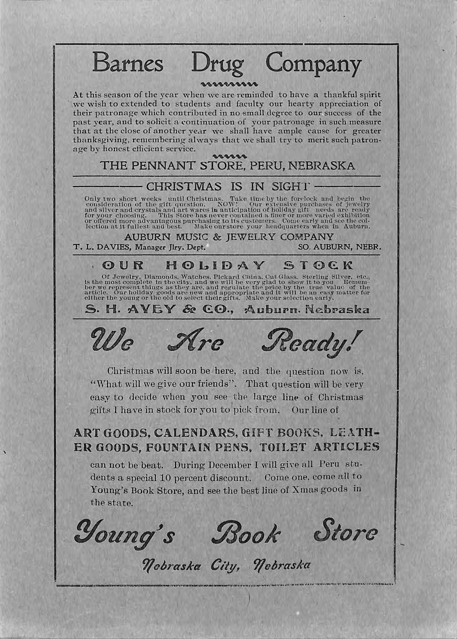 DayWi ll ·oun be h ere We lta1;' e laid io a compleLe st ock of C hoi ce Books , in pue u t:>, eLl' ., in tine le ath er Al:< o a oice se lectJ iuo o t' popular and late ropy ri )! hL b11o l's a li fnt tu (iQc to $ L. 50 each. Wealso l ta,·c a ve ry l ine of StJerl i nl! S ih er N. s. N. S. Spoons. G<tl rl 'lin ed ho wl:; ;\'t 50c LO $ :.U 5 S ill·er S. :r S. Pins in F' la!! an cl Dinurnncl s hap e" aL car lt L eat her Watch Fol.J s with 'i ll·e r N S. N. ::>. c lt ann :){)c each. Peu na rr tsan d Pill ow T ops ou r line is t he: best tltaL we ha\'e h ad. 'l'lt c plea ure of is and t.he pri ces mor e rea ·ona ble th an e 1;' er. We buy our Penn anls aucl Pt ll nw dirPCL from the m<u1uf acLur ers in New Yurk a nd our pric es anrl t:tyl<'s cn n 'L he beat in Lh i" lin e.