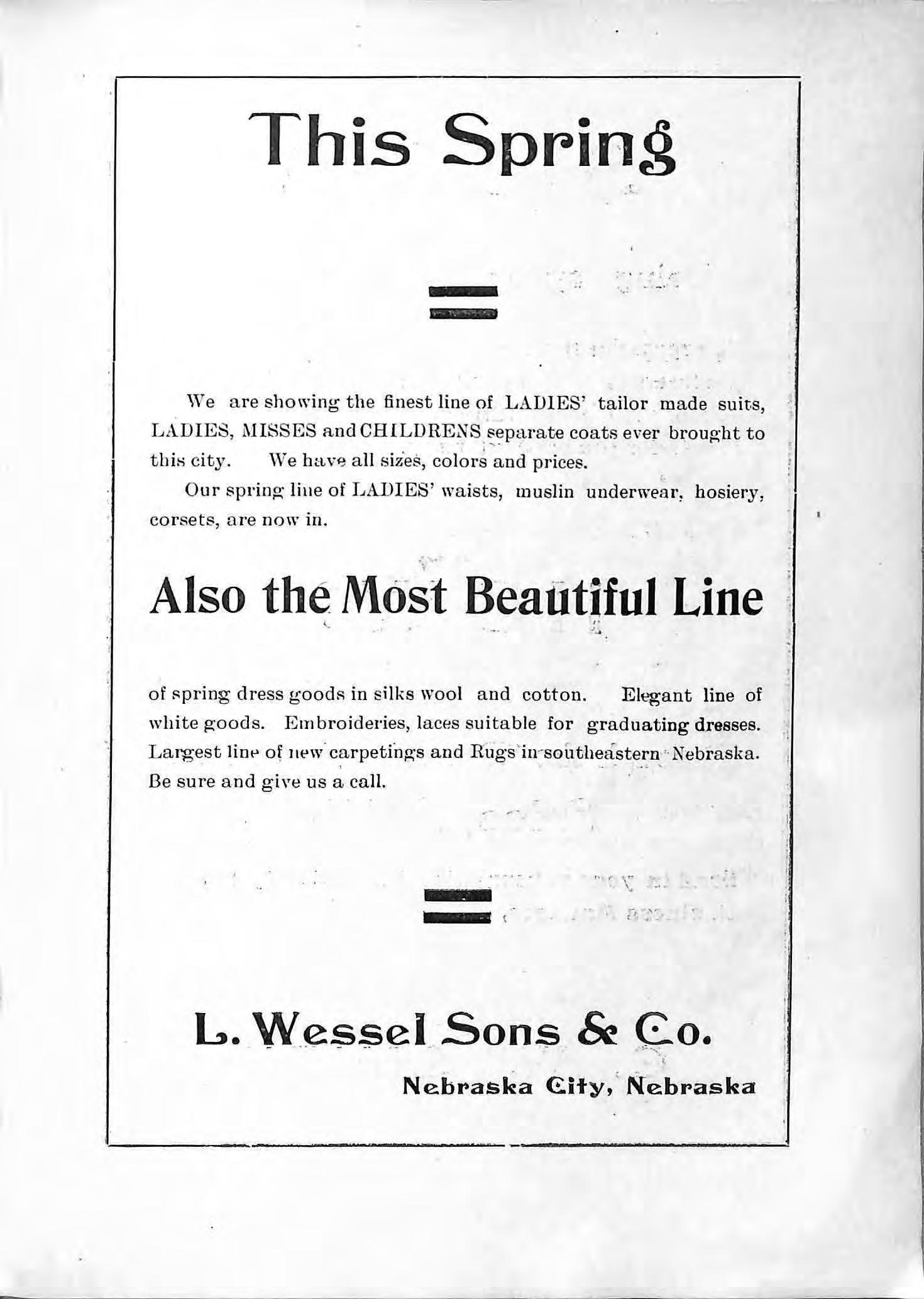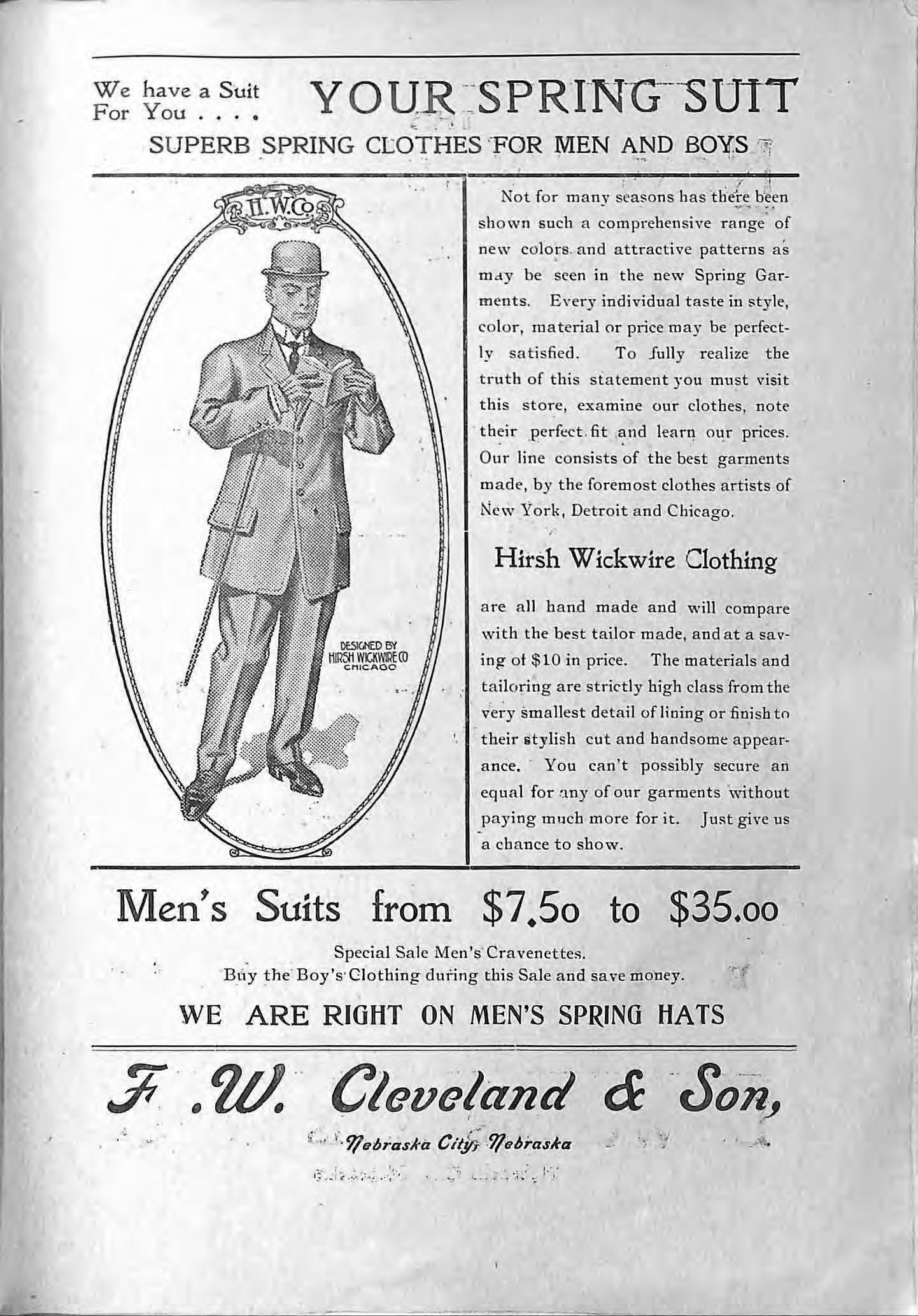 Not for ma ny seas ons h as there been show n such a co mpr eh ensi ve r ange of n ew colors and attracti ve patterns as md y be seen in the n ew Spring Ga rments EYery indi vidu al taste in style, co lor, mat e ri al or pric e m ay be perfectly sat is fi ed. To full y r ea li ze the truth of thi s st at eme nt yo u mu st visit t hi s stor e, exa min e ou r clothes, note fit our price s. O ur lin e co nsists of the best garments made, by the for emos t clothes a rti sts of New York, Detr o it and C hi cago.