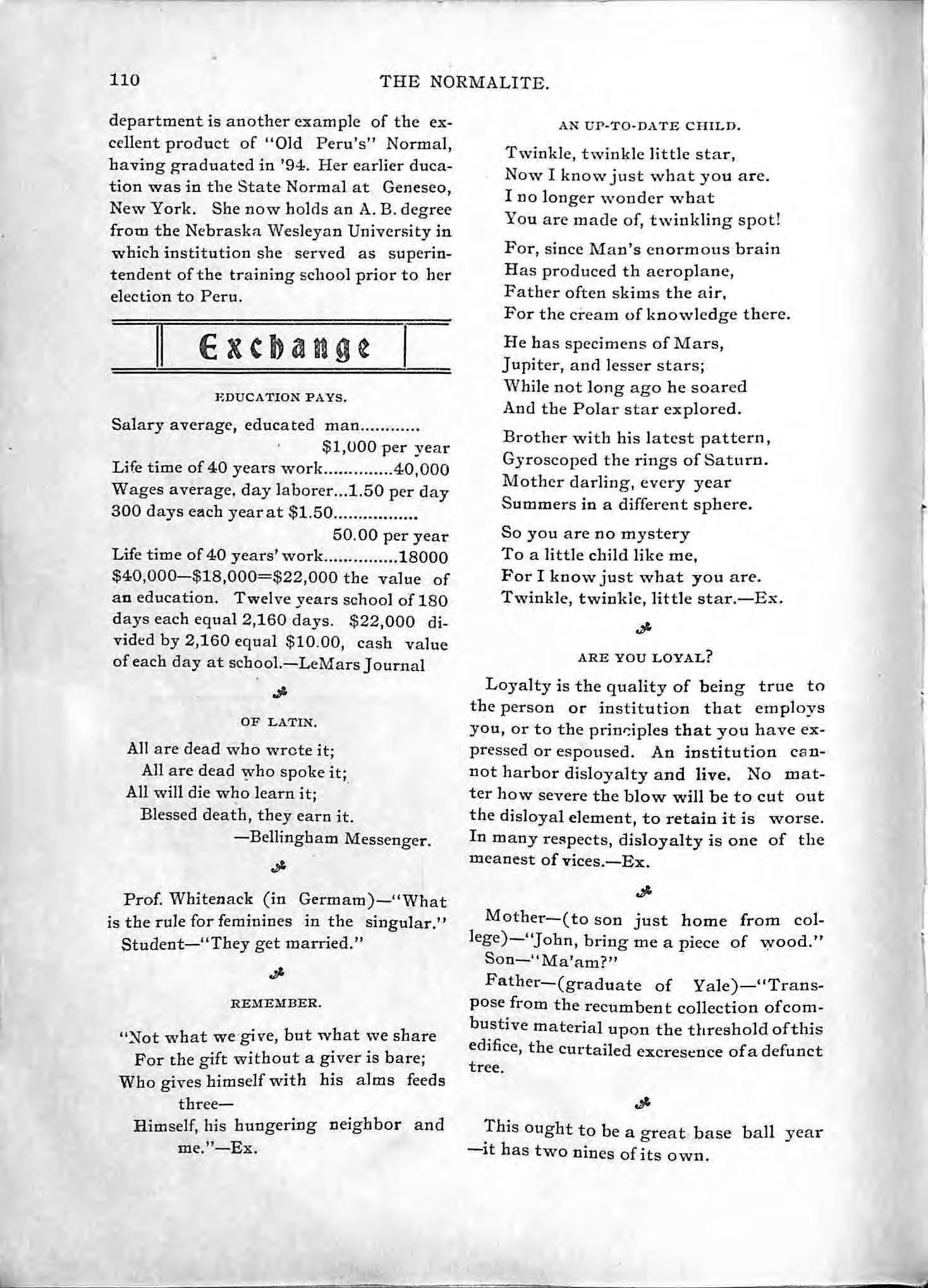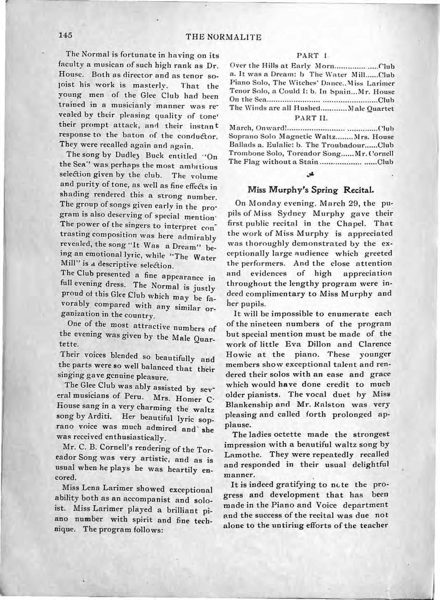 Profe ssor P o;te r, t each er of Eng li sh at ijb e Nor mal, w-ho · tJ,coo mp a nied the b oys• deba tin g te am f rom " bb at pla ce, e nterta in ed the No rmal s tu dEints here at con v·ocat ion on 'the April 23, , . tu re The ai r of cle an liness; the a trbos- ;with seve ral s olos a nd · a ·shor t a ddress. of chee r a'nd pe r vading ·: tb.is 1 ·-Pr of es s or Po rt er ,\ras fo rme rly a teacher ' in ', .·