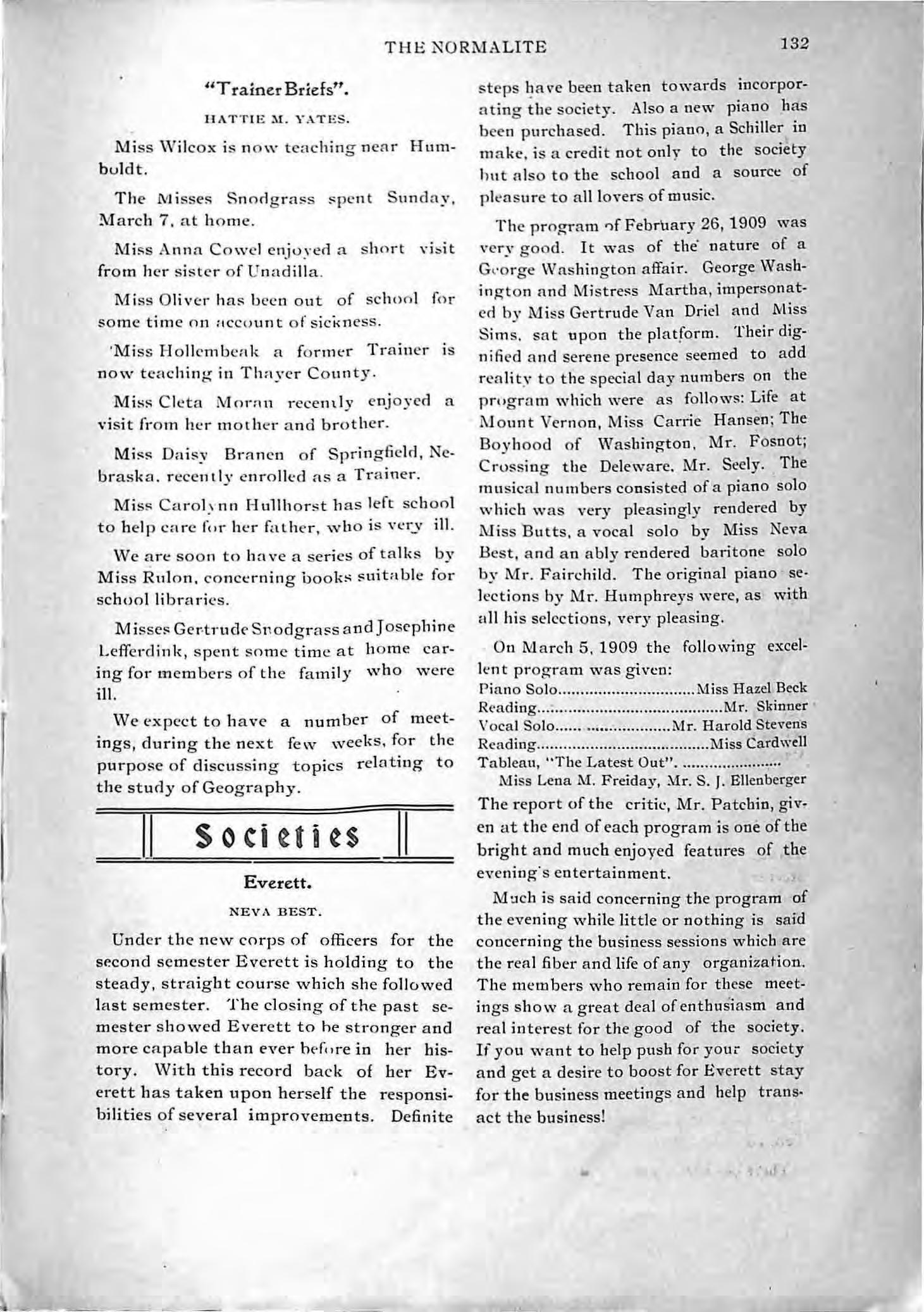 Mi ss My rtle Kre bs , '07, r es igned her p os iti on in th e Linco ln Scho ols to rest. The Sco ti a Sc bo ol Board imm edi atelv elected her Principal ol their sc ho ols wb e;e she is pro ving a great success in th e wo rk of orga nizing a nd in s pirin g a sys te m of !'choo ls.