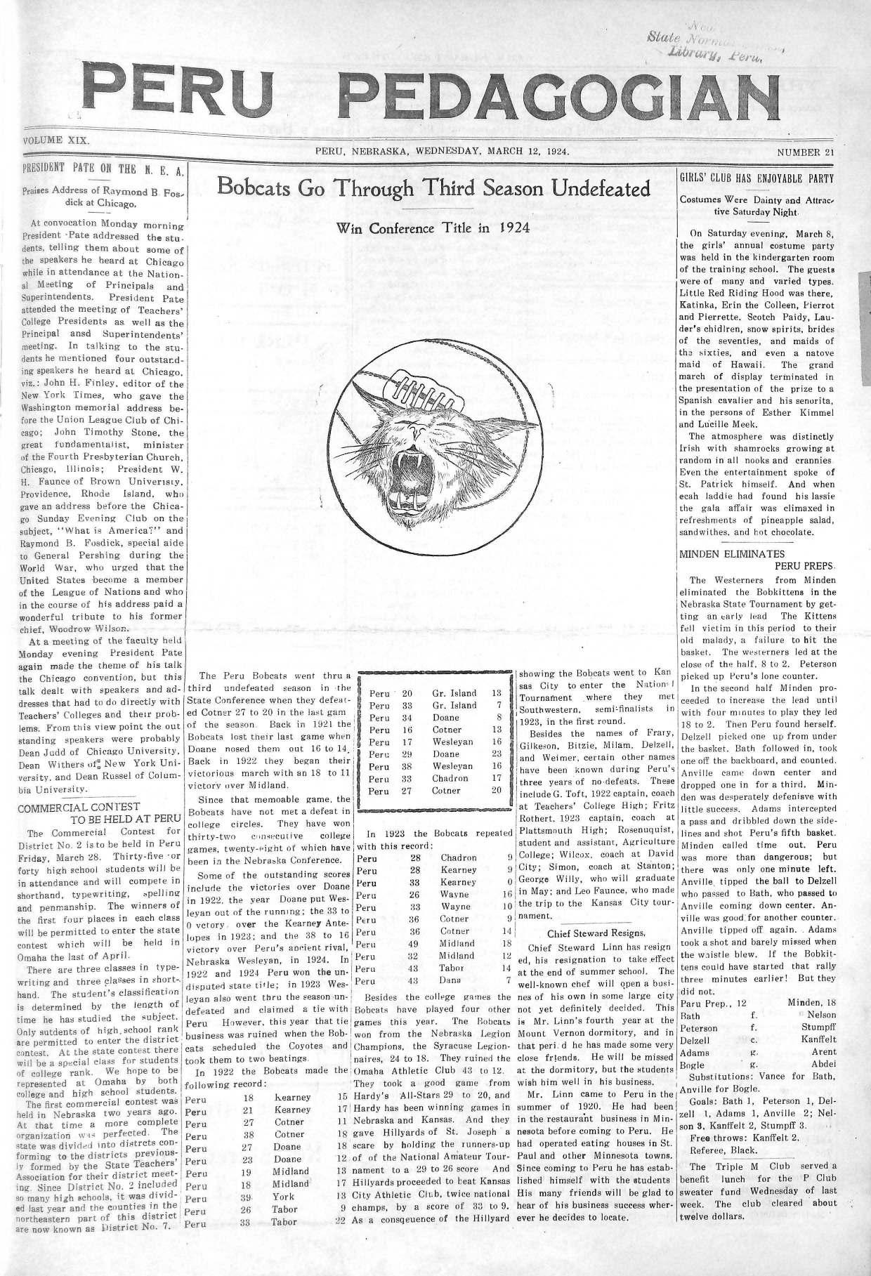The following graduates of this Ella FrancesTeich, Omaha I Because of lack of gamesfor the yearfromPeru havesecured ZenasTeich,Auburn,Nebr. i Weeping Watet·againstPlatt;mot.th ons: Clarence E. Thompson, Arcadia, ballpracticeuntilMonday. TheBobMay MillerBeck,Tt·ainingSchool Nebraska catsgo to Pawnee City to play the atPem. Lucille Thompson,Tabot·,Iowa :IndiansonJuly17. ThegameiscallIrma D. Casey, Herman, Claire It·ene Veal, Verdon,Nebr. edfor3:00q.m. Margaret Atlanta Cole, Fairbury, Dorothy Wade,Syracuse,Nebr. Didyou thetwoycungesttenNebraska 1 ThelmaFrancesWells,Omaha 'nis players fight it out to see who MayLinger,Abet·deen,Idaho Harry Anderson Williams, Ord would in the tourney f<5r the GeorgeRaymond Willy, Wilbur Nebraska second round? BobbyFatel:o1:esto tnfSU.IqaN FullerTaltonWoodie,Waco,Nebr. folbwinthefootstepsofhisbrother Crystal Margaret Meyer, Paxton, HelenMarieYeck,Wilcox,Nebr. Leonard,who wasrunner up inthe Nebt·aska PaulLeslieYost,Stockville,Nebr. Confet·encethisspring. MaryE.Wiltse,Kansas GoldieMaeGrech,MoundCity,Mo ThefavoritesarestillinthetourDessie Wright, Laurel,Nebt·. MyrlEmrick,Syracuse,Nebr. ney. The Misses Blankensr.ip and Mary C.Borne,Madrid,Iowa I LoisFishet·,MasonCity,Nebt·. Bomelooklikecertain''inet·softhe Jessie F.Connell, Pocatello, Idaho' BessieGillan,Fairbury,Nebr. ladies' doubles. The mens doubles Spencet·M.Leget·,Elmwood,Nebr 1 Lucile Harris, Salem,Nebr. I arenotsocertain. Thefacultyteam Mable Gustafson Quiller, Omaha, RoyL.Klaut·ens,Firth,Nebr. IofBeck audJindrawillgiveagood Nebraska ! YolaMaeLamb,Coffeville,Kan. i accountof itself Among the stt:dRuth Strong Wamock, Farragut, 1 W.OttoOakes,Kearney,Nebr. i ents there are such ;:s Iowa I AliceMarieSorenson,Omaha. I Hansen and Hansen, Hoyt andDahl-D.H. Weber,Shubet·t, Nebr. I The following members of the strom, Hoy and Morford, Willhoft EdnaAliceFish,FallsCity,Nebr. classwillbeinschool,mostofwhom andPool,andsoforth. EdnaIreneFisher,Lincoln,Nebr. havechosentofinishtheirBachelors In the singles both last Laut·a Kovanda,At·izona. DegreeinPeru: . \ Ifacultychampion,Mr.Beck,andthe AnnaMaeMason,Arizona. Bessie M.Church student champion, Mr Willhoit, are Nainie LenoraRobertwn, Lincoln. GeorgeJ.Church intherunning. Theladiestitlewent AlvinaSelk,Alma,Nebr. David F.Costello toMissBlankenship,whoremainsto AlbertaSkeen,Omaha, Nebr. Mark L. Crandall defend her title. Willhoit and Mat·jot·yE.Arnold,Hamburg,Ia. MarkWilsonDelzell havethebestchanceat ErmaVeraB:mtz,FallsCity,Nebr. Glenn P. Gilkeson Ithe mixed doubles,though an upset ForrestGeorgeBell,DeWitt,Nebr. W.AltonHair wouldnotbeatotalsut·prise. Millat·d DeWitt Bell, Bradshaw, Clarence Edwin Hawxby. This is the mostsuccessful tennis Nebraska Raymond E. Hunter. season that Peru has ever enjoyed. Helen Aileen Carman, Riverton, EthelC.Lindahl. Sixty-two members have made the Donvin Clifford Cartet·, Orfino, Irene P. Nelson. Tenniscluba live-wireorganizati)n. Nebraska Muriel Elizabeth Scheuer. Swimming classes have filled to JamesConway, Stockville, Nebr. Hal'landVerneTaylor. capacityandhavekepifilled. Peru's ElsieJ.Dollarhide,Beatrice,Nebr. T.heodot·eDonald Weimer. superiot·swimmingpoolisoneofthe PaulDunlap,Havelock,Nebr. RobertG.Whittemore. most popular asset$ to the "oldest Alfrid Gilquest,Stromsburg,Nebr. Hadand Whitwell. normalschoolwestoftheMississippi. VerdaJune Hauptman,Colorado MauriceBot·en. Did you knewthatSpencerLeger Mable Gertrude Jorm, Verdon, Bernard 0. Bostrom. isthe best on the campus? Nebraska BemiceBreckenridge.· HeheldthePerutitleayea)·ortwo · ;Esther Grace Kcefet·, Papillion, MiloB.Clark. IhewasOwenDaly'sWrestlingpartNebraska Barton Clevenger. neratAxtell,andhewonhisbatallOllie May Klumb, Grand Island. ElbertLyleLaughlin. 1 ionchampionshipin the A. E. F. RuthVictoriaKurtz,GrandIsland GlenMelvin. I The Yannigans and regulars split Louise M. McCrory, Indiana Roscoe E. Wl'ight e\·eninatwo-gameserieslast week ArthurRogers Majors, Endicott, AllDegreepeoplewhodesiredpo-InthefirstgametheYanniganswith Nebraska sitions have secured just about the Coach Clements pitching airtight Edith Neal,Omaha kindofapositiontheysought. The ball and with two· Regular·s, Beck Pend Newhouse, Campbell, Nebr. two-yeat· graduates with experience andHunt,intheline-upturnedback Susan O'Connor, Omaha havebeenlocatedanditlookfavor-theteam led byCaptain Clark bya VivianDorothyRowe,Dorchester, ablefot·those who do nothave ex- scoreof4to2. YerkeshitahomeNebraska perience and who want positions torun.in this game.The battery work Ruth E.Sandell,Plattsmouth be located before school begins. of Clements and Hunt. was largely BlancheMaySeibold,Friend,Nebr. Those who receive elementary cer- responsiblefo 1• theYanniganvictory OnnMinet·vnSeipel, Grand Island tificates and tt·niners certificates Scorebyinnings: