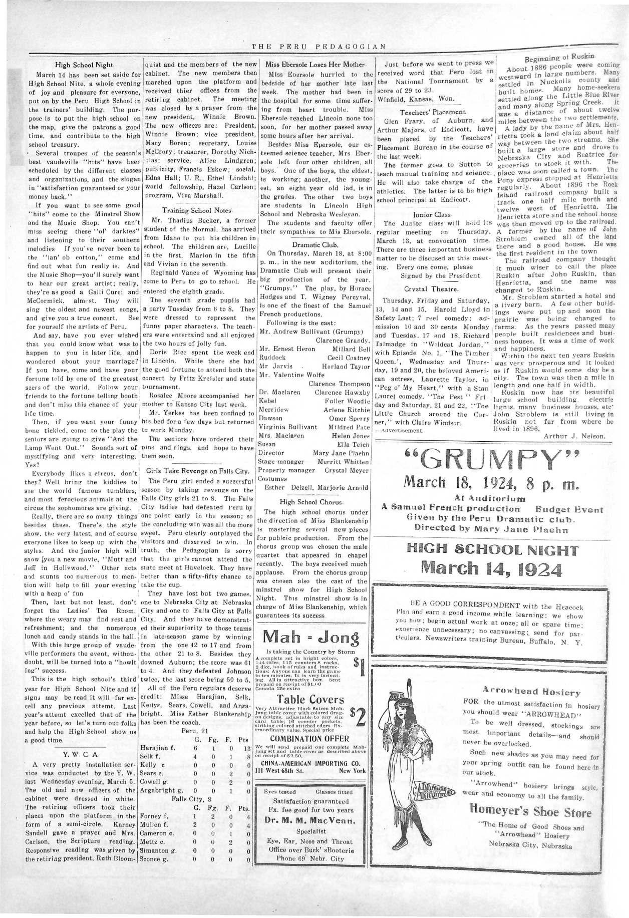 Peru.Nehr. carried. Studentswillpleaseremember thatthePedagogian is their Tne consists of paper,andthattheycanaidinmakingitofvaluetothestudentbndy. 124peppymembers. Atthe first j;Anewspaperismadepossiblebyitssubscribersandits meetingof theyear arrangement!"l Youarereadingacomplete wh;n Eachstudentisasubscriber; the contingentfee covers the subscrip- wt!remarie for a get acquainted LincolnStar Youhavethe satJsactl(ln ° th b ·t If h P d f 'I' d nPW·paper featnresare e e,. tion. l'oouradvertiserswegiveespecialthanKs. t e erustu party,which washeld atthe col- thenews acJJtJeslln . the news of · h p d · j th h I I" obtainable Two leaserl wirt-servicescarry d h I willremembertomentiOnt e e agog1annowan1 enw en f eaJng lege gym, September 21. This thewnrldto TheStar-The f.._s!:'OCi<ited an t e nwithouradvertisers,itwillbeakindnessto the staff. lf they wil[ partyaccompli3heditspurpose; ternarional NewsService, providing the:,trongest news tellnon-advertisers that theyshouldadvertiseinthePedagngian,the Ieryonemeteveryoneelse servicepossible. thoughtfulnesswillbeappreciated.Andaboveall,weurgeyoutohelp September25.thefollowing The greatest cartoonists and feature thosewhohelpus. Patronizeouradvertisers. cerswereelected: writersareoontributorstoTheStar. HarryTackect,president. Youcanalwaysfind somethinggood in The Star; it will With an increased enrollmenthascomeanincreaseinpeo. The football rallieshave been ajoyto athletic enthusiastsand to loyal alumni. The revi\alofMr.Pep attheTarkio rallyde!'ervesspecial mention. Withthe spirit that is nowrampant amongthestudents Peruisboundtobeoneoftheliveliestinstitutions oflearning inthe state. Andthenumberr<willincreaseevenfasterthantheyarenow in· crea;ing. Let'sallpulltJgetherandpullhard.