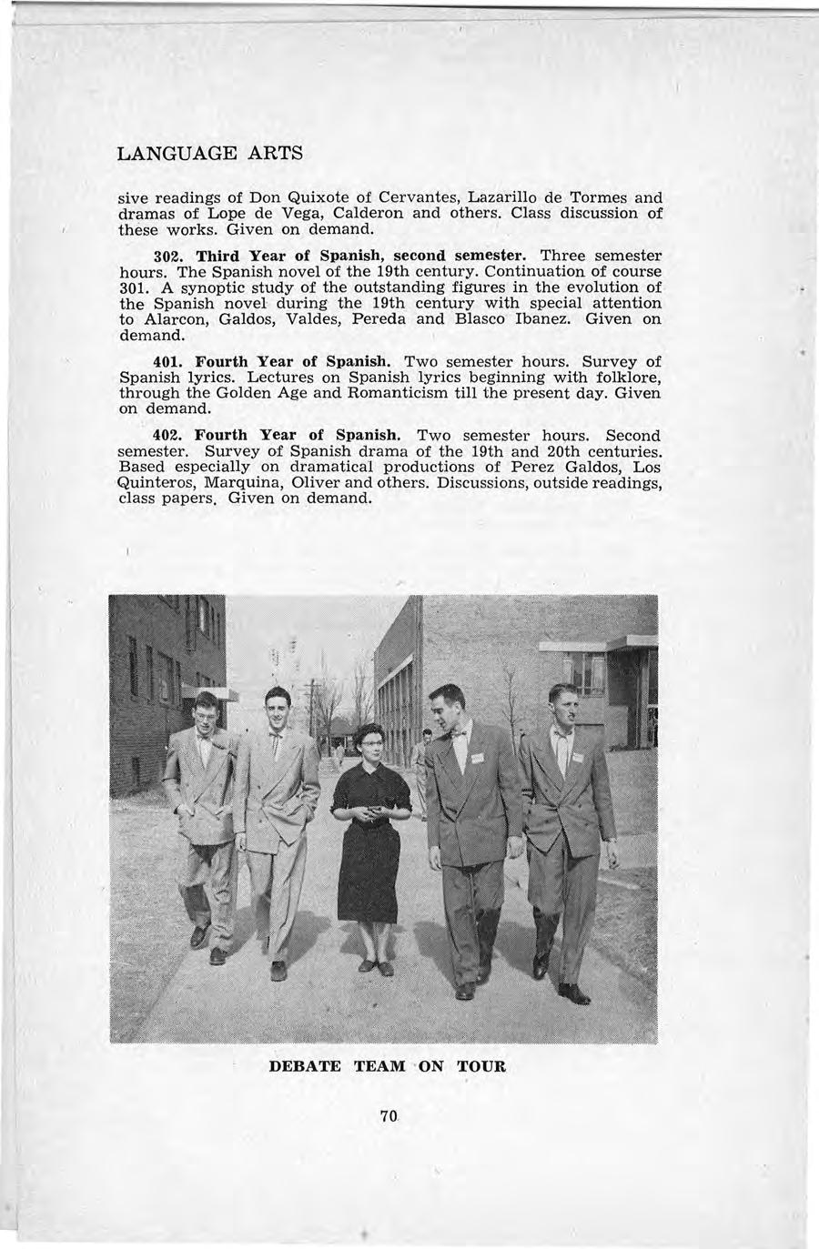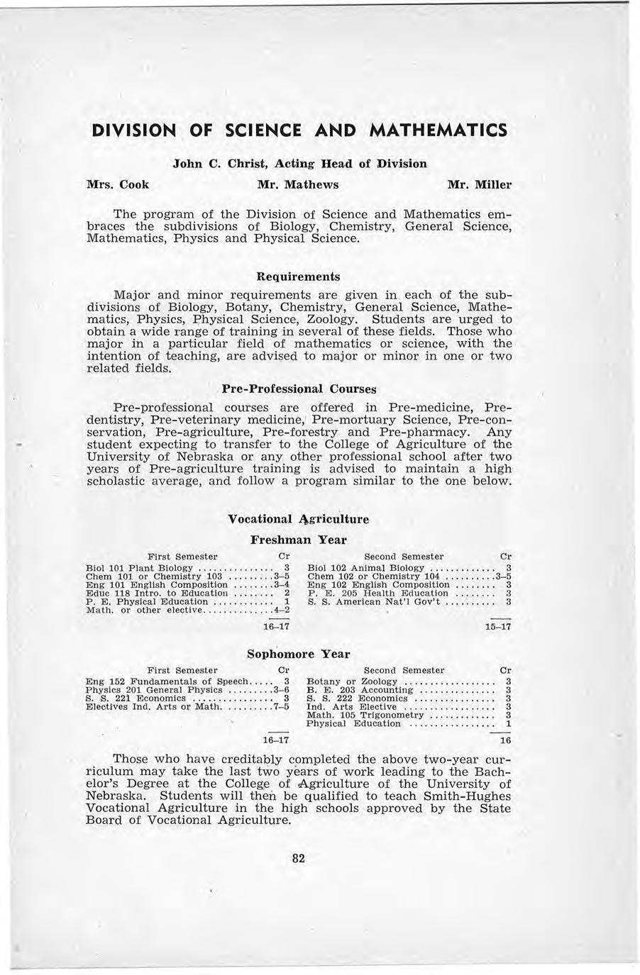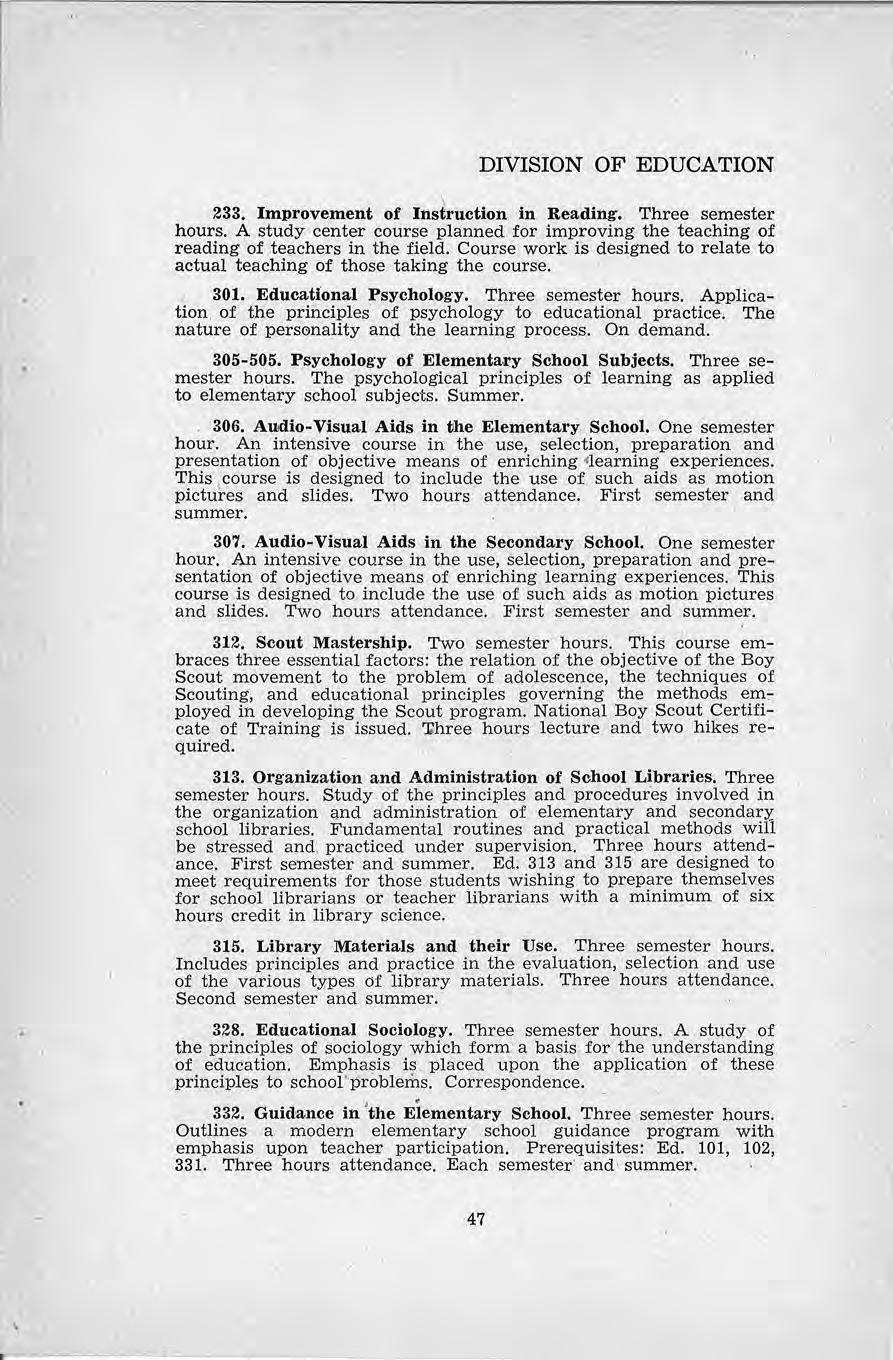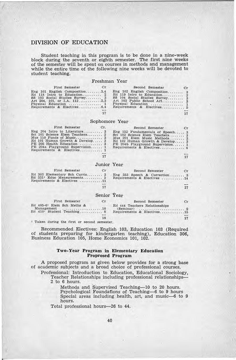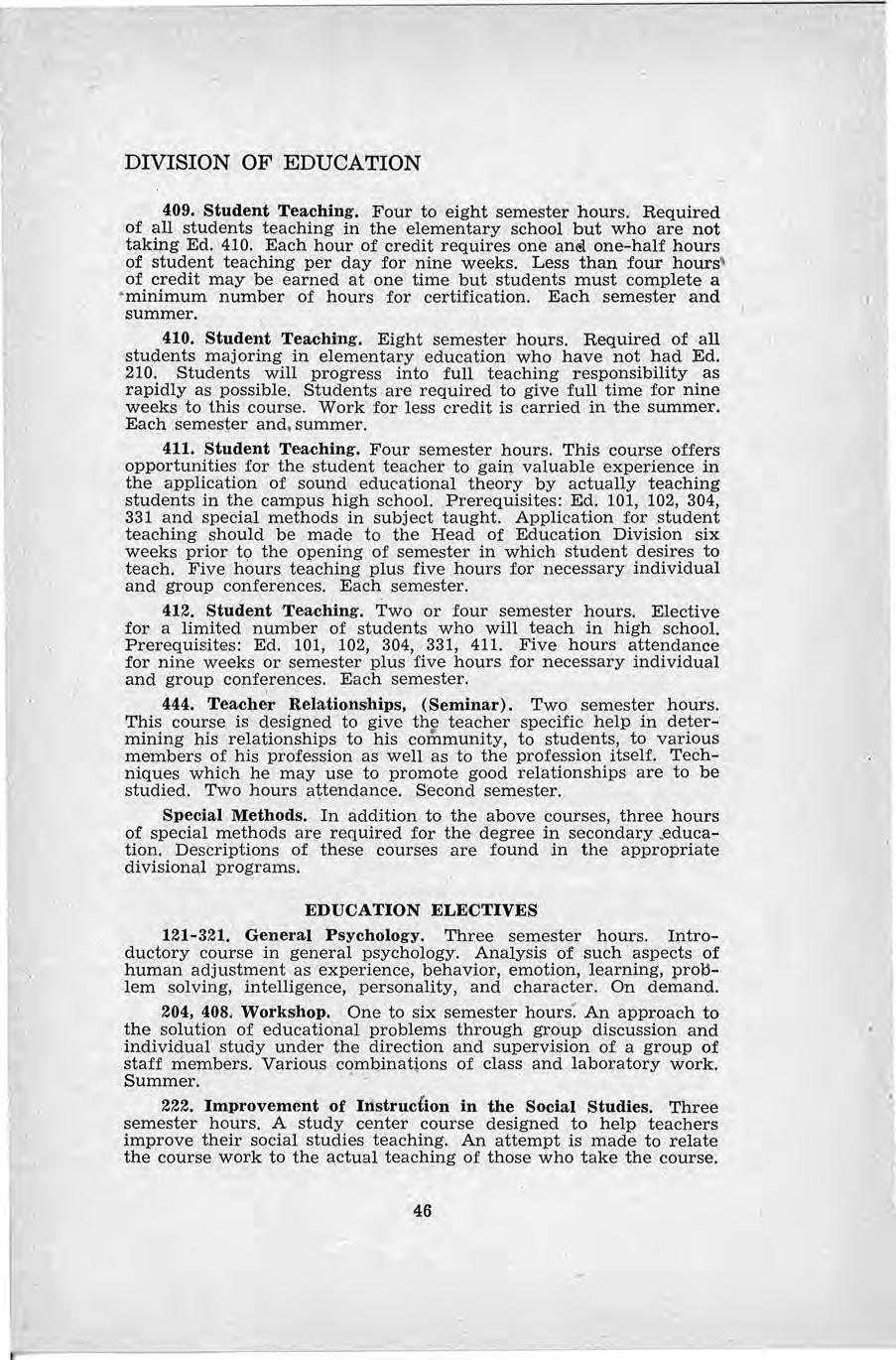 Index Academic reg ul ations . , 2 7 Accred it a ti on , . , 11 Admini stra ti on 6 Administration off i cers 6 Adm iss ion to college 27 Admiss ion to te ac her•pr epara. ti on cu rr i culums Alu mni assoc iation 38 17 Art 50 Atte nd ance Awards I 29 20 Biological S c iences .... ... ..... . .... 82 e,iu~,;_ti~;,· : : : : : : : : ; : : : : : : : : ~i Business officers , , 6 g:~rrr::te~: :::::::::::::·::: 0 : : : : : : : : : ~i Change in program. , . 29 Chem i s try , . 89 Cl ass ific a tion of st u dents : 28 Clerical train i ng . . . . . . . . . . . . . . . . . . . . 72 Co rre s pondence co u rses 100 Ap plic a tions 10 2 Cred it for education a l experiences in ar me d services. 28 C urrlculums 32 Cu rri c ulum , selection of. 32 Degrees and diplomas. 35 Degrees, general requirements. 36 Educat ion 37 Libera l A rts 38 Degrees granted , , , 103 Dining services , 25 mpiom as 35 P o m as granted , , 10 3 Dormitories , 2j Education, D ivision of. 39 E lementary ed u ca t ion 39 En g lish 61 Entert ai nment and soci a l li fe H Entr ance requirements 27 E xpe n ses 22 Extension services 100 Fees .........• , 25 Non - r eside nt ......... . . . . . . . . . . .. 25 Priv a te ins truction , . . 25 Fine Arts, Division of. 50 French , 6i General informa.tion 11 Geography , , , , . . . 97 .;,. £.;,;,- ·::: :: :: :: :: :: :: .. ~g He a lth a nd Physical Educ a tion Division of .'. 56 He a l th and physical education Hi ith ma';;'d phys.ici:.i eciuci:.t1on' 5 ~ m;~~ r;o rn~~ .::::·. :.:·. :::·. :.:::,'..... . gg Hi story of co ll ege .' 11 Home eco nomics .,7 3 Homemalcing curriculums : 1 • : • • 7 3 In dustria l ar ts , 7 6 Indust ri al a rts speci alized curriculum 77 In struc tion a l staff . . ...... , , . . ..... . 6 J u nior termin a l curr!cu l um s. 34 t!~:~!~!s,A~~di~vl !on_ ~f:::::: '. ::: Liberal Arts . ................ .. , . . . 38 Libr a ry science , 47 Libr a ry staff , , 6 Living accommod a ti ons 22 Loan funds . . . . . . . . . . . . . . . 19 Location , 12 Majors . .. . .. .... , , ... . , .. . . , . .... . . 33 Mathematics 82 Me m o ri als , , 18 Minors , •....... 33 Music , 52 Memberships 11 Non - res ident fee 1 26 Numbering of co u rse s . _. 28 Organ izations Athletics 16 Education a l and soc i al , 14 Honor Societi es 17 Music 15 Religious 15 Permanent Faculty Comm itt ees. 10 Physical educ a tion 56 Ph ys ic a l science 89 Physics 91 Placement bureau , te ac her . 1 8 Placement, commerci a l 18 Practical Arts, Division of. 71 Pre-professional currlculums 34 President's office 6 Program of instruction. 32 Purposes of college. 11 Recrea ti on , 14 Refunds 26 Residence ha ll s . , , , , 23 Re s ident a ttend a n ce ... , .. .. , .. , ... . 29 Rural education 42 Russian , . . . . 69 S c holarship s . , 20 Scholarship stand ards 30 Scholastic h onors , . 30 Science . . . . ...... .. ........ . .. . , . . 87 S c!en ce and Mathematics, Di vis ion of , 82 Secondary ed u cation , . . 43 Secretarial tr aining 7 2 Social Scie nce 97 Socia l Studie s, Division of. 93 Spanish 69 Speech education 64 Sponsors of st ud e nt groups 10 St a te Board of E,lucatlon..... 5 St u de nt He a l th S e rvice 24 St u dent load , 28 Study center . . . .... ·.. .. .......•. . .. 100 Table of contents • 3 Termina l cu rri c ulum s 34 Transport a tion fac!lltles , 1 2 Vocational agricultu re 82 Vocational currlculums 1 34 Voc ation al homem a l,!ng , 73 Withdrawal from school. 29 105