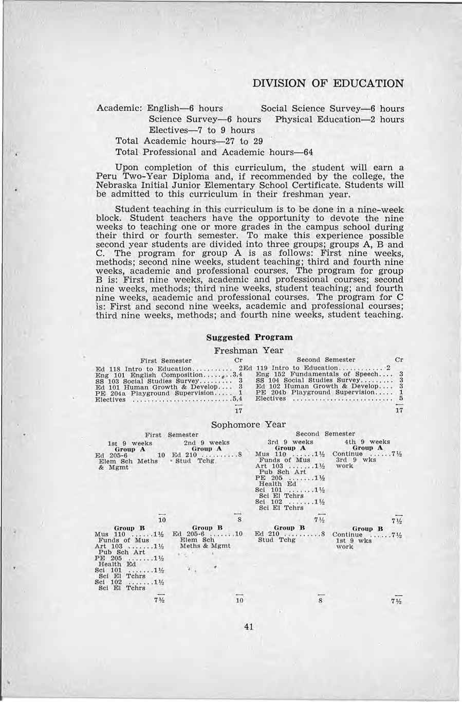 TABLE OF CONTENTS College Calend a r . . . . . . . . . . . . . . . . . . . . . . . . . . . . . . . . . . . . . . . . . . 4 State Board of Education .... . . .. . : . . . . . . . . . . . . . . . . . . . . . . . . . 5 Personnel 1953-54 6 Instructional Staff . . . . . . . . . . . . . . . . . . . . . . . . . . . . . . . . . . . . . . . . . . 6 Sponsors of Student Groups 10 Permanent Faculty Committees 10 Gen eral Information 11 Histor y . . . . . . . . . . . . . . . . . . . . . . . . . . . . . . . . . . . . . . . . . . . . . . . . 11 Purpo ses 11 Accreditation 1• • • • • • • • • • • • • • • • • • • • • • • • • • • • • • • • 11 Memberships . . . . . . . . . . . . . . . . . . . . . . . . .. . . . . . . . . . . . . . . .. 11 Location and Transportation Facilities . . . . . . . . . . . . . . . . . . . 12 Campus and Buildin gs . . . . . .......... . ......., . . . . 12 Entertainm ent, Recre ation, Social Life 14 Organiz atio ns 14 Peru: Alumni Association . .. .. .. .. .. .. . .. . .. .. . .. . .. . .. . 17 Teache~ Pl aceme nt Bure a u ....... .. . . .... , .............. 18 Memorials and Lo an Funds 18 A wards and Scholarships . . . . . . . . . . . . . . . . . . . . . . . . . . . . . . . 20 Expens es for One Ye ar . . . . . . . . . . . . . . . . . . . . . . . . . . . . . . . . . 22 Living Accommodations 22 Student H ealth Service . . . . . . . . . . . . . . . . . . . . . . . . . . . . . . . . . 24 Registration F ees 25 Specia l Fees 25 Ref u nd to Stud e nts Who Withdraw from School . . . . . . . . . . 26 Ac a demic Regulations . . . . . . . . . . . . . . . . . . . . . . . . . . . . . . . . . . . . . . 27 Admission ........ : . . . . . . . . . . . . . . . . . . . . . . . . 27 Cred_it for Educational E xperie nce s in the Armed Service . 28 Classification of Students 28 Numbering of Cour se s . . . . . . . . . . . . . . . . . . . . . . . . . . . . . . . . . . 28 Student Load • 28 Change in Program an d Withdrawal Procedure 29 Attend ance . . . . . . . . . . . . . . . . . . . . . . . . .. . . . . . . . . . . . . . . 29 Resident Att en dance : 29 Gr adi n g System 29 Scholarship Stand ards ........ . .. . .. .' . . . . . . . . . . . . . . . . . . . 30 Scholastic Honors 30 Pro gra m of In str uction ... . ...... . . .. ........ . . .......... . .. 32 Curriculums 32 Selection of a Curriculum 32 Degre e M ajors and Minors 32 Pre-Prof ess ional Curriculums . . . . . . . . . . . . . . . . . . . . . . . . . . . 34 Junior Terminal or Vocational Curriculums . . . . . . . . . . . . . . 34 D egrees, Diplomas, Certificates .. .. .... , . . . . . . . . . . . . . . . . . 35 G e ner a l De gree Requir eme nts . . . . . . . . . . . . . . . . . . . . . . . . . . . 36 Admission to T eac her-Pr e paration Curriculums 38 Divi s ion of Education 39 Division of Fin e Arts . . . . . . . . . . . . . . . . . . . 50 Divi s ion of Health and Phys ical Educ ation . . . . . . . . . . . . . . . 56 Division of Langu age Arts . . . . . . . . . . . . . . . . . . . . . . . . . . . . . . 61 Divi sio n of Practical Arts 71 Divisi on of Science ai;i d Mathematic s 82 Division of Soci°al Studies . . . . . . . . . . . . . . . . . . . . . . . . . . . . . . . 93 Extension Services · · 100 Study-C enter and Correspondence Course 100 Application for Corre spo ndence Cours e 102 Degrees and Diplomas Granted · 103 Index 105