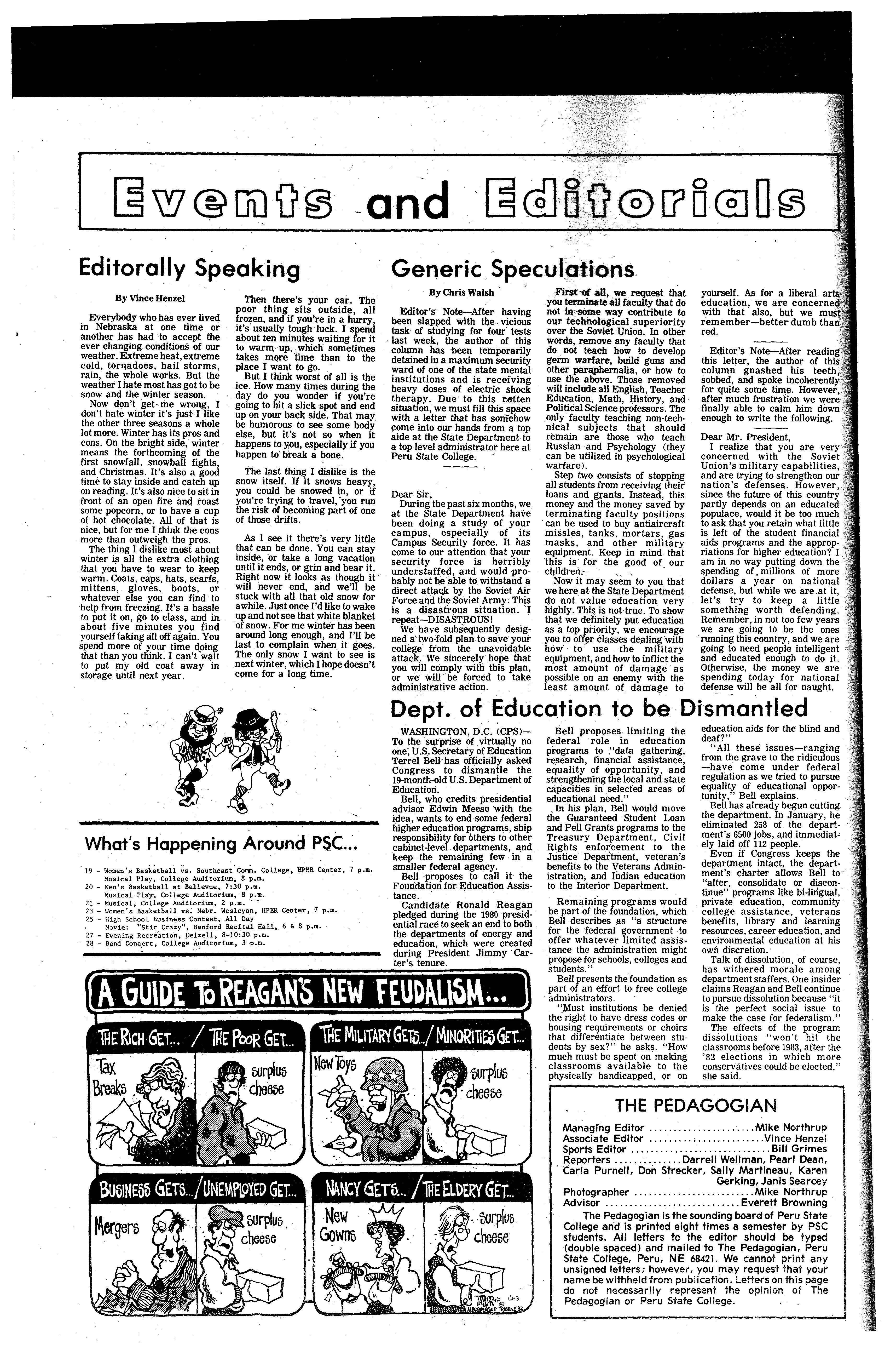 The Pedagogian Is the sounding board of Peru State College and is printed eight times a semester by PSC students. All letters_ to the editor should be typed (double spaced) and mailed to The Pedagogian, Peru State College, Peru, NE 68421. We C<Jnnot print any unsigned letters; however, you may request that your name be withheld from publication. Letters on this page do not necessarily represent the opinion of The Pedagogian or Peru State College.