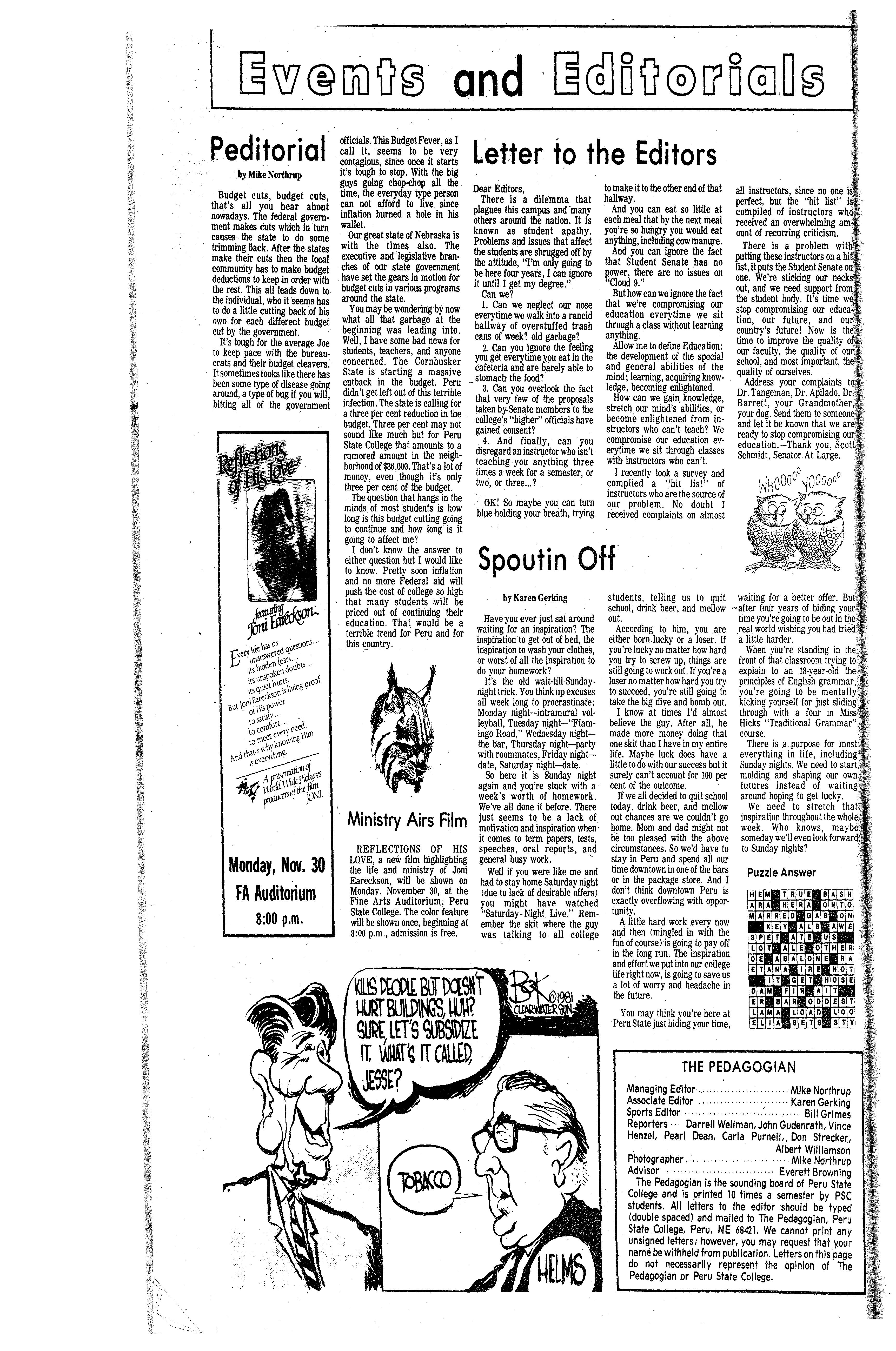 The Pedagoglan is the sounding board of Peru State College and Is printed 10 times a semester by. PSC students. All letters to the editor should be typed (double spaced} and mailed to The Pedagoglan, Peru State College, Peru, NE 68421. We cannot print any unsigned letters; however, you may request that your name be withheld from publication. Letters on this page do not necessarily represent the opinion of The Pedagoglan or Peru State College.