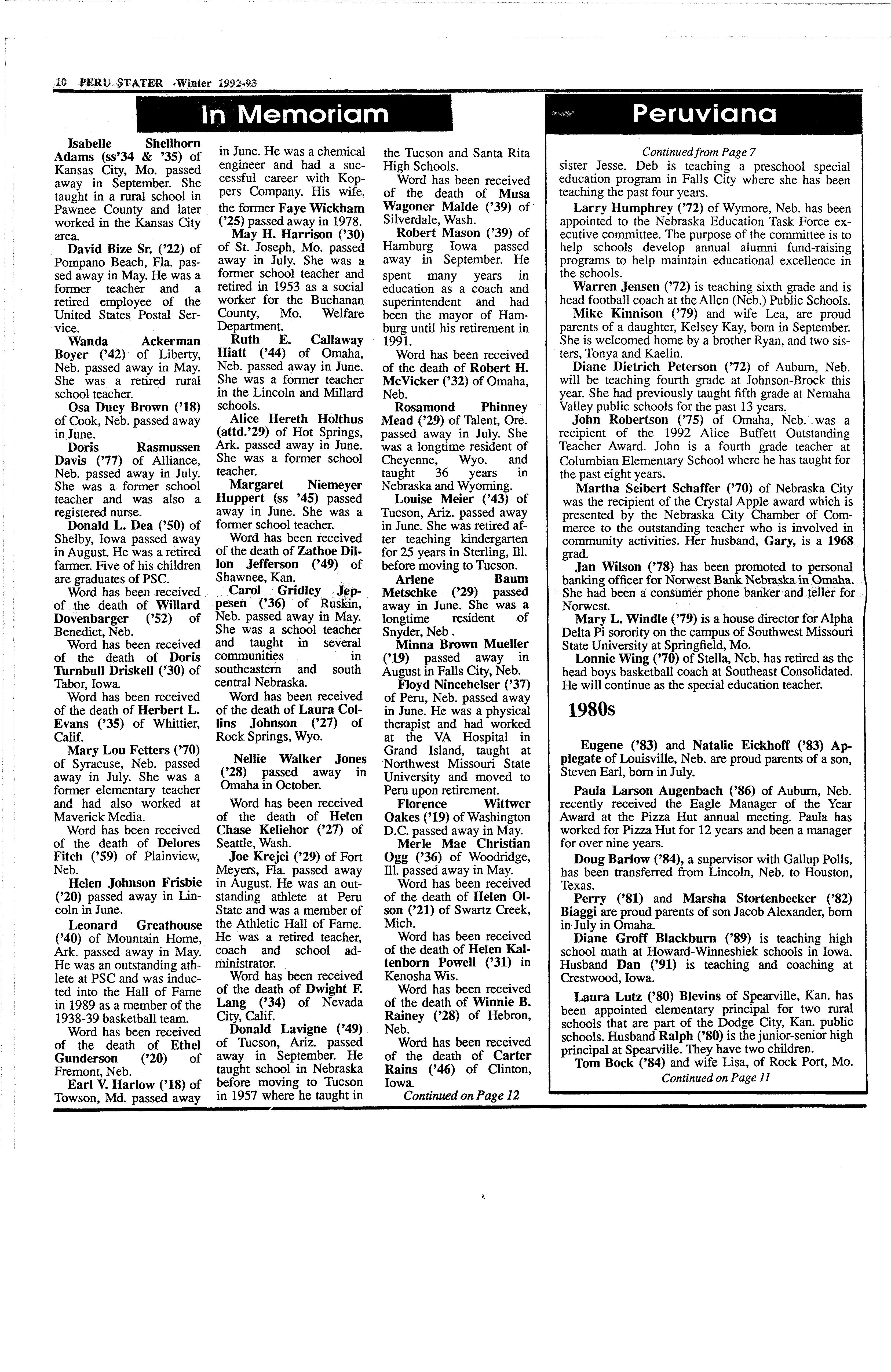 "We know that Peru State have contributed in some hasplayedanimportantpartin special, important way to the lives of many very sue- his/herprofession,community, ccssfulpeople, and wewantto familyorstudents. recognize those Peruvians for In fact, if you aren't sure their contributions to their that the person you have in work and to society," mind qualifies, send in the inPresidentBumsexplained. formation and the college will