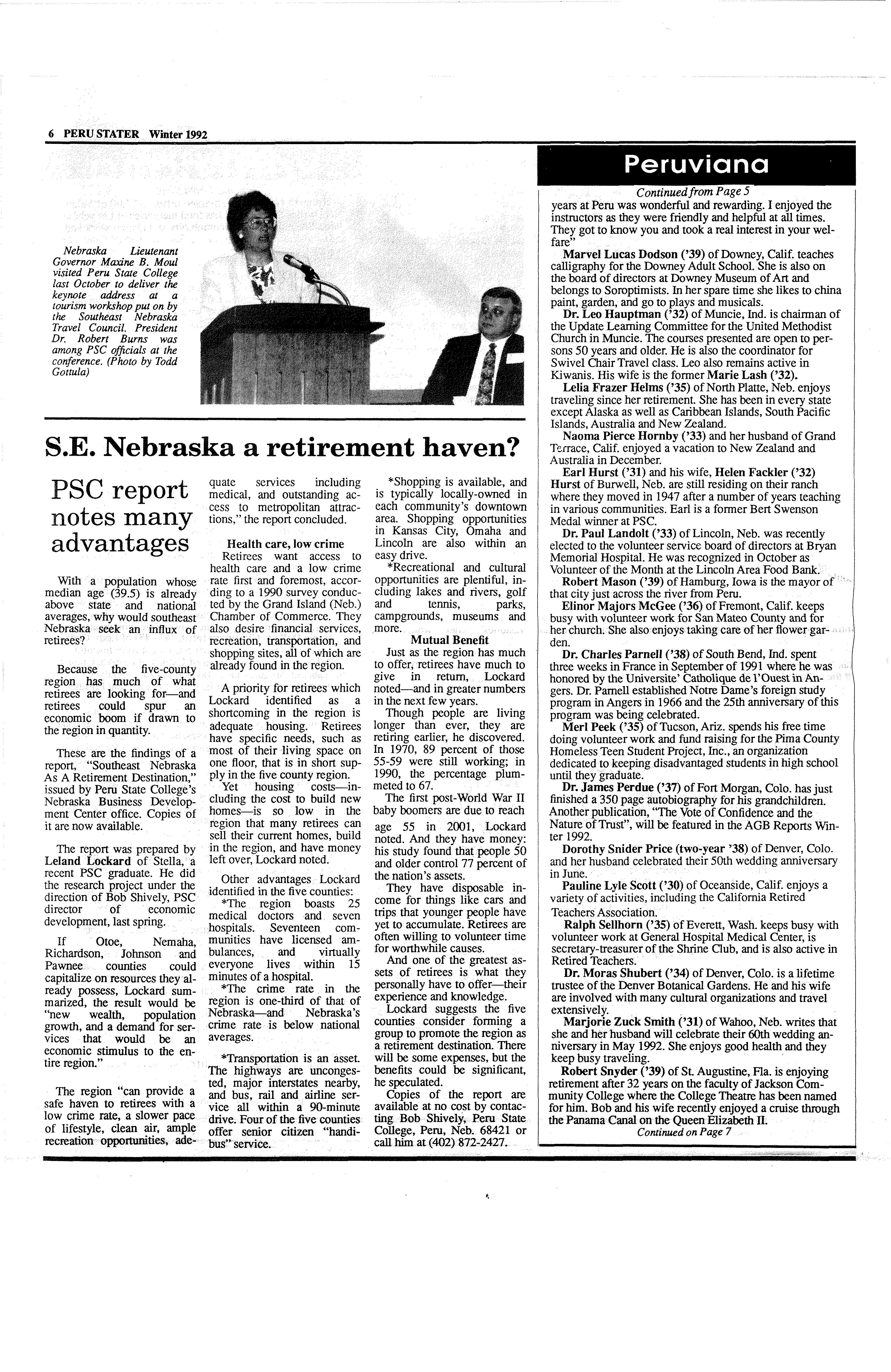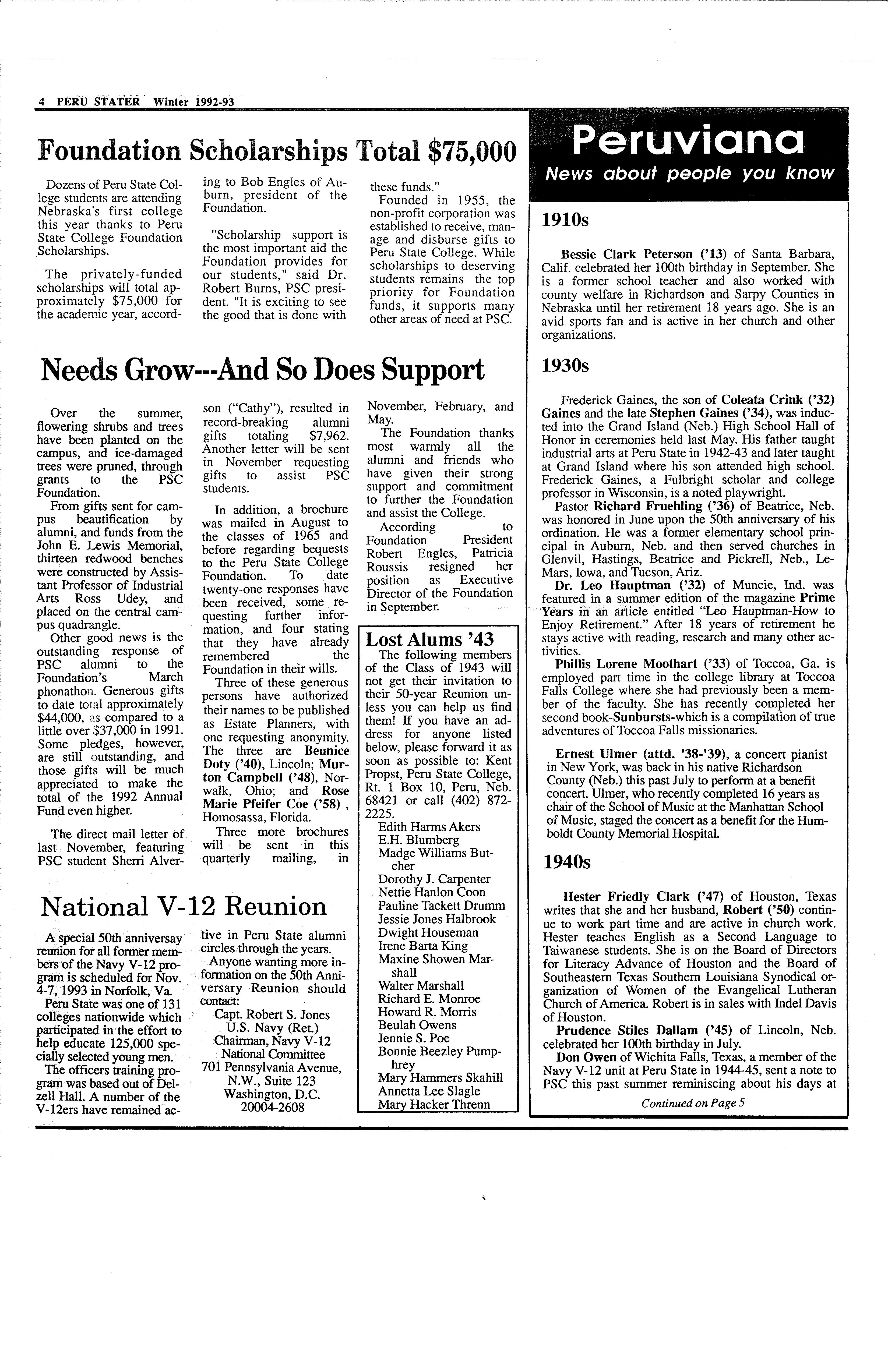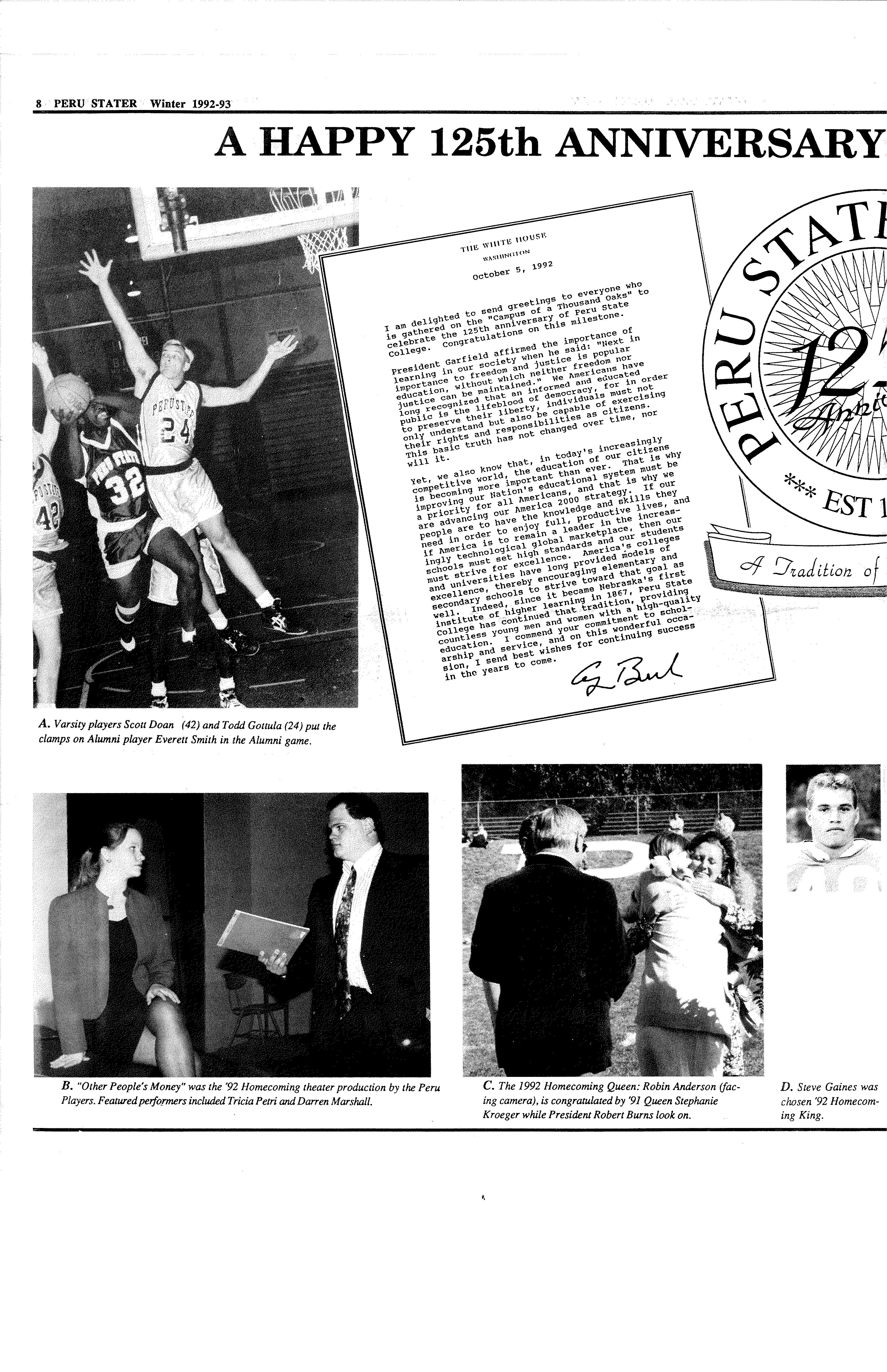 Anew program dcsigned·to some way fortheirimportance discover, record and celebrate to Peru State. This may have the achievementsofPeru State been done with the naming of. College alumni and former a building on the campus, a faculty/staff is beginning this Distinguished Service Award, year-our 125th Anniversary Hall of Fame, a scholarship Year. endowment, or in some other President Robert Bums has fashion.