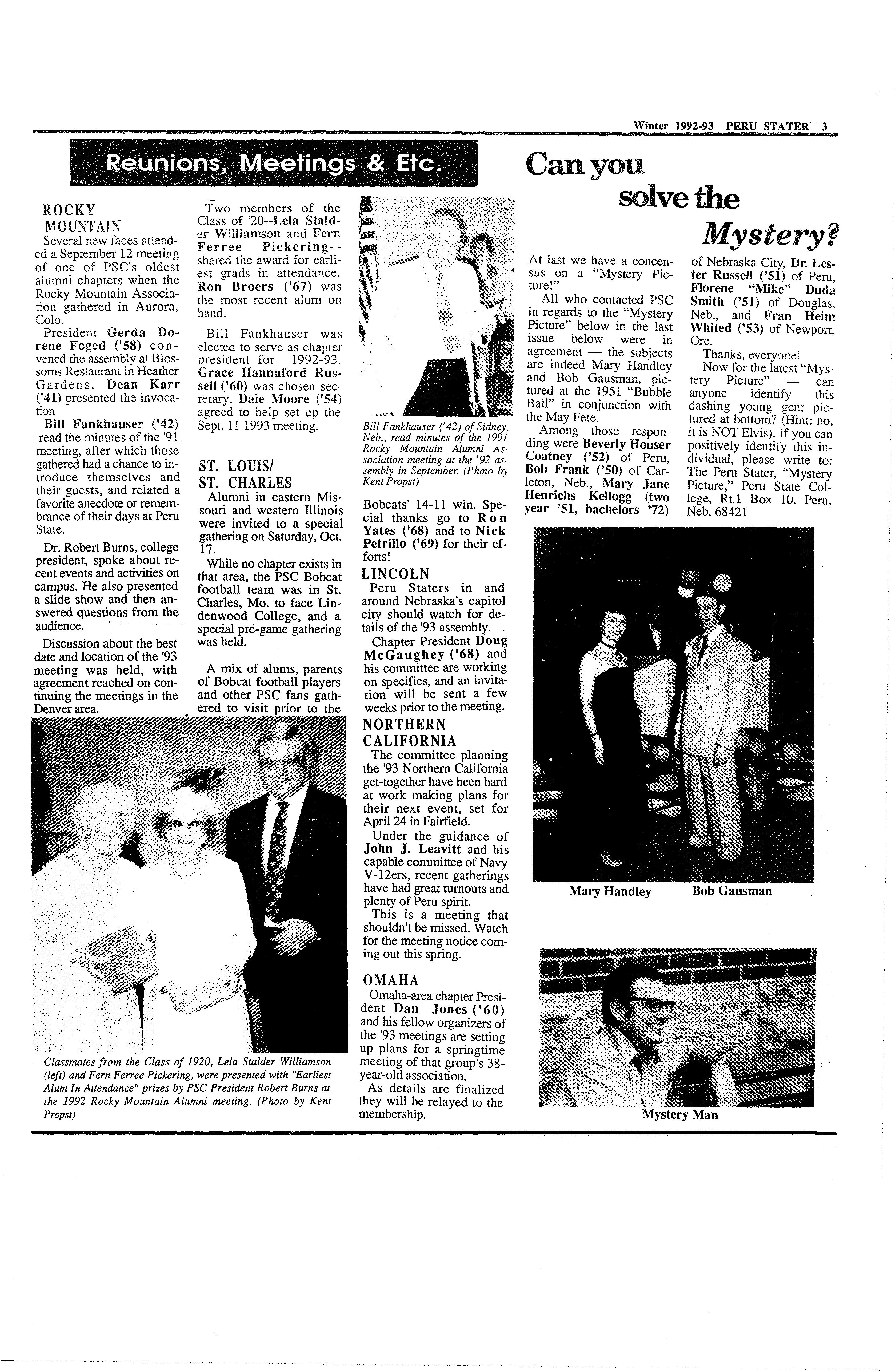The Rocky Mountain Jerald Hill ('81), Don Alumni Association of Peru Hdl ('81), Alvin ('81) and. State College met on Sept. 7, Renee Patsch (attd. '79-'80) 1991 in Northglenn, Colo., Holder, Perry Scott ('83), with 32 in attendance. Dr. Johnny Stewart ('81), Jessie Dale Moore ('54) opened the '79-'81), Terrell meeting followed by Dean Wdhams ( 84), and Albert Karr ('41) offering an in- Williamson (attd. '79-'81). vocation. The group plans another