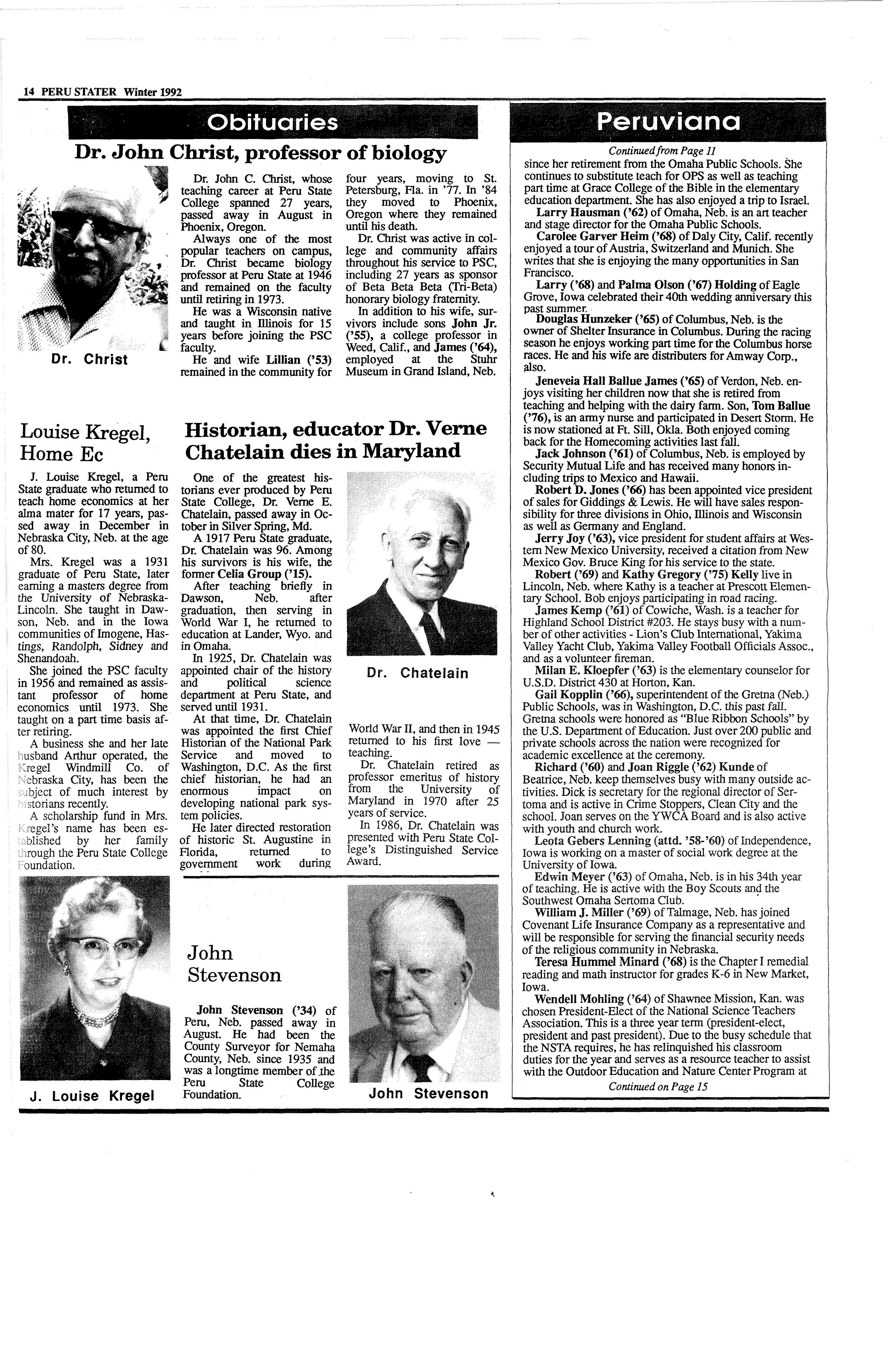 announced the "PrideofPeru" "We really are excited to program, and with this edition leam also about those who of The Peru Stater calls for have not yet been recognized your help in making the publicly for their importance programasuccess. or their contributions," said "Pride of Peru" is meant to Bums. "I think some of the identify the many outstanding best stories are about those alumni and foimer facu1ty or who haven't held high public staff of the college who have or corporate office but have achieved special statusihtheir been important in their inprofessionsor intheirlives. fluenceasteachers, smalltown Itwill gatherinfonnationon orruralcitizens, oras onewho those who have served with helpedotherpeople." distinction, those who have ThequaJificationsfor"Pride achieved great things or high of Peru" are simple. The perofficc, those who have given son listed (living or dead) their lives and efforts to their must have a clear connection communities and those who with Peru State College simplyhave been important in (alumni, faculty, staff, long thelivesofthosearoundthem.. time supporter, etc.) and must