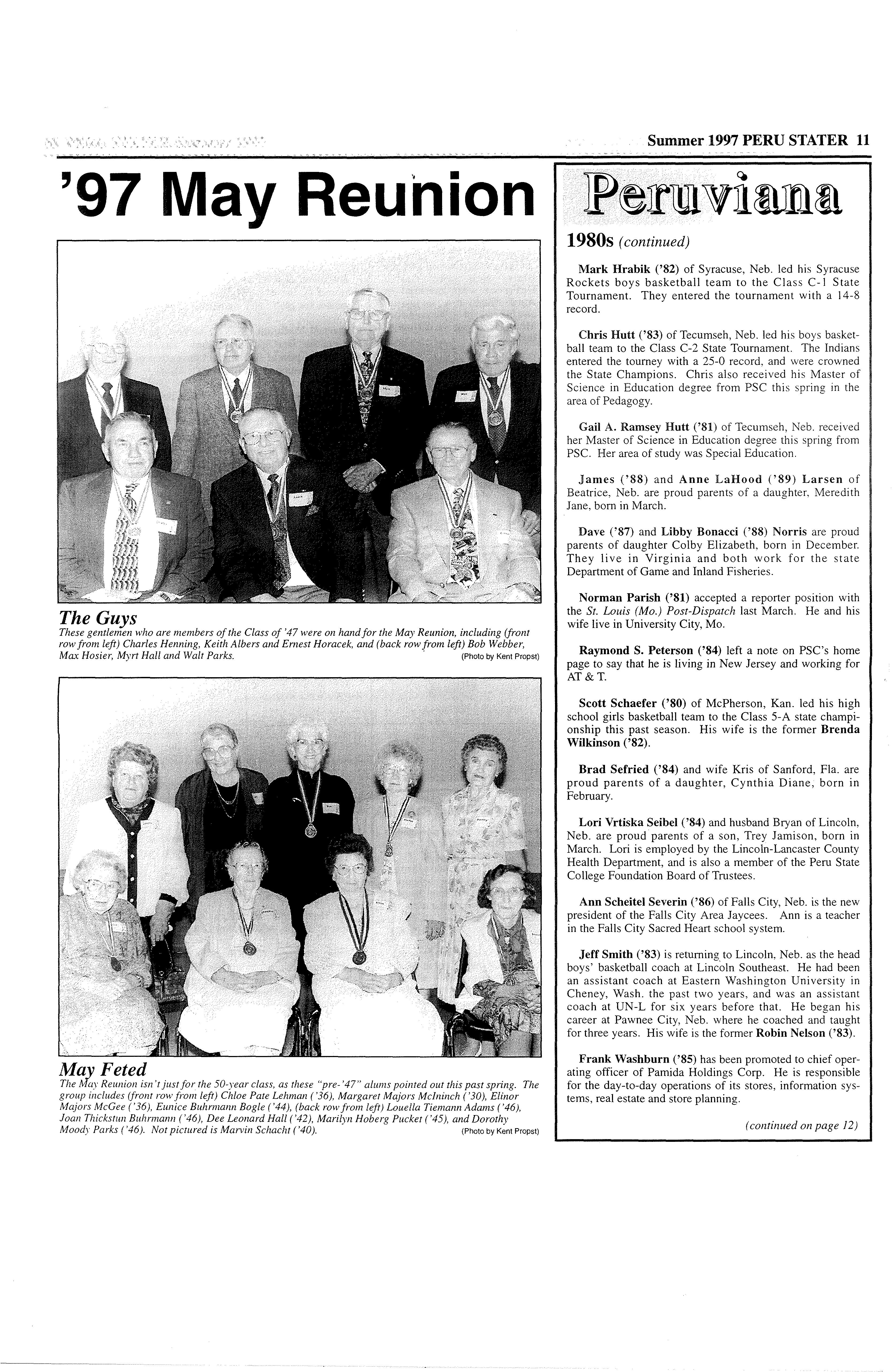 All Peruvians from class years 1947 - this year's honored class - to 1927 will be invited. A special invite will go out to the 49-year Class of '48 in case they want to come back and see the folks they looked up to as PSC juniors. Friday activities include a campus tour, the ever-popular President's Reception, the May Reunion Banquet and program to follow. Saturday highlights feature breakfast,· 1997 Commencement exercises, luncheon, and a driving tour of the campus and community.