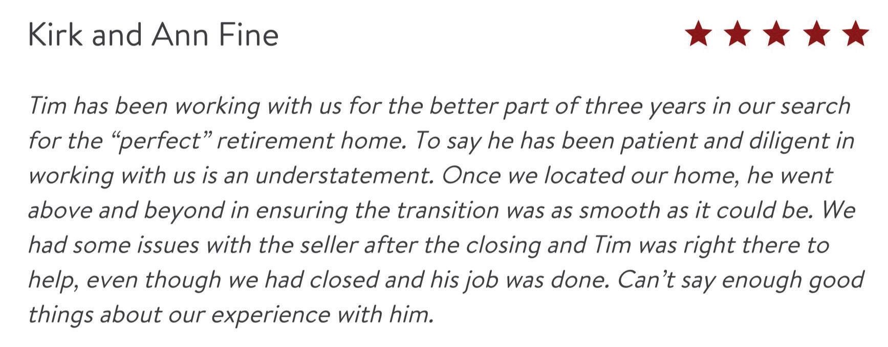 “I am a sellers agent and recently worked with Tim. What a positive, professional experience it was for me and for my seller. Tim is very professional and communicated so well that it made the transaction so much smoother for both buyer and seller. Tim is also extremely knowledgeable and his buyer benefited from that knowledge during negotiations in the transaction. I highly recommend Tim to anyone needing an experienced professional to handle their real estate needs.”