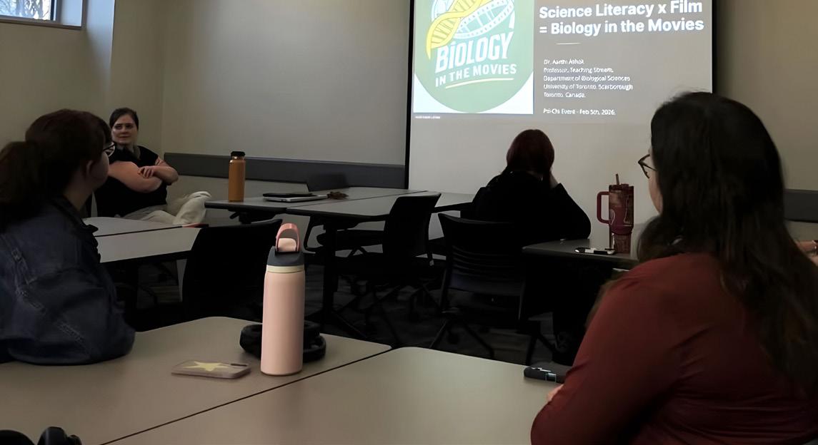 of Toronto-Scarborough’s (UTSC) Chapter, where students learned about how psychology and scientific literacy could be applied to films. Dr. Chase O’Gwin, professor at NWMSU, gave a lecture about theories on the psychology of horror films. Dr. Aarthi Ashok, professor at UTSC, lectured on the importance of scientific literacy in media and showcased her in-progress database for documenting the accuracy of scientific claims in films. Following